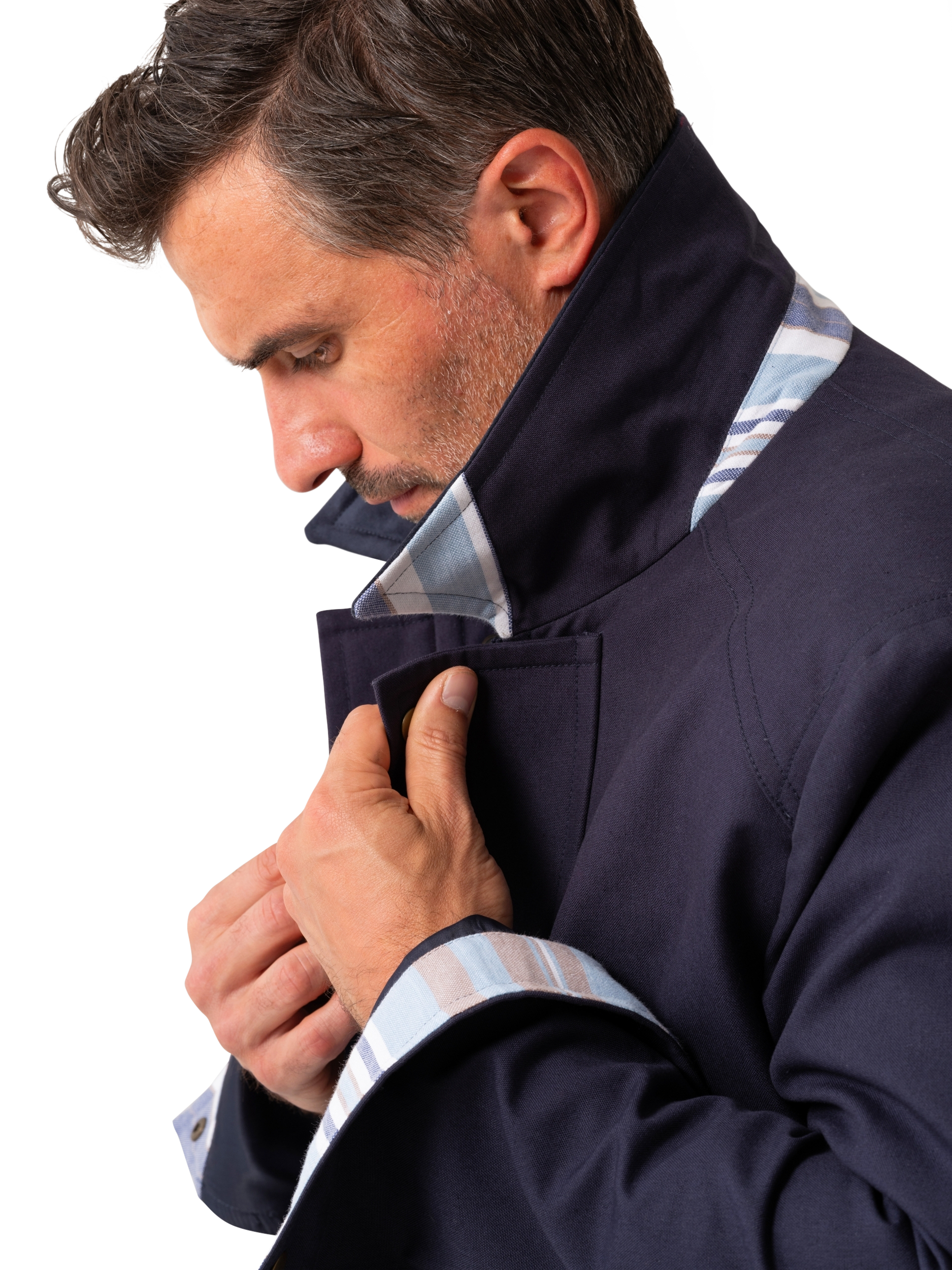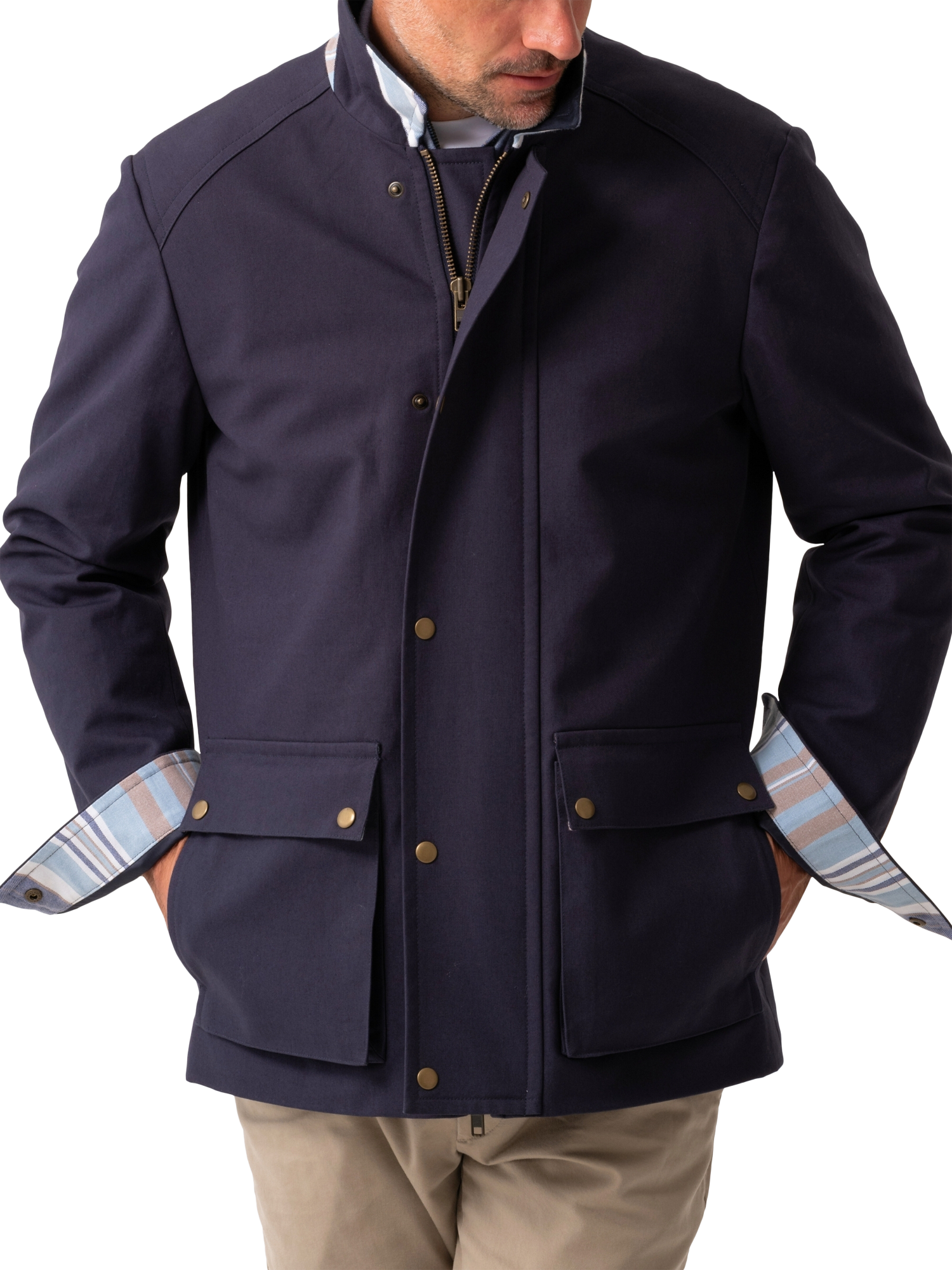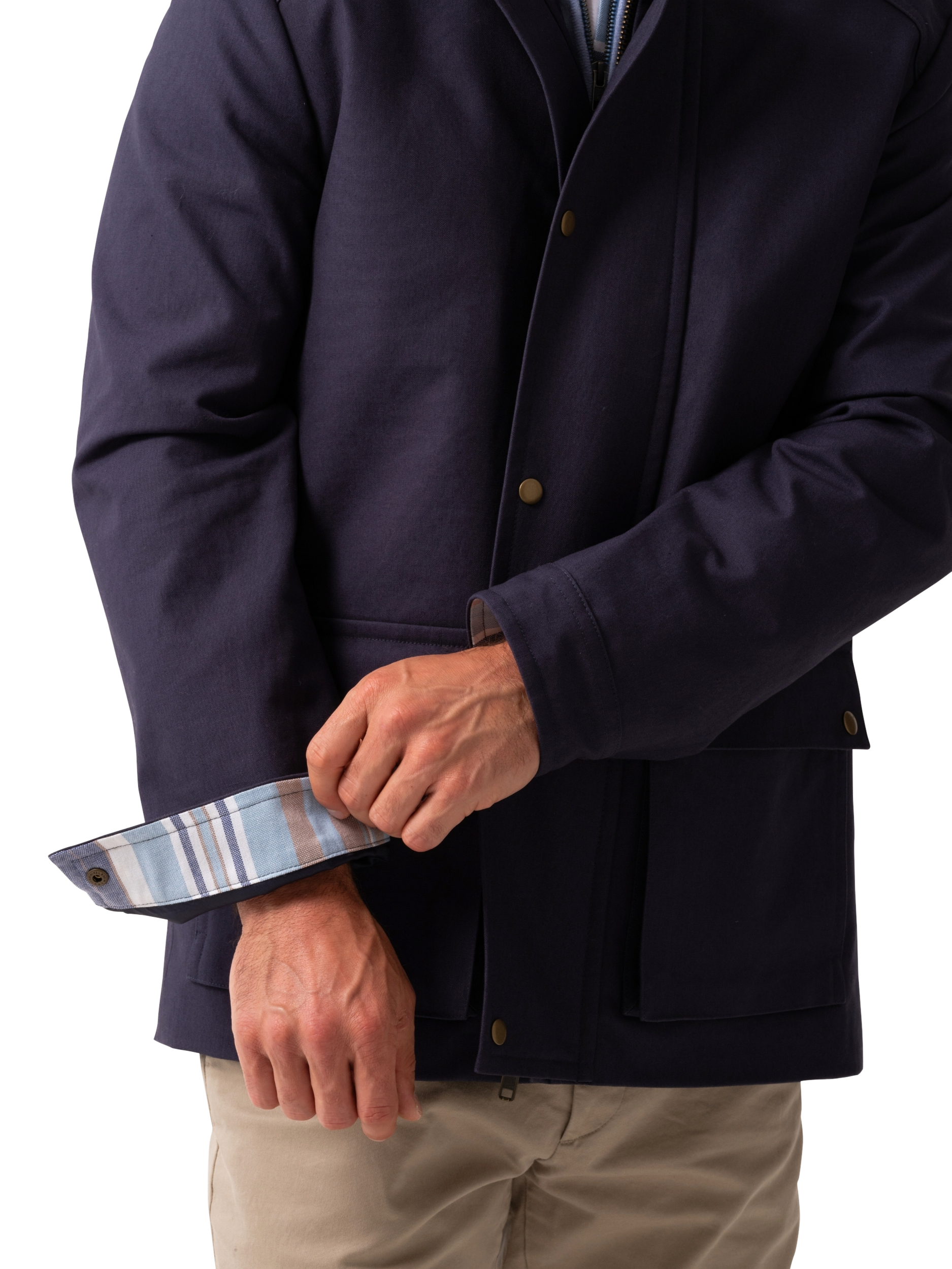 A semi water resistant jacket made from heavyweight cotton and detailed with two convneient patch pockets. This outerwear piece also includes subtle detailing inspired by the authentic Kenyan Kikoy fabric under the pocket flaps, collar and cuffs.
