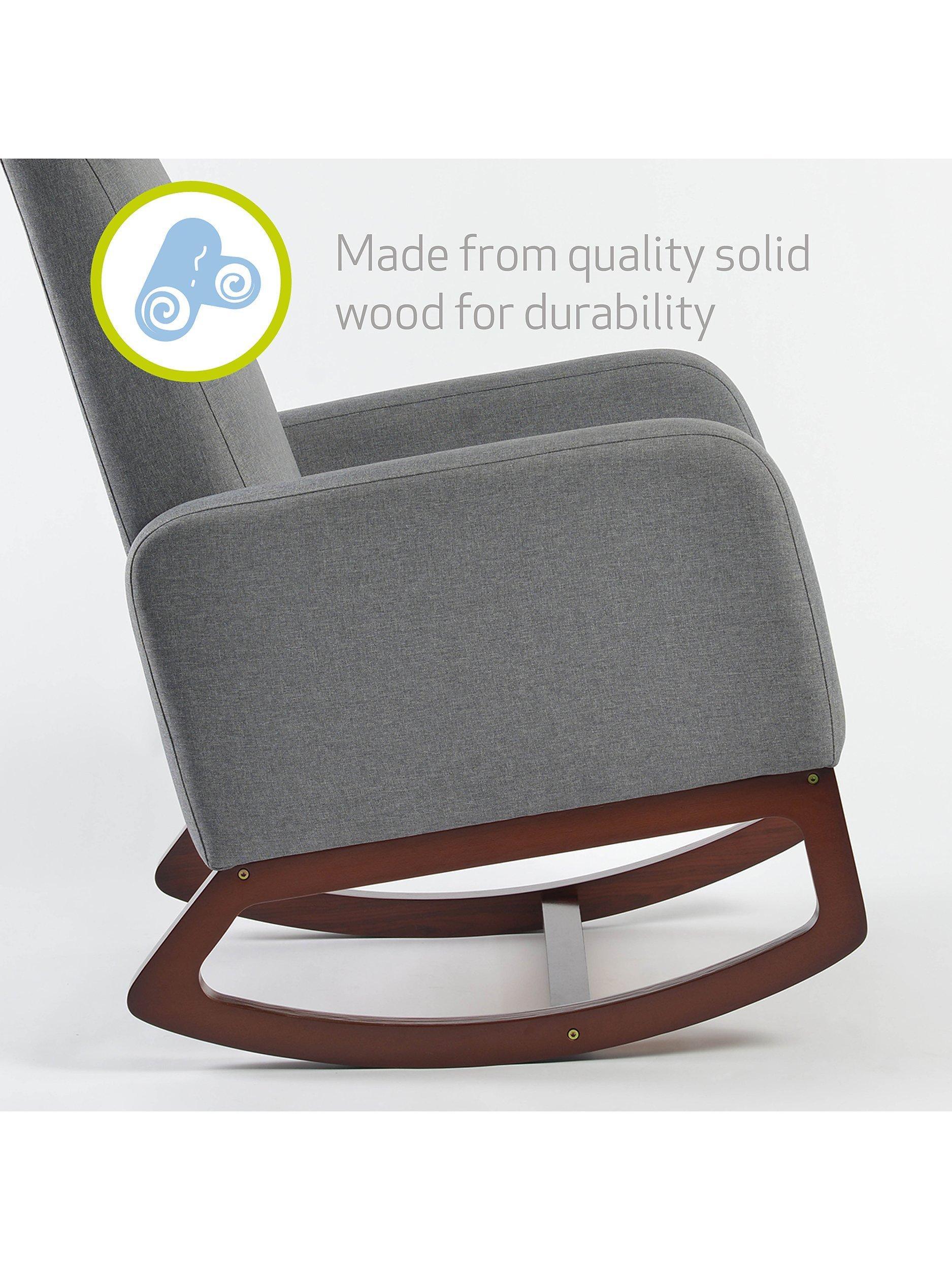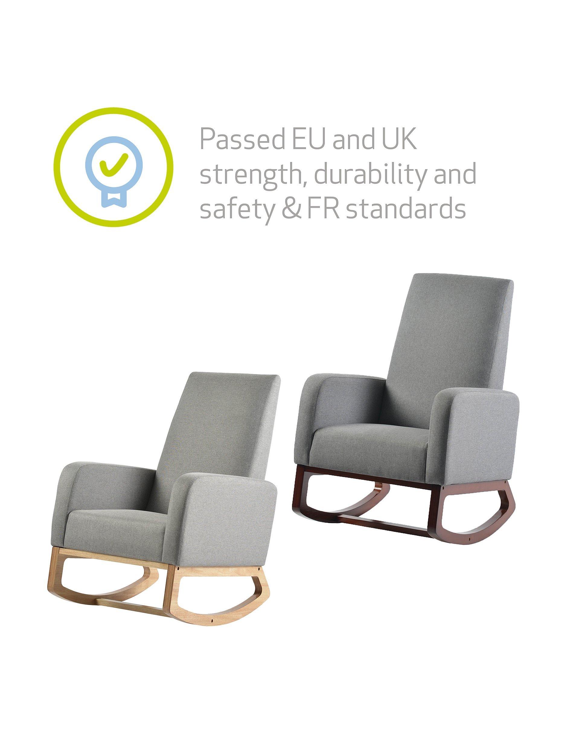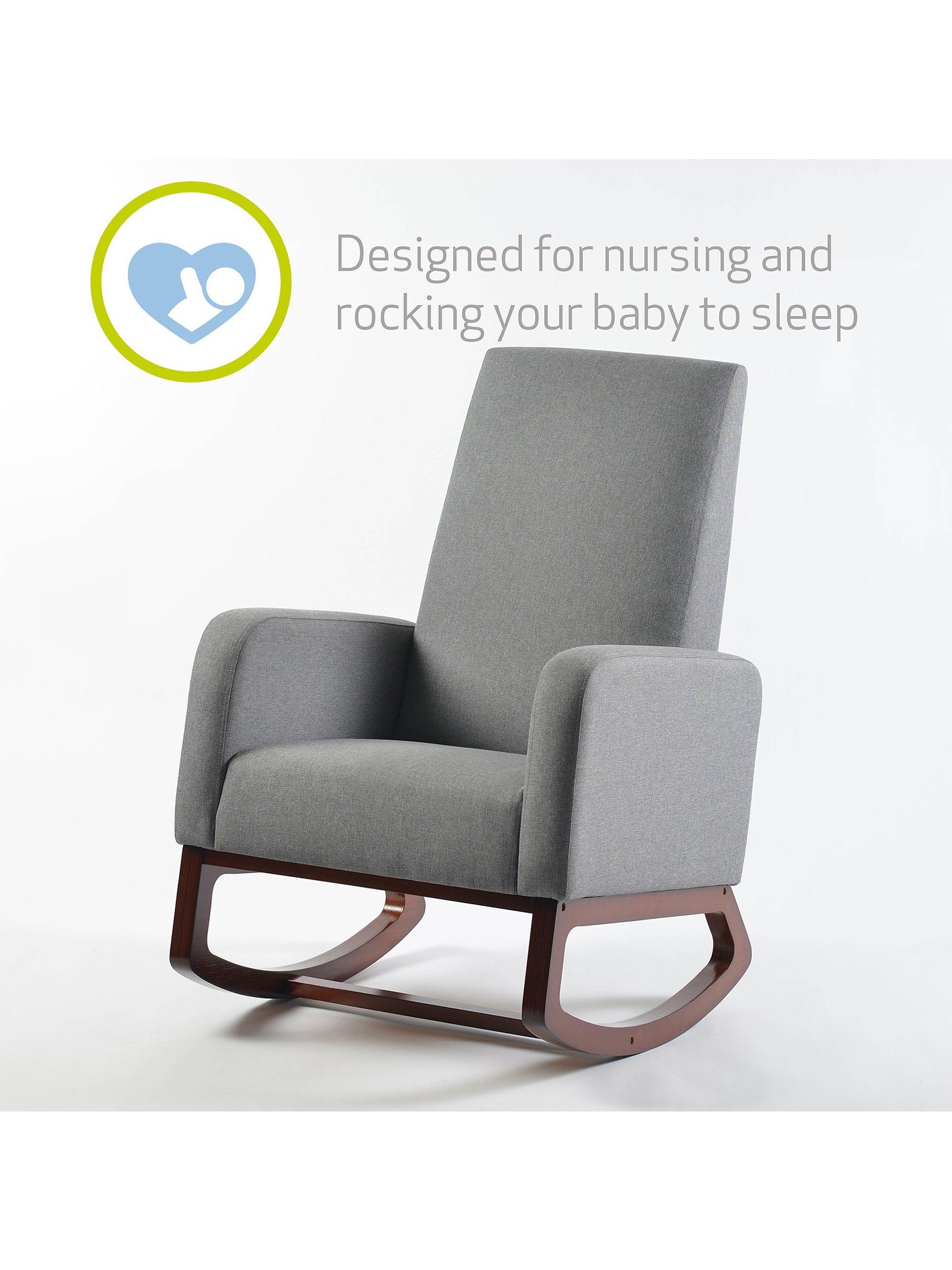 This sleek and contemporary rocking nursing chair features a space-saving flat front leg design, making it perfect for smaller nurseries. Its tilted, padded backrest provides both comfort and support for you and your baby during feeding or relaxation.