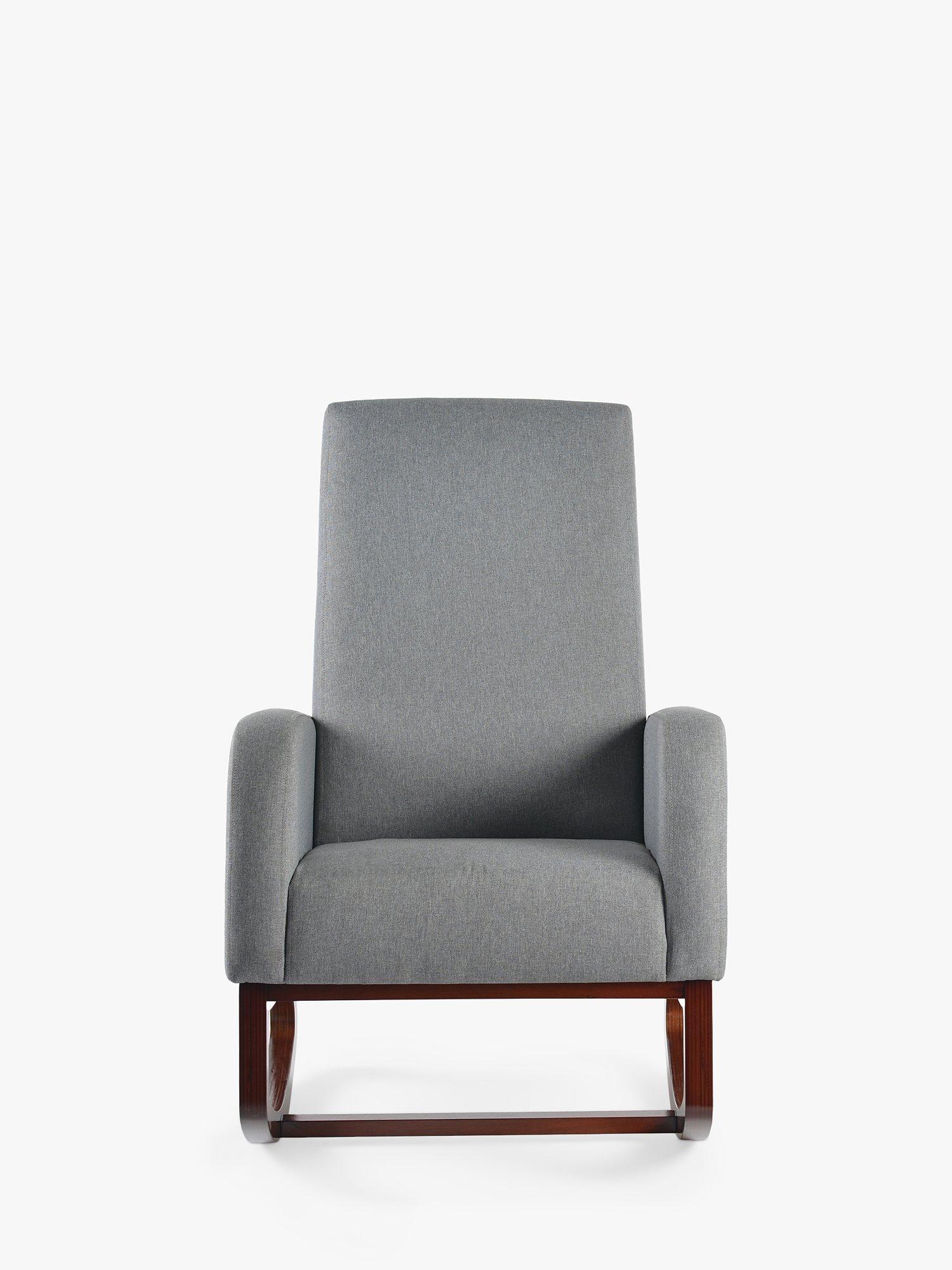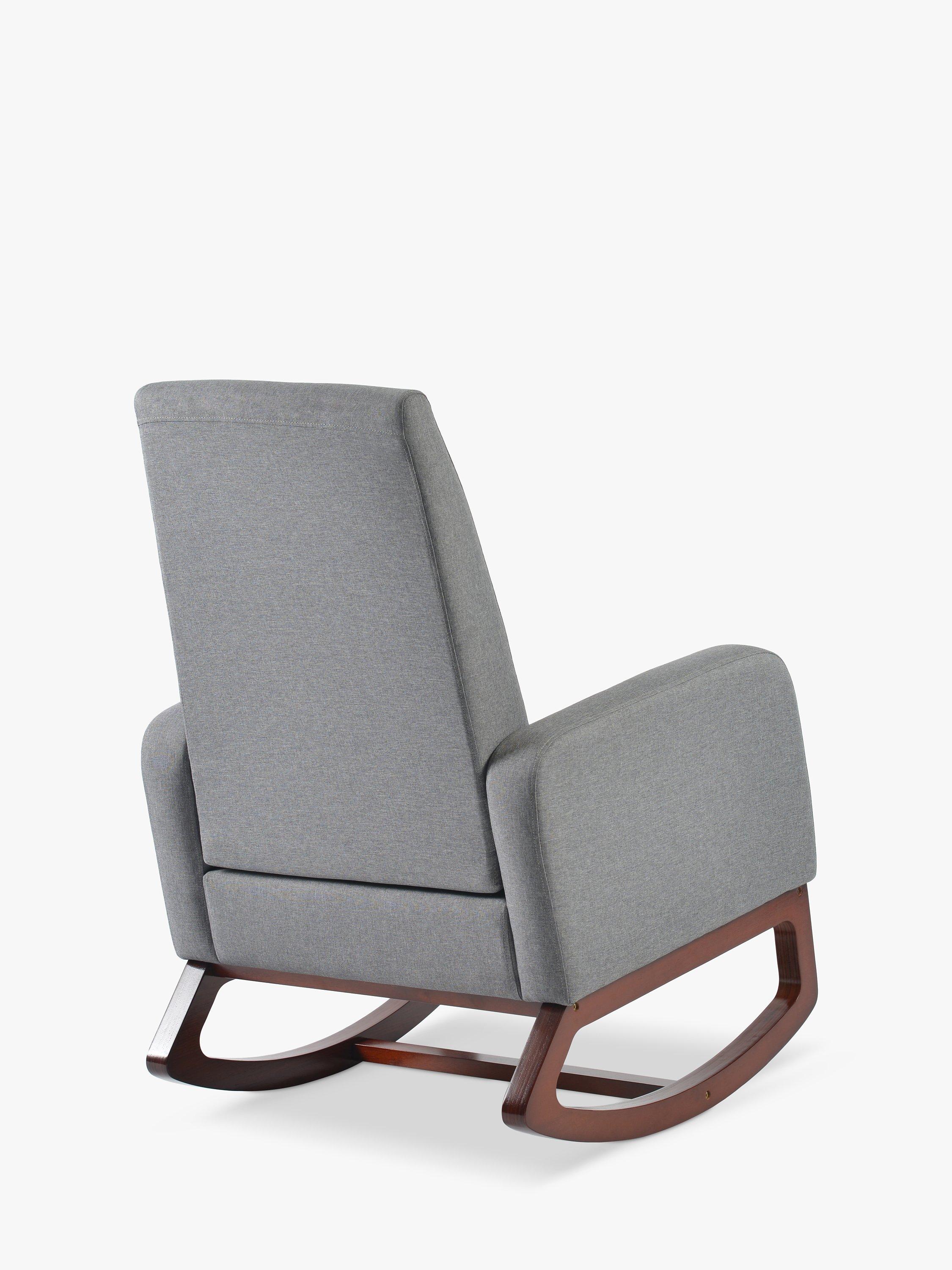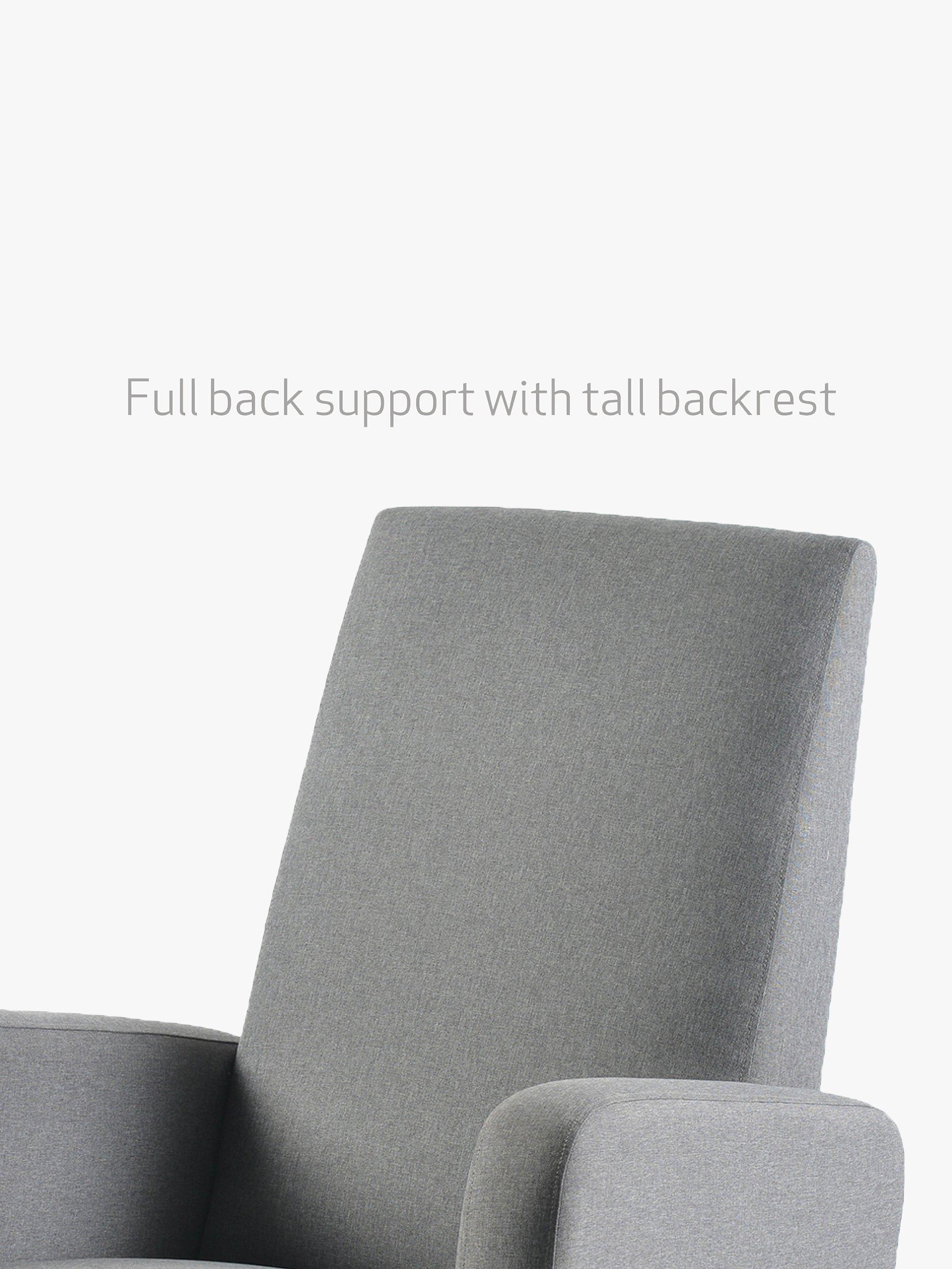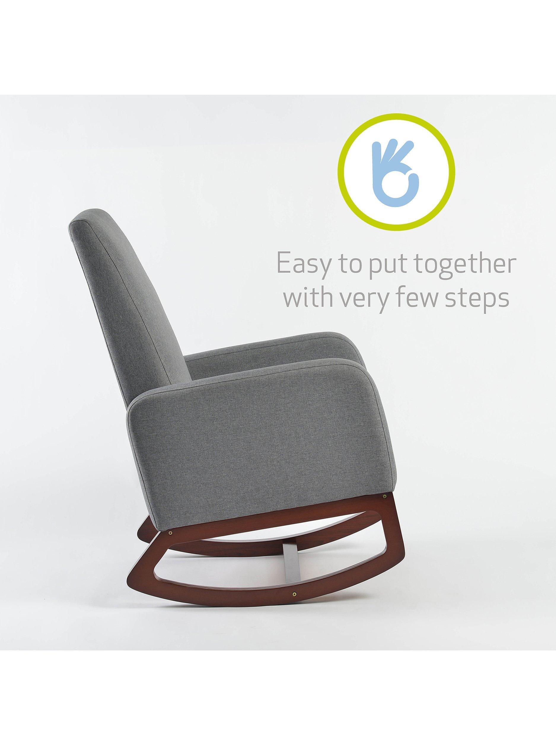 This sleek and contemporary rocking nursing chair features a space-saving flat front leg design, making it perfect for smaller nurseries. Its tilted, padded backrest provides both comfort and support for you and your baby during feeding or relaxation.