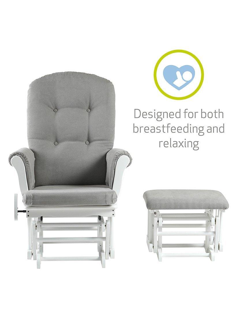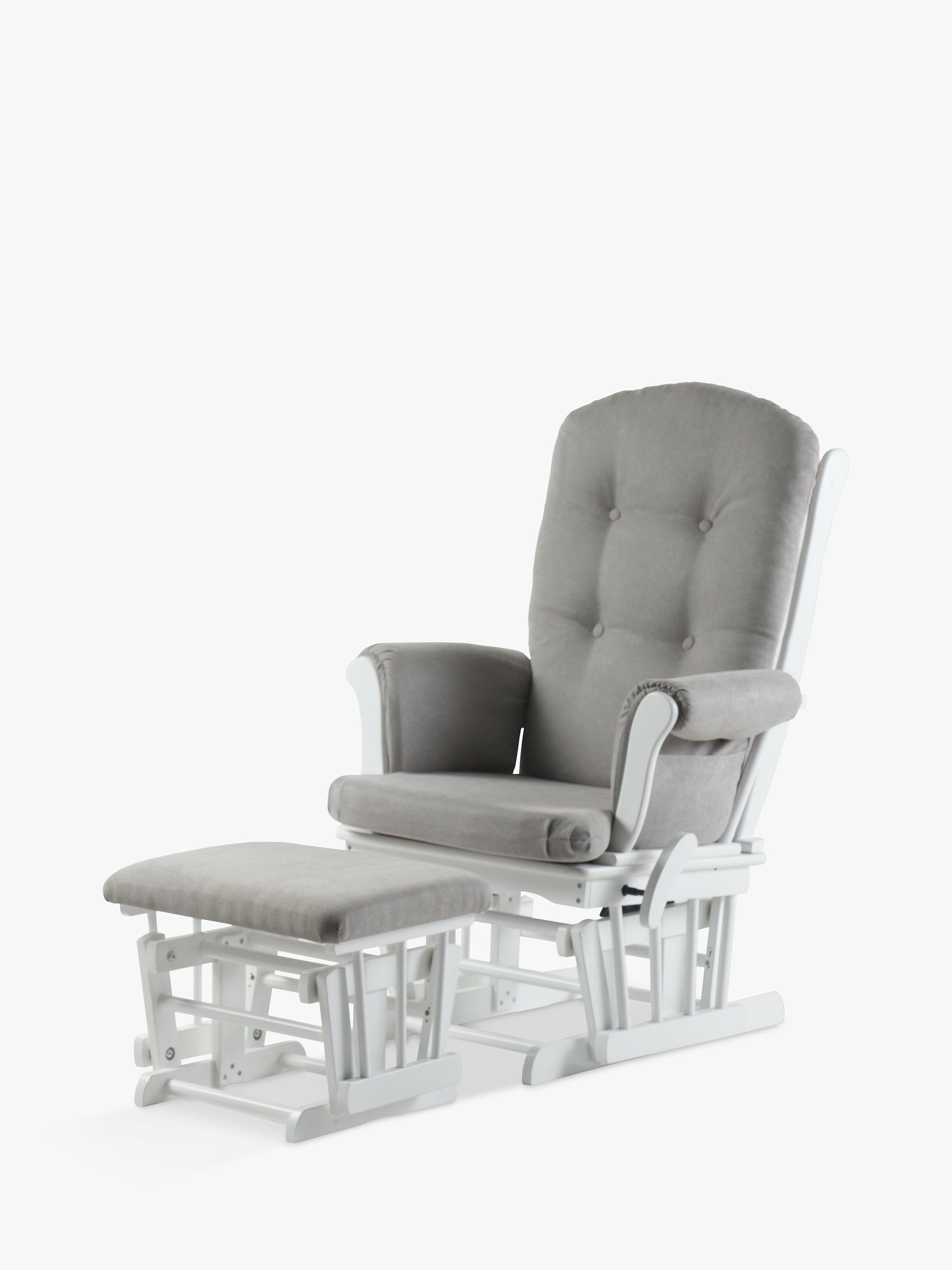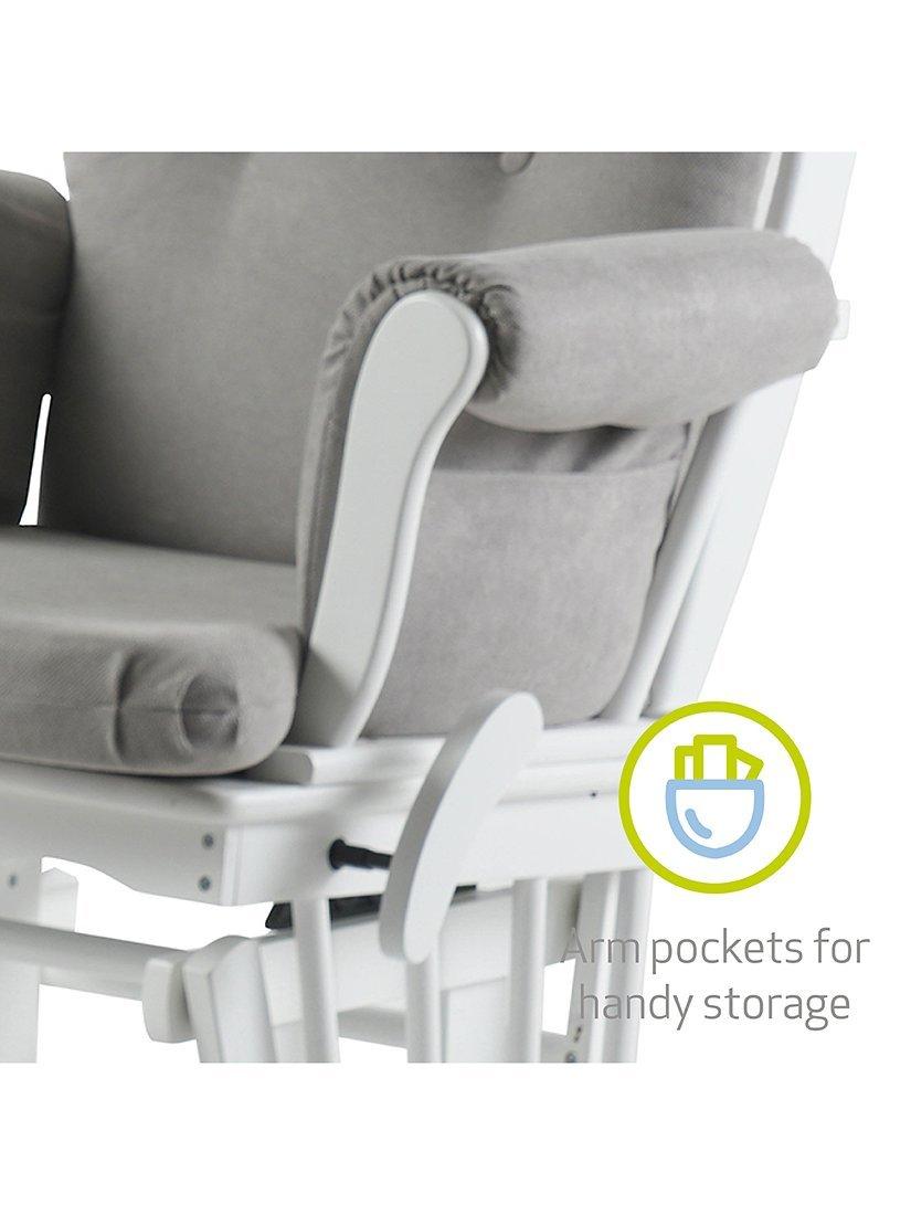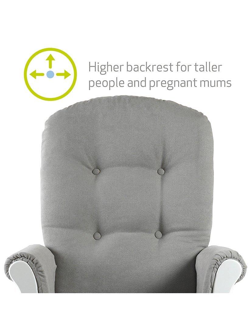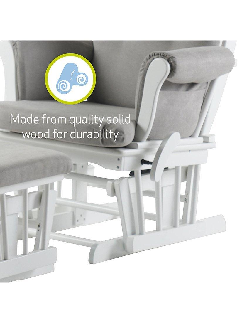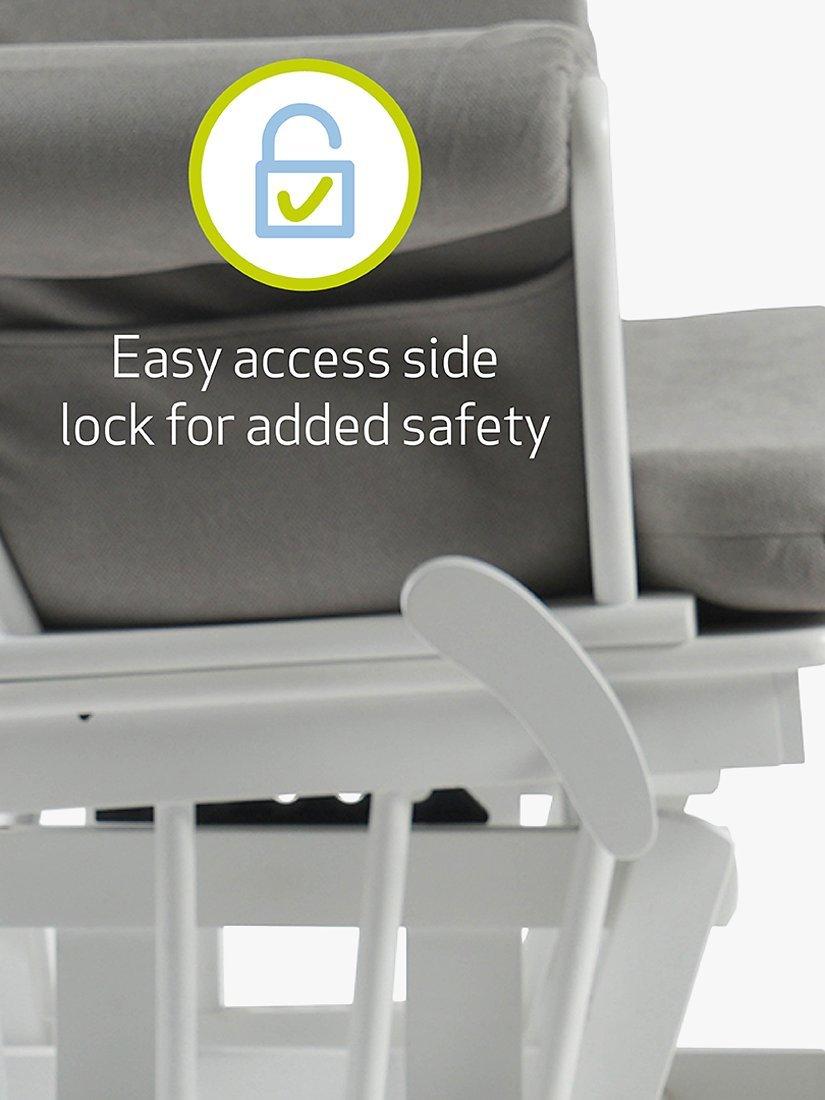 The Kielder Glider Nursing Chair provides exceptional comfort with soft-touch fabric and hand-washable cushions making cleaning easy. Designed to soothe, it features a gentle rocking motion and a side-locking mechanism for enhanced safety. The durable glider chair, made from premium solid wood, includes a matching footstool and boasts a tall backrest for optimal support - perfect for breastfeeding, nursing, or simply relaxing.