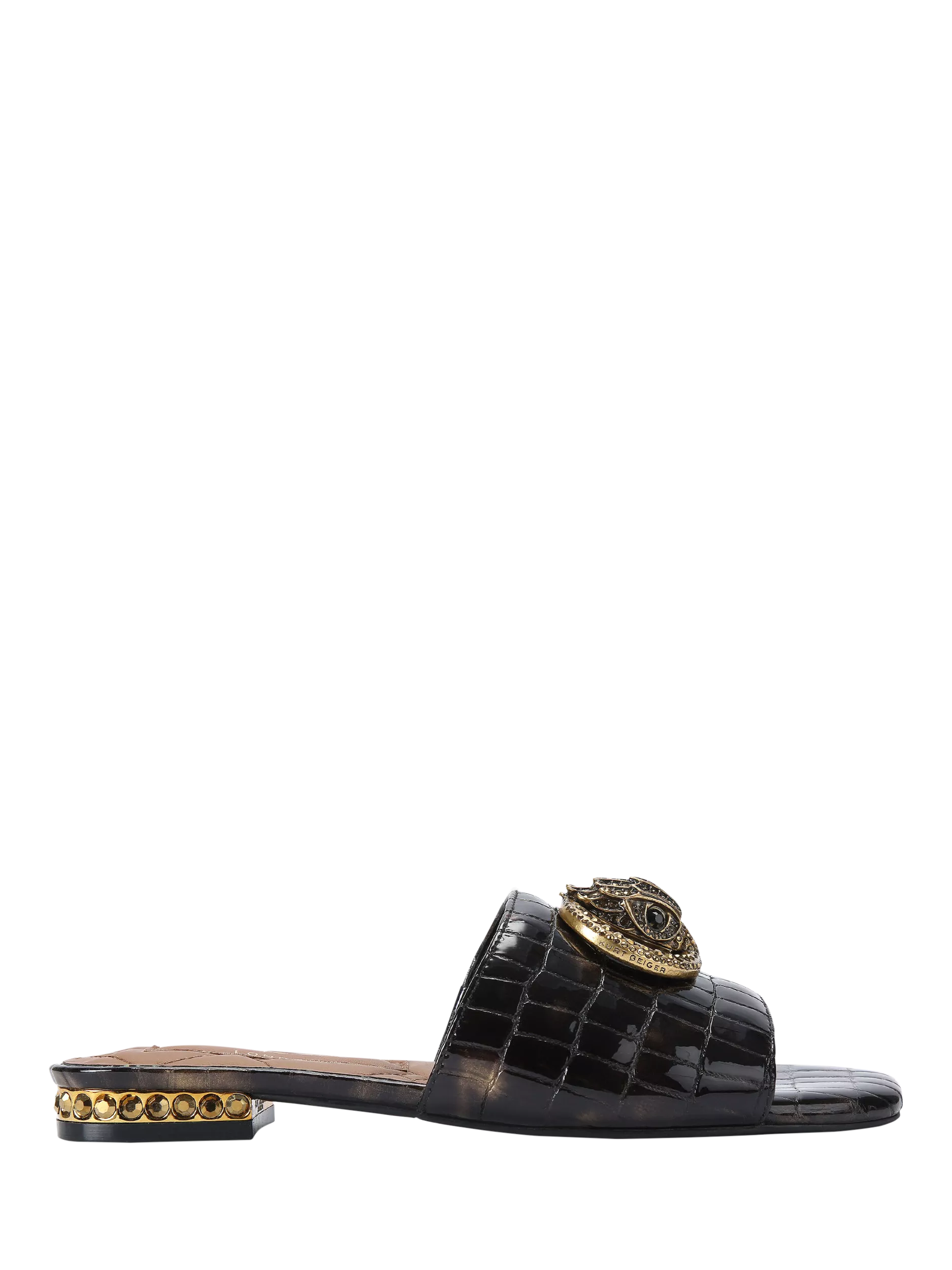 This Kurt Geiger London Chelsea Flat Sandal is a slip-on style with a snake embossed strap across the foot. There is an antiqued brass buckle and eagle head embellished with crystal on top of the toe strap. The low heel is also embellished with crystals.