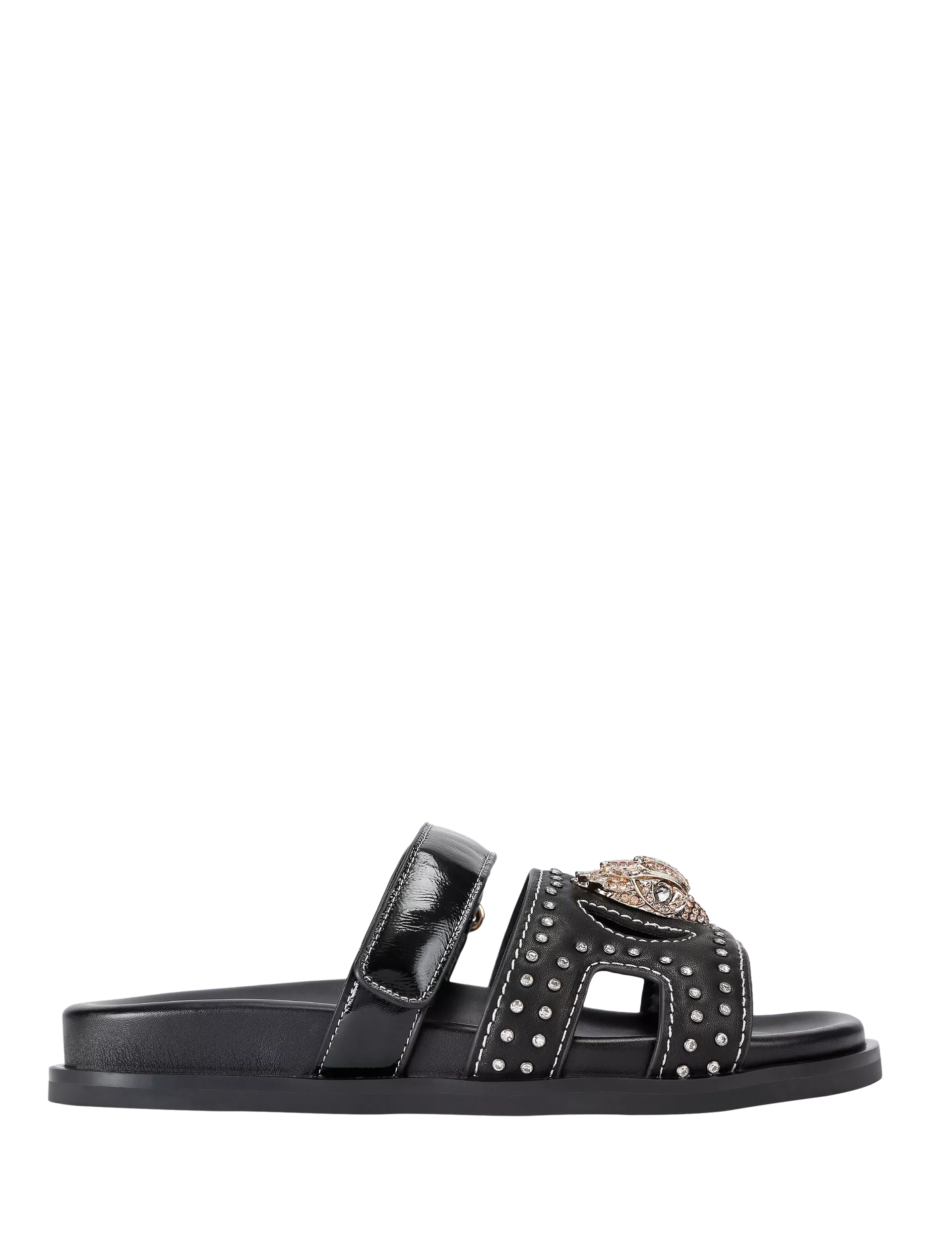 This Eagle Cut-Out Sandal from Kurt Geiger London is crafted from black leather. It has a thinner Velcro strap across the foot and a wide strap across the toe with crystals. The strap also has a gold crystal-embellished eagle head.