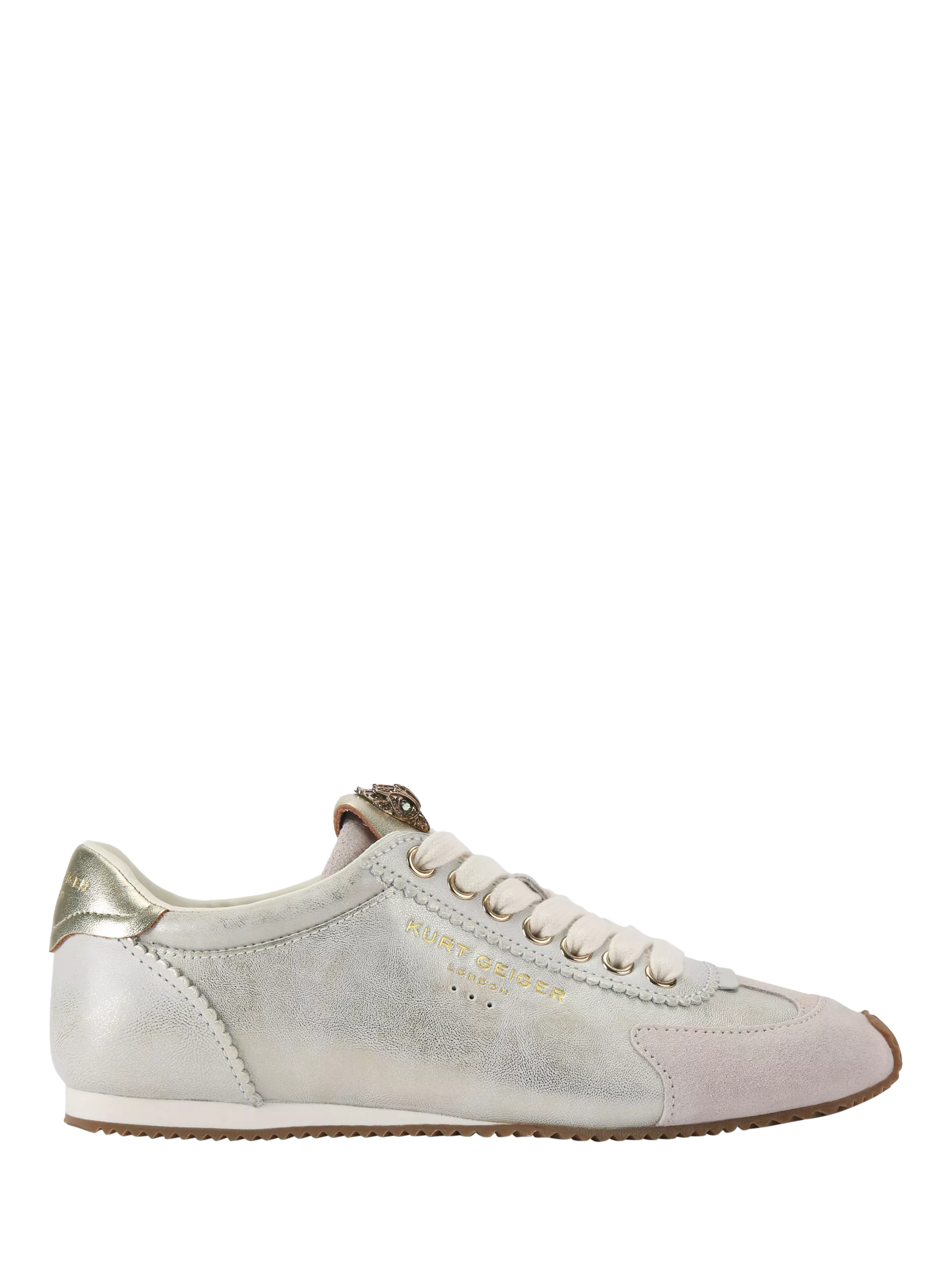 A favourite for off-duty days, this pair of trainers from Kurt Geiger London is made with metallic effect suede, sits on a flat heel and is finished with a lace up front with a decorative eagle on the tongue.