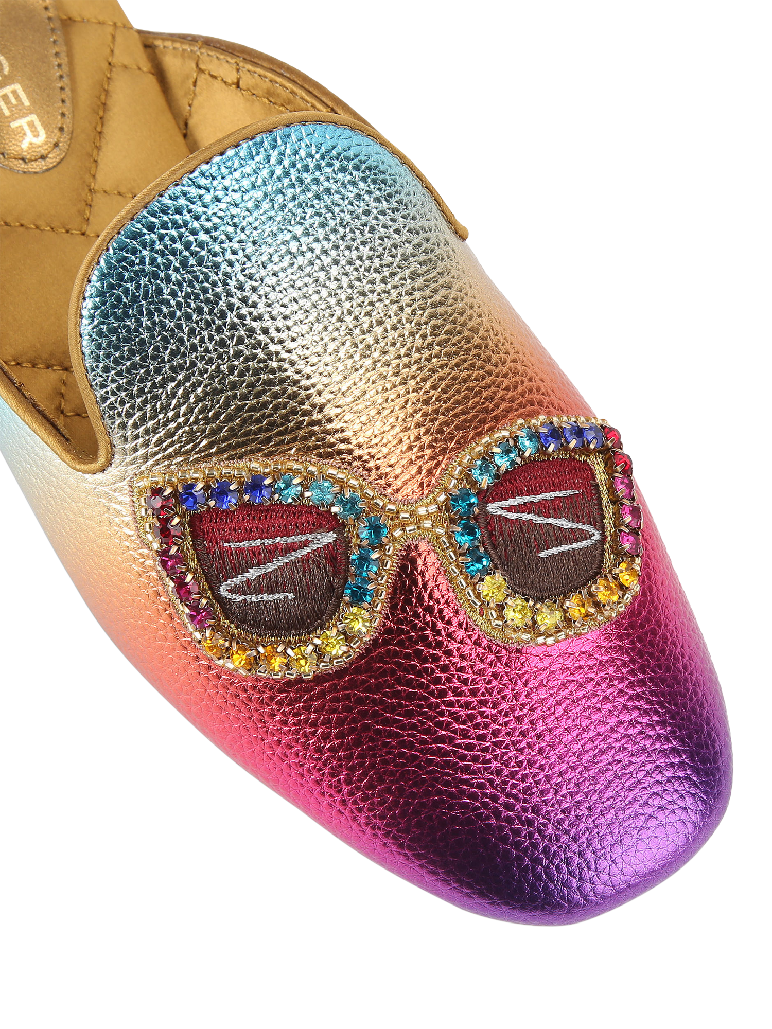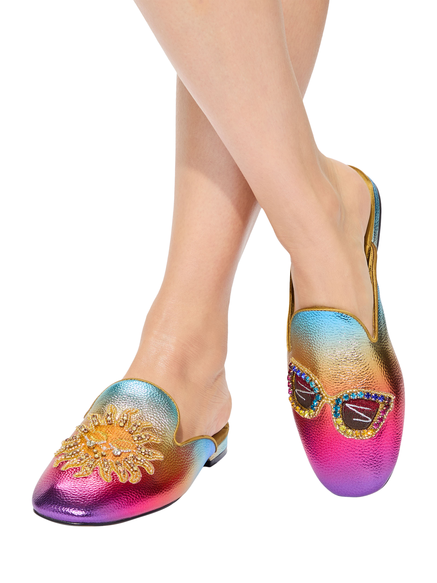 This pair of embroidered flats features an ombre metallic pebble grain leather. There is a pair of embellished sunglasses on the toe of one shoe and an embellished sun on the other.