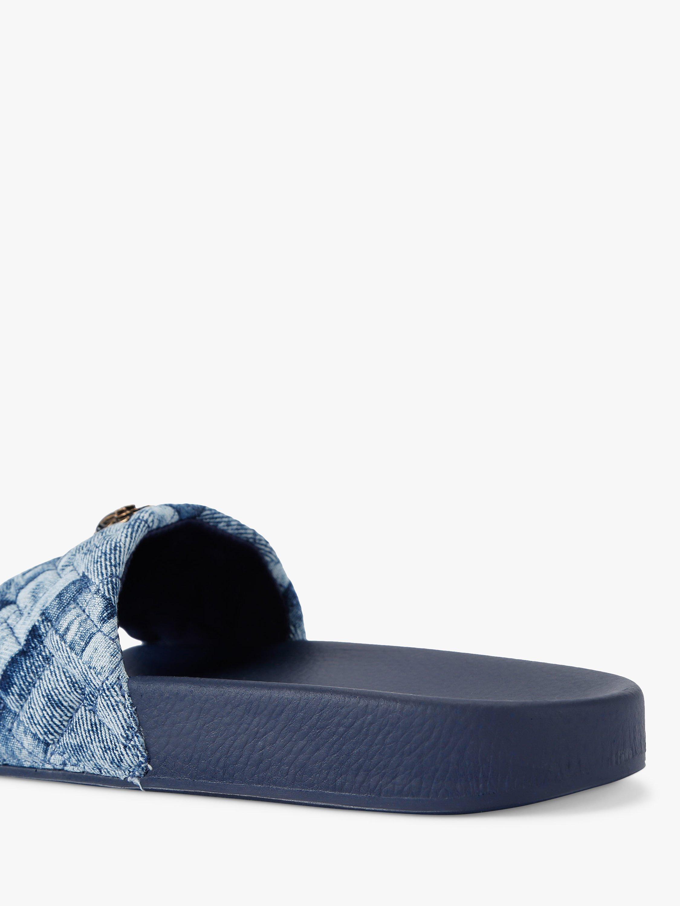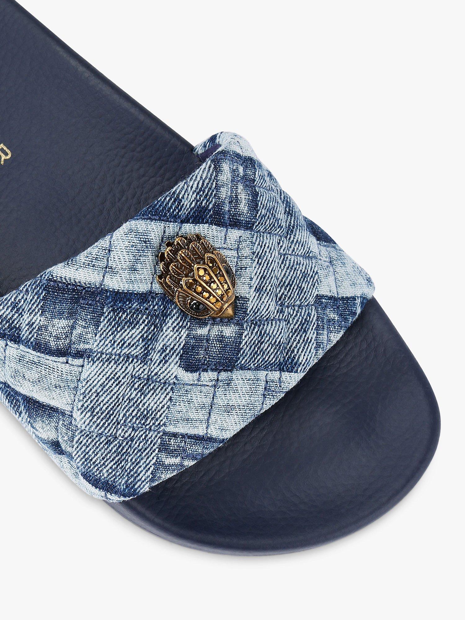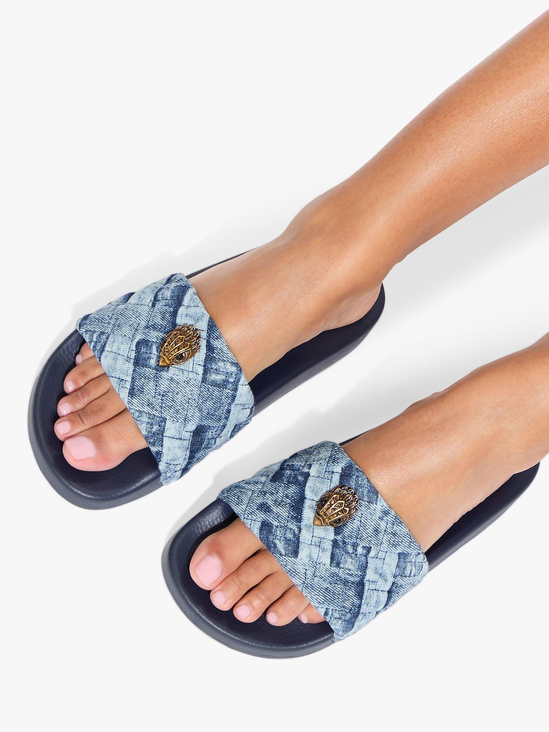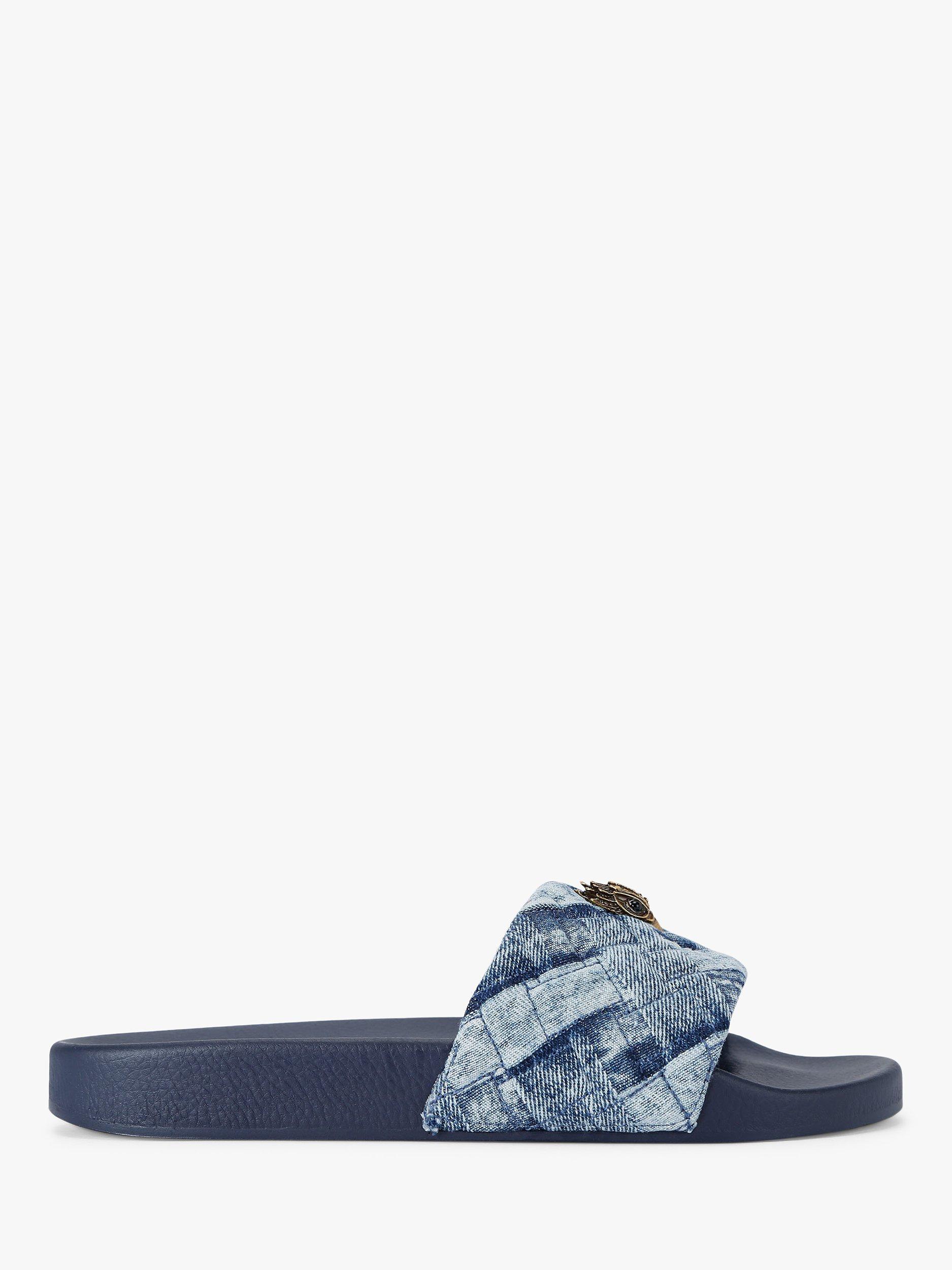 Slipping on ready for the warmer months, this pair of sliders by Kurt Geiger London is made in lightweight, yet durable denim-like canvas. Sitting on a flat heel, they have a rounded toe with an embellishment on the strap.