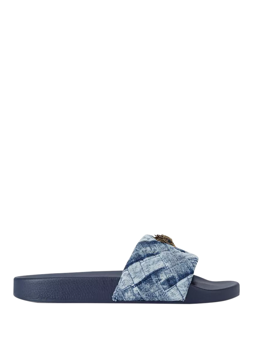 The Meena Eagle sandal from Kurt Geiger London arrives in a denim slide-on style. The strap features a bleached weave effect and an antiqued brass eagle head on the top.