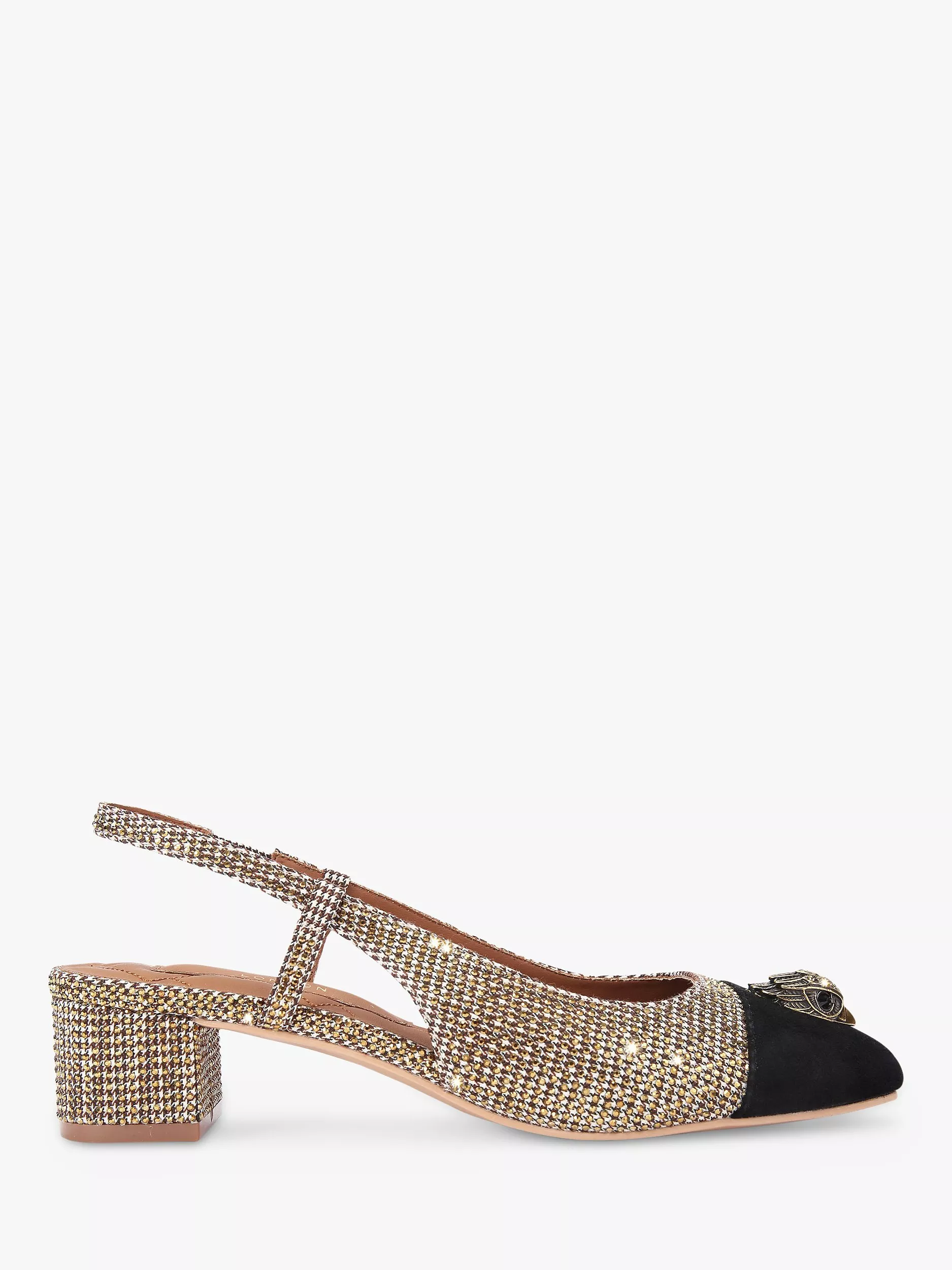Slinking your way through evenings and events with ease, this pair of slingback courts from Kurt Geiger London is rendered in a robust metallic fabric with a signature jewel.