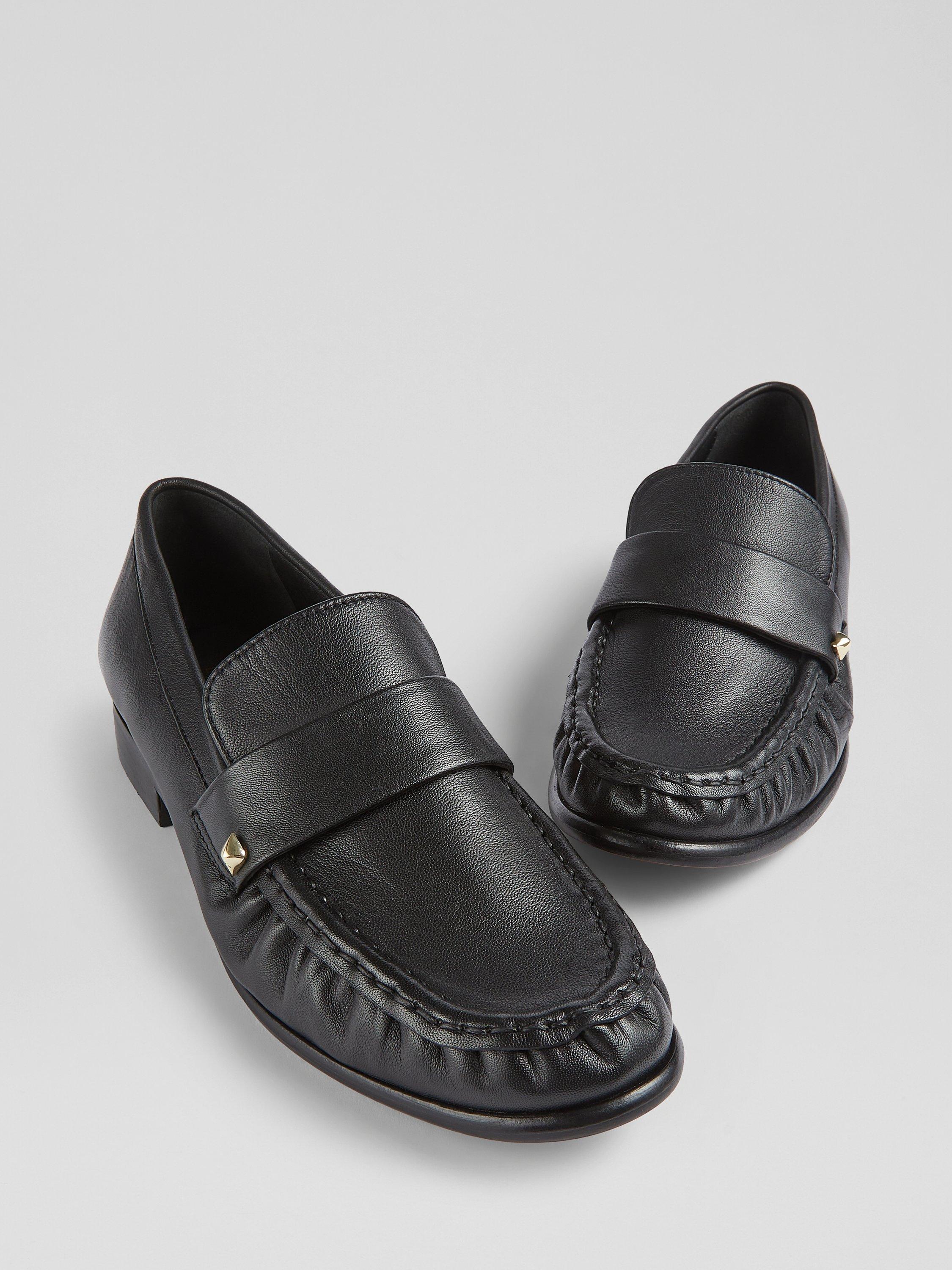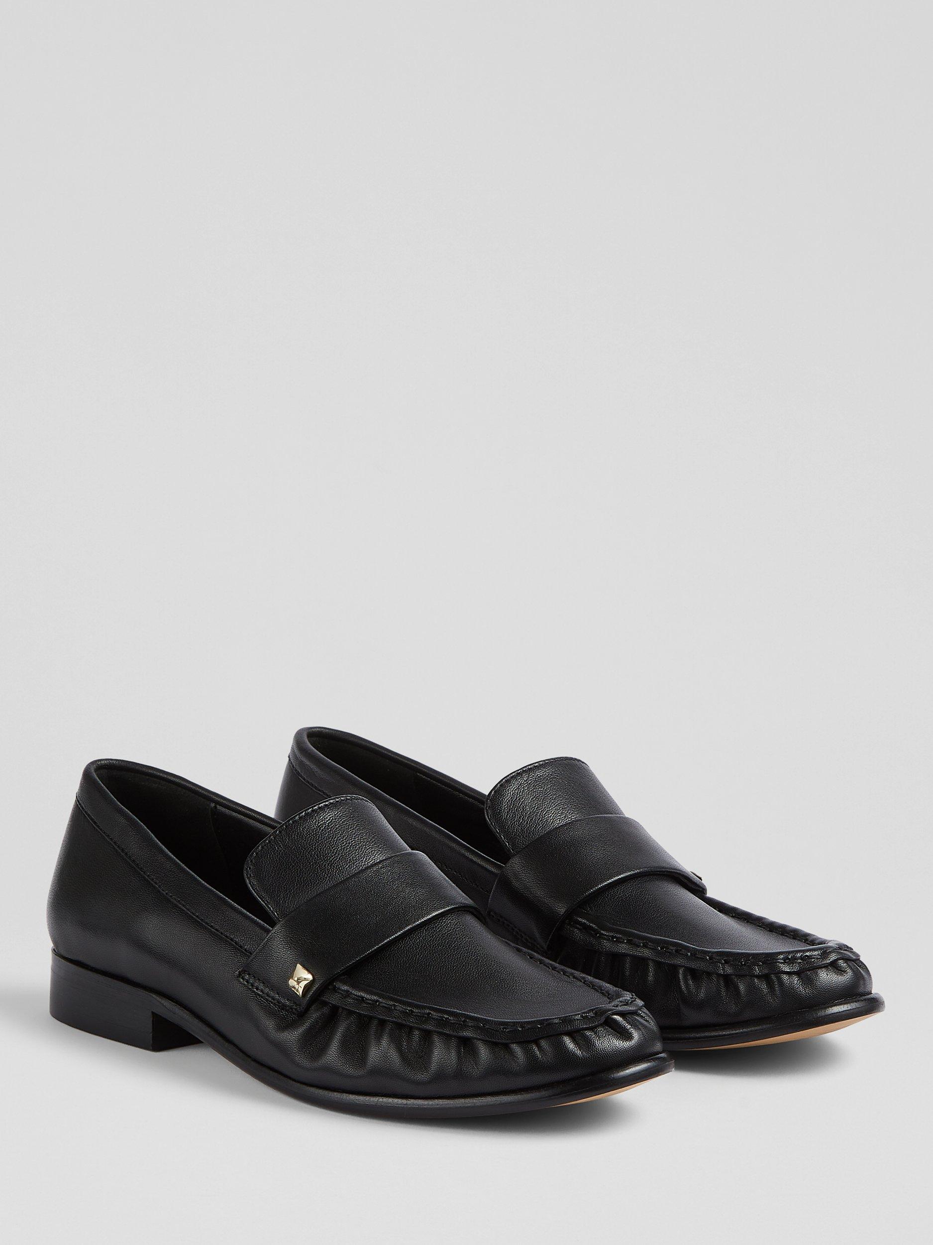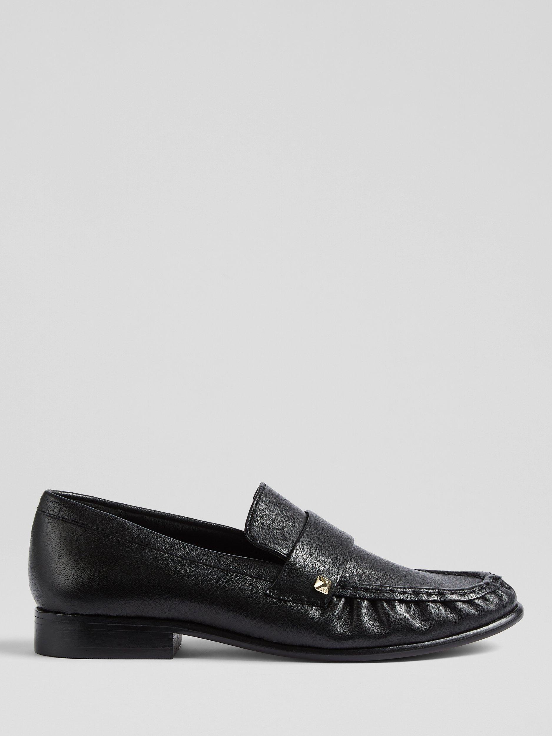 The Adira loafer from L.K.Bennett is a timeless black oloid stud design, crafted from luxurious nappa leather. This flat silhouette is both elegant and versatile, making it a smart-casual staple. Ideal for a business meeting or a dinner date, pair them with tailored trousers or a sleek dress for a refined look.