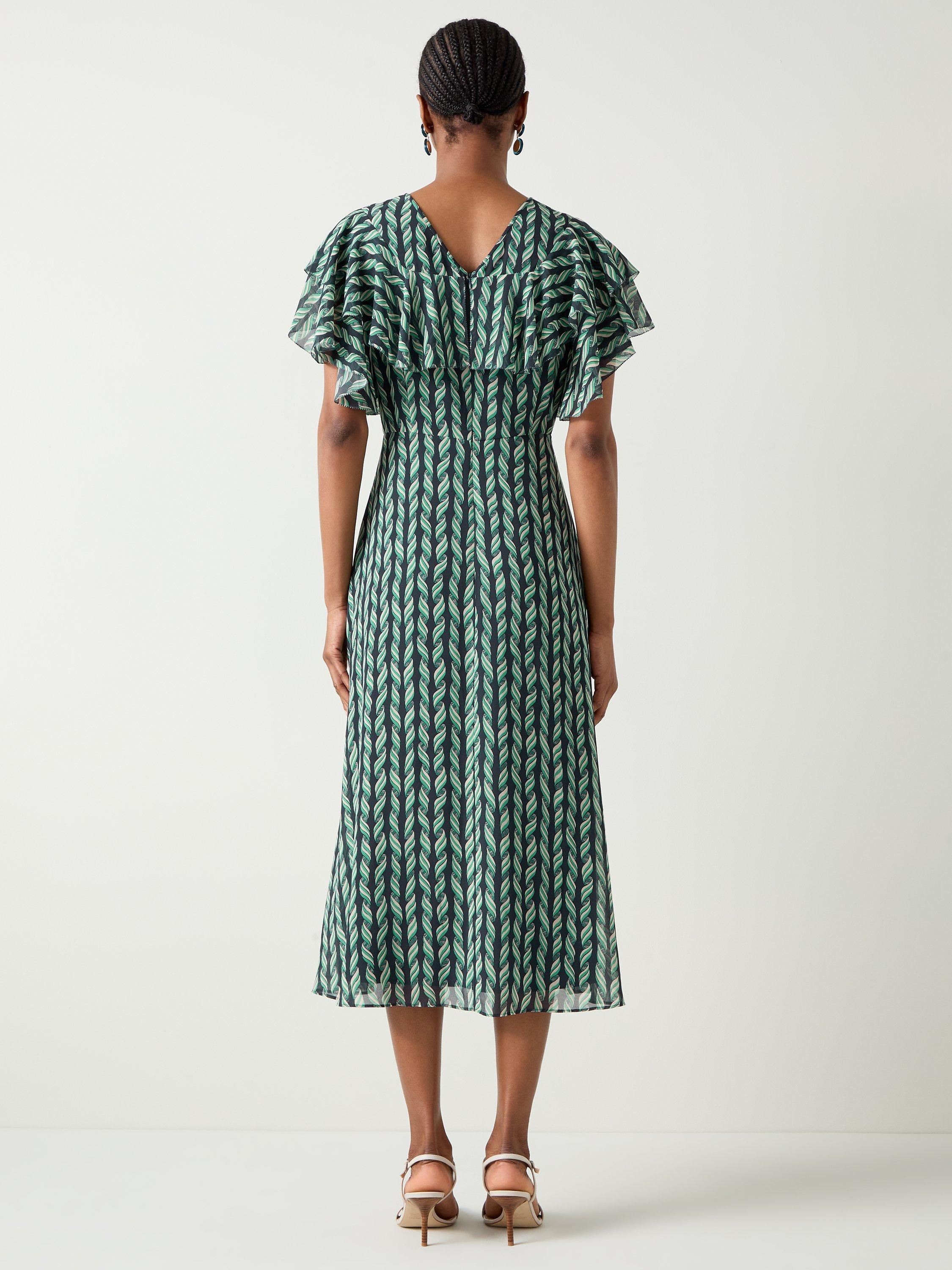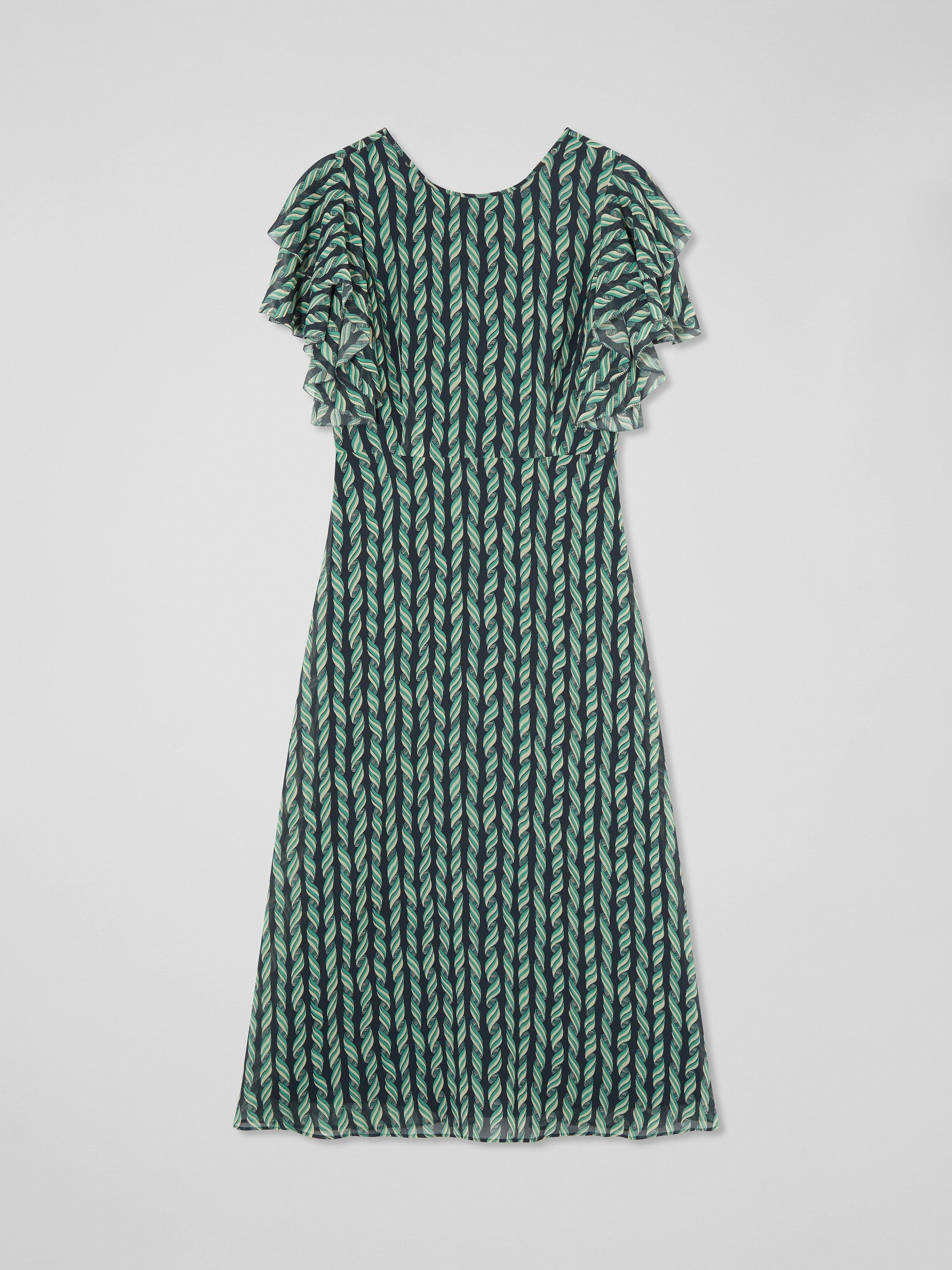 Embrace elegance with the Agnes ribbon print georgette frill dress. This beautifully crafted piece is adorned with picot edging, a convenient zip closure, a scoop neck, and full length sleeves. Perfect for evening occasions, complement it with heels and a clutch or ballet flats for a sophisticated, relaxed look.