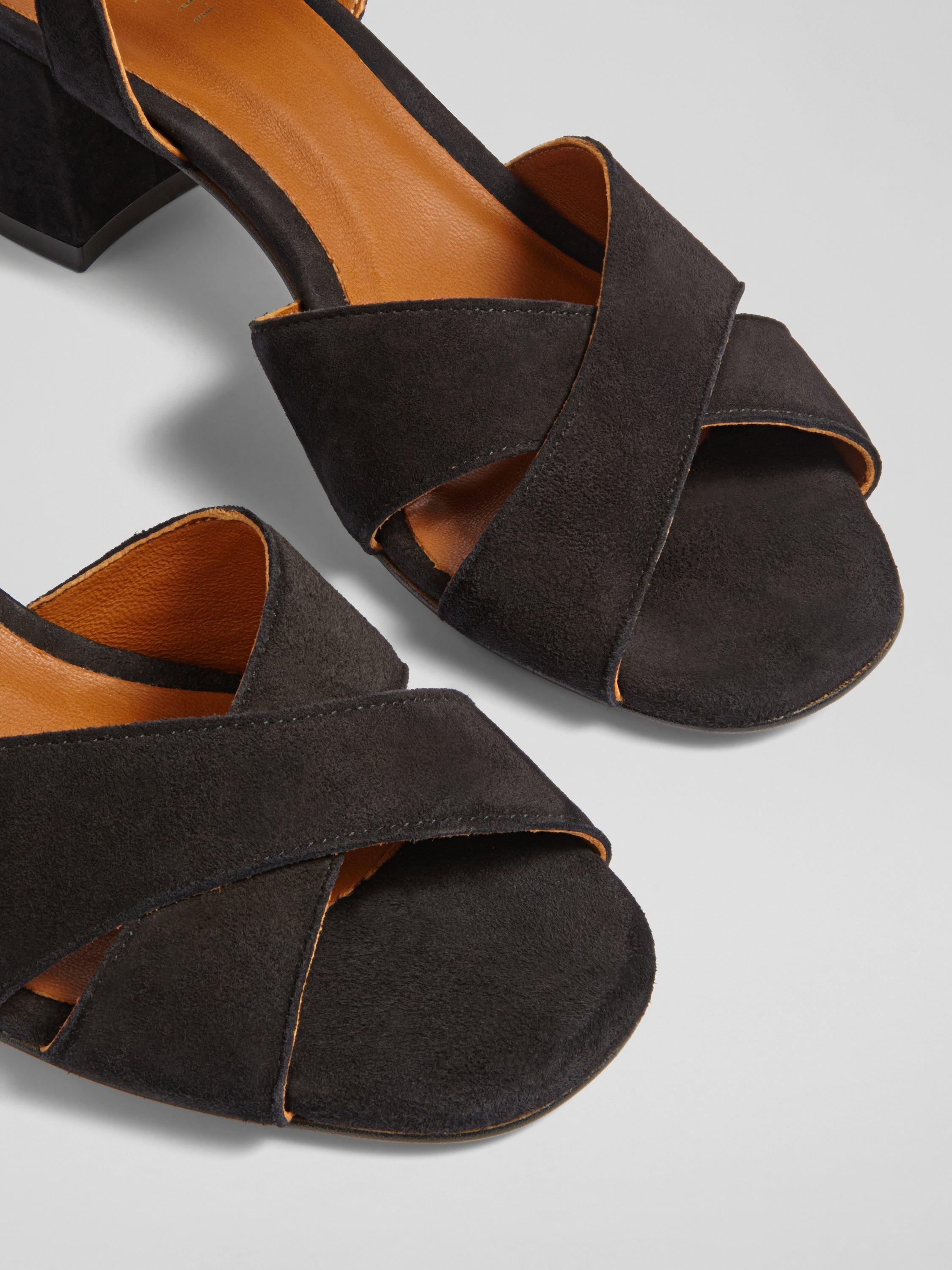 Embrace the season with elegance in the Alba cross-front sandals. Crafted from kid suede, these sandals feature leather craftsmanship and a block heel. Ideal for date nights or cocktail parties, they pair effortlessly with tailored trousers or your favourite evening dress for a polished look.