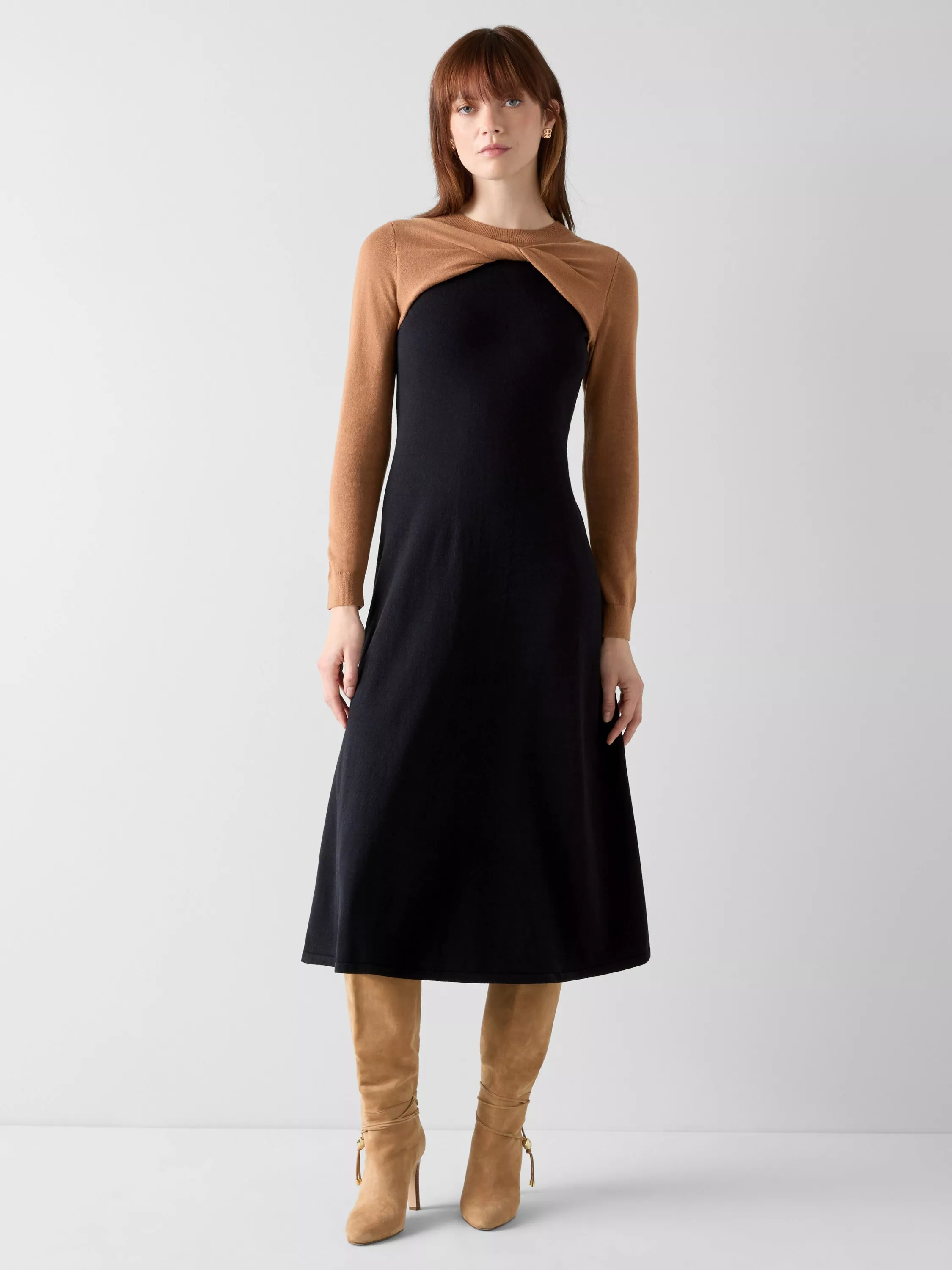 This knit midi dress, the Aletta, presents a striking, blocked pattern and a clean, elegant silhouette with its classic crew neck and a modern twist front. Crafted from a soft cotton and merino wool blend, the straight fit and flare shape is designed to be flattering and comfortable for smart casual moments. Its quality and versatility mean it transitions seamlessly from a day look with ankle boots to an evening ensemble with heeled sandals.