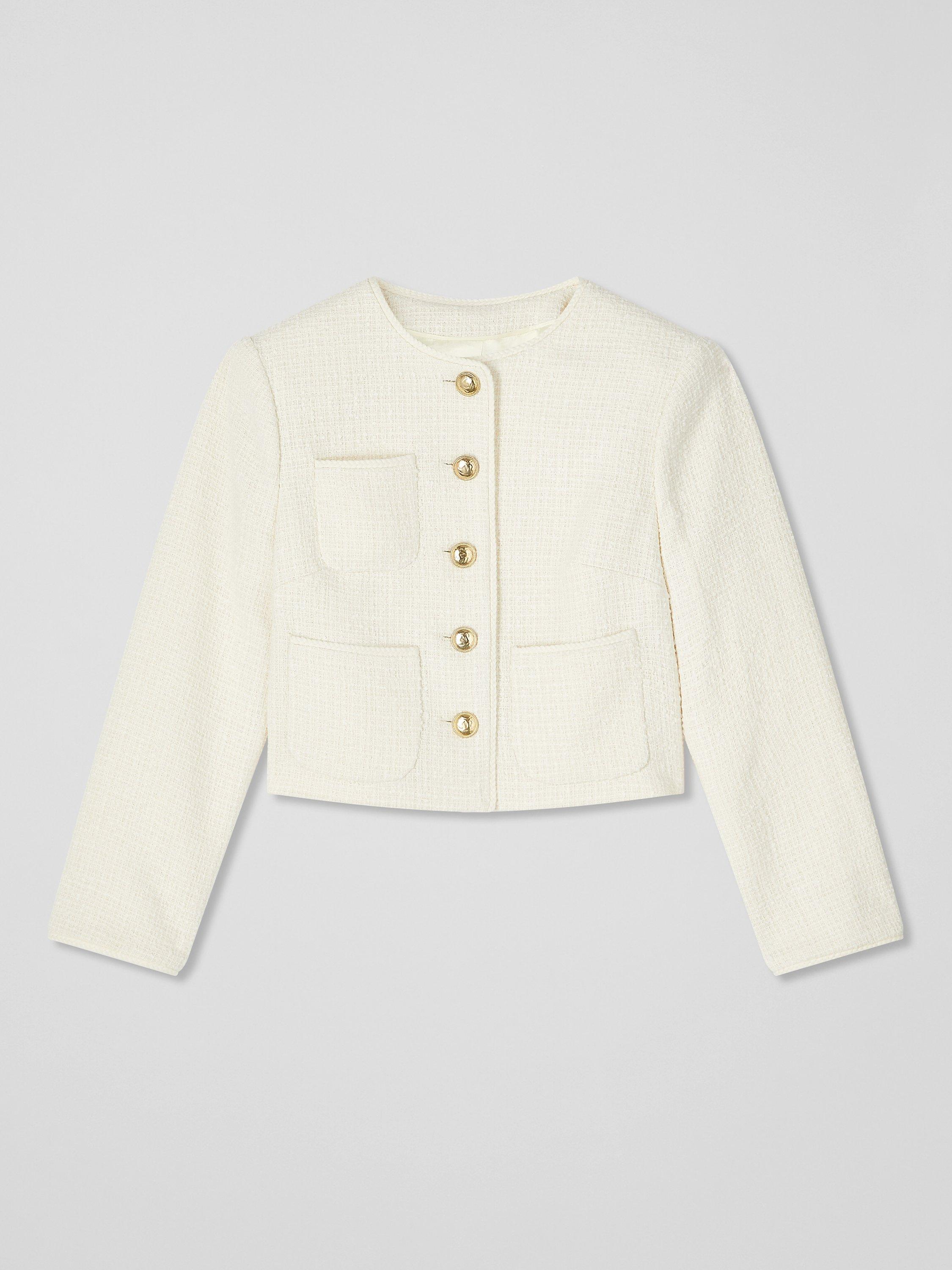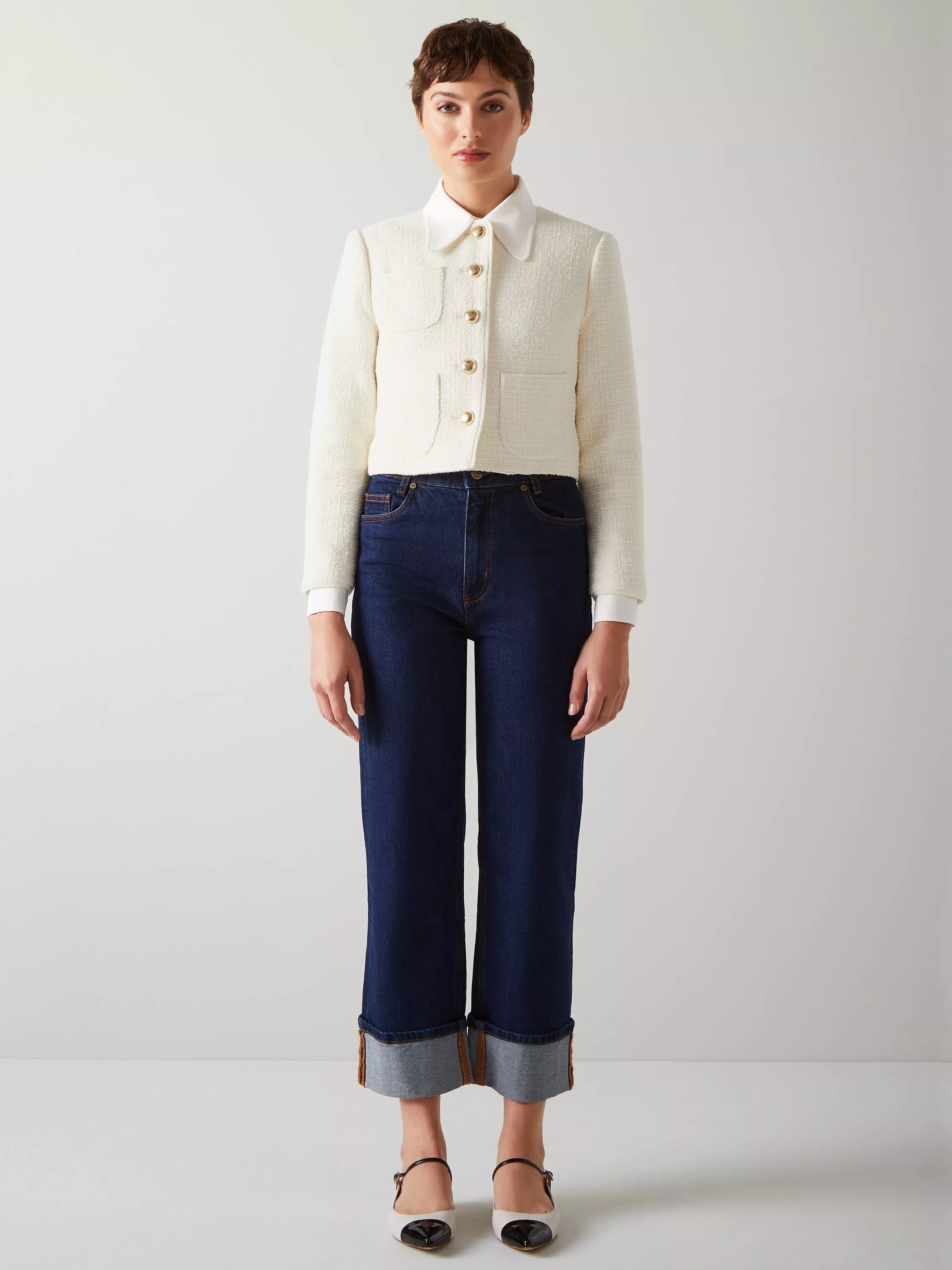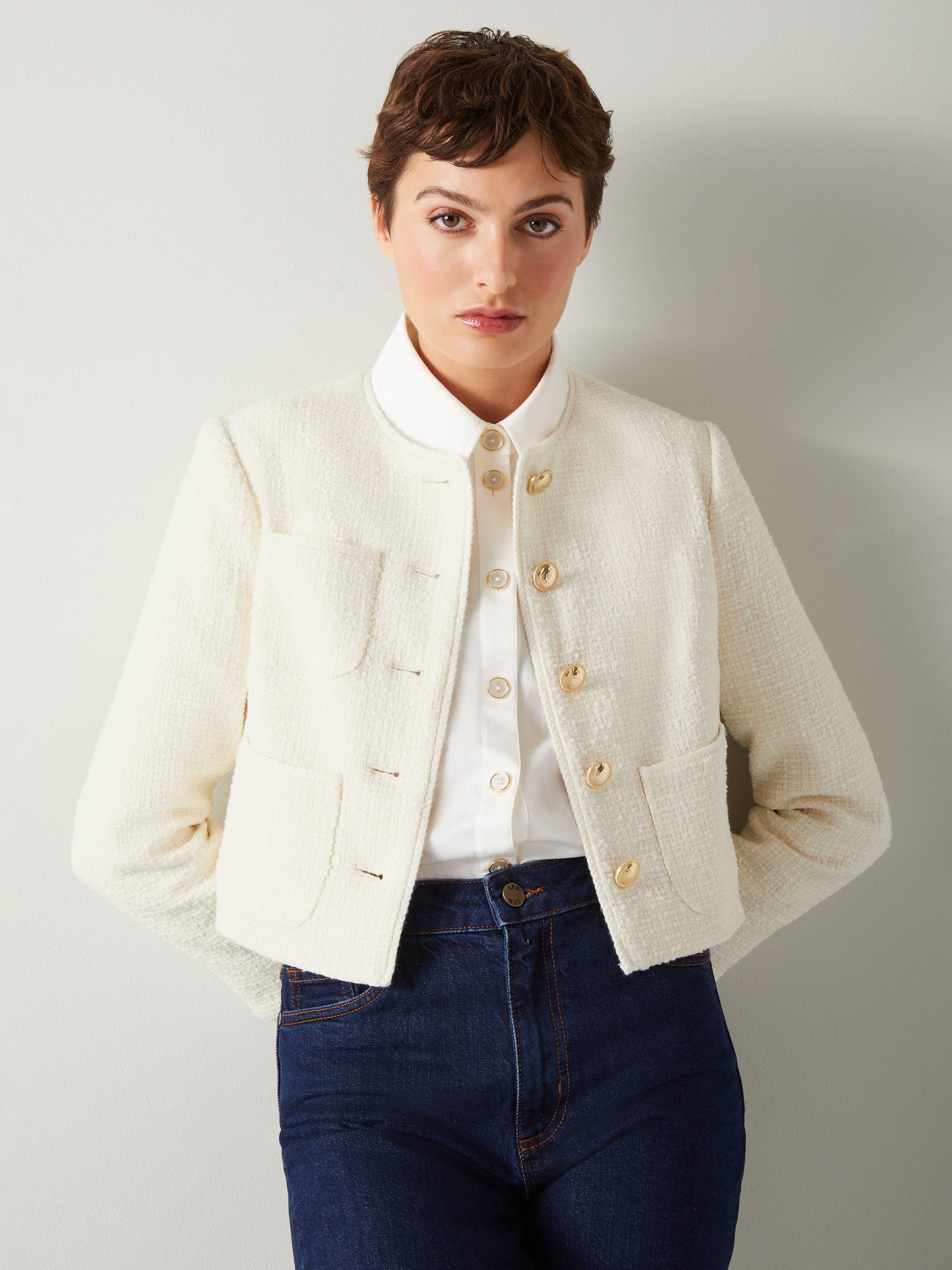 A fresh take on tweed, the Alexa jacket feels contemporary rather than classic with its cute cut, in one of our favourite fabrics. Crafted in Europe from a recycled cotton blend Italian tweed, it has a neat little pointed collar, a braided trim, three patch pockets to the front, chic gold hammered buttons, and a boxy, cropped silhouette. Style it with a shirt and jeans and a pair of Mary Janes.