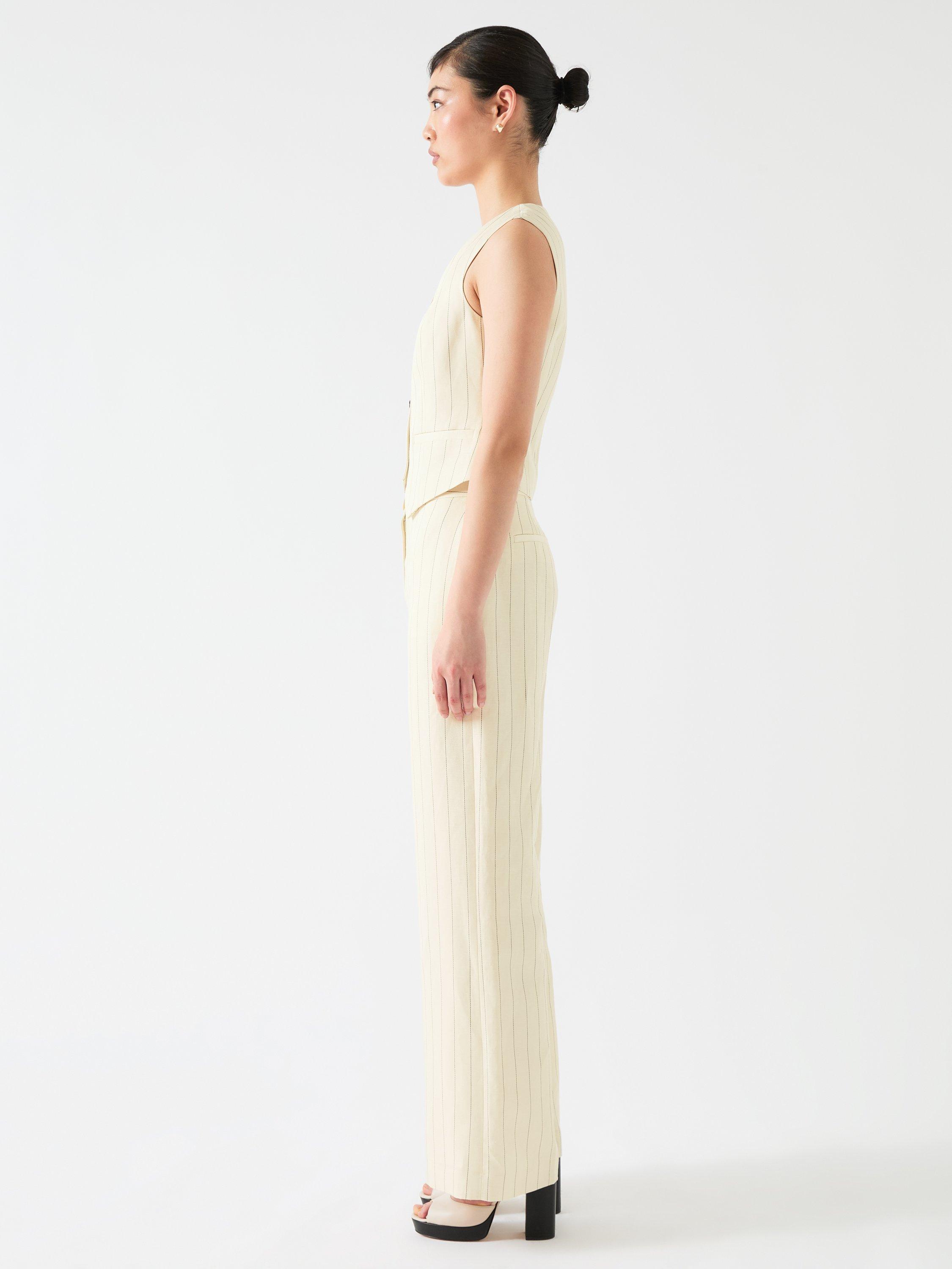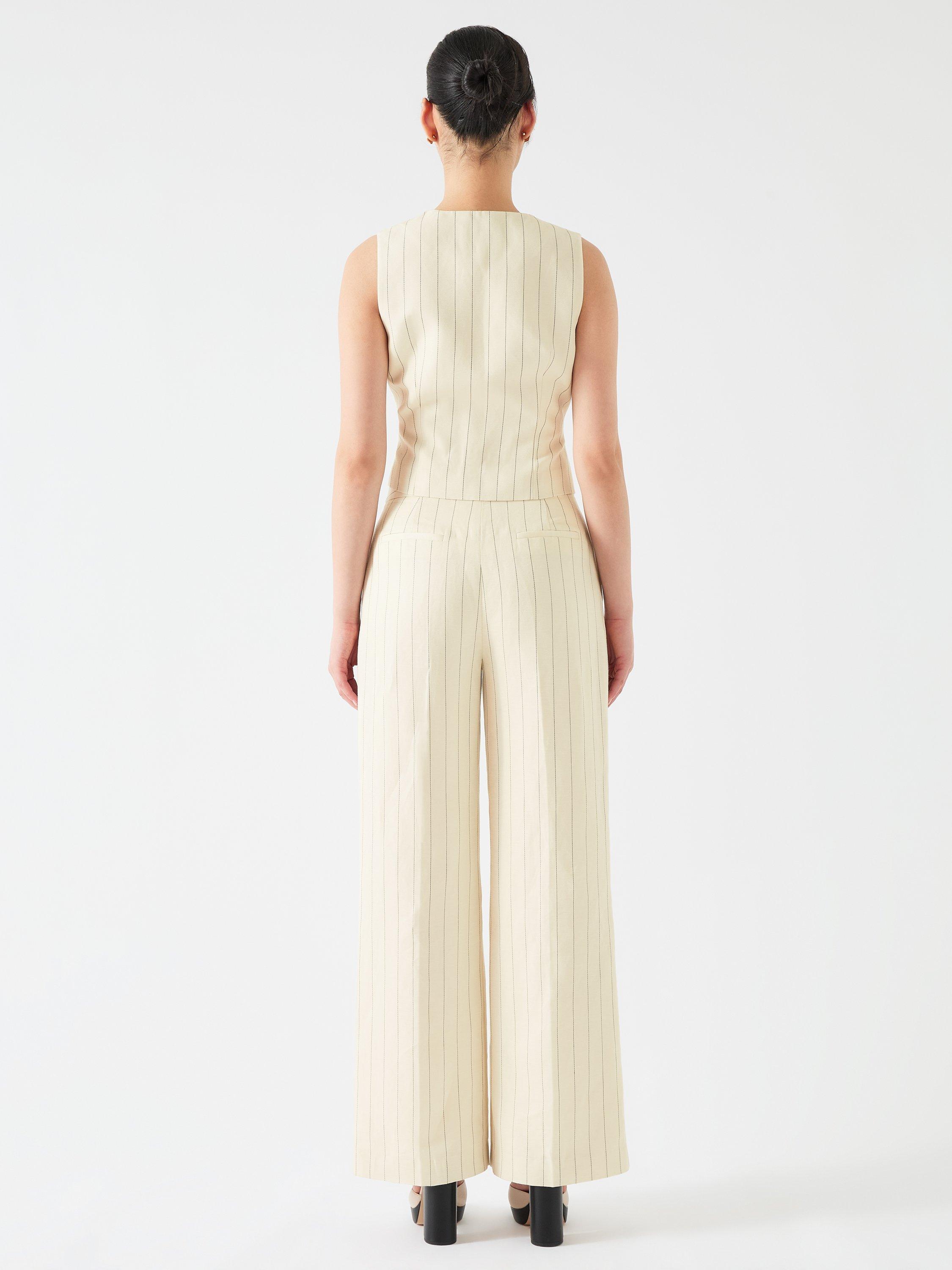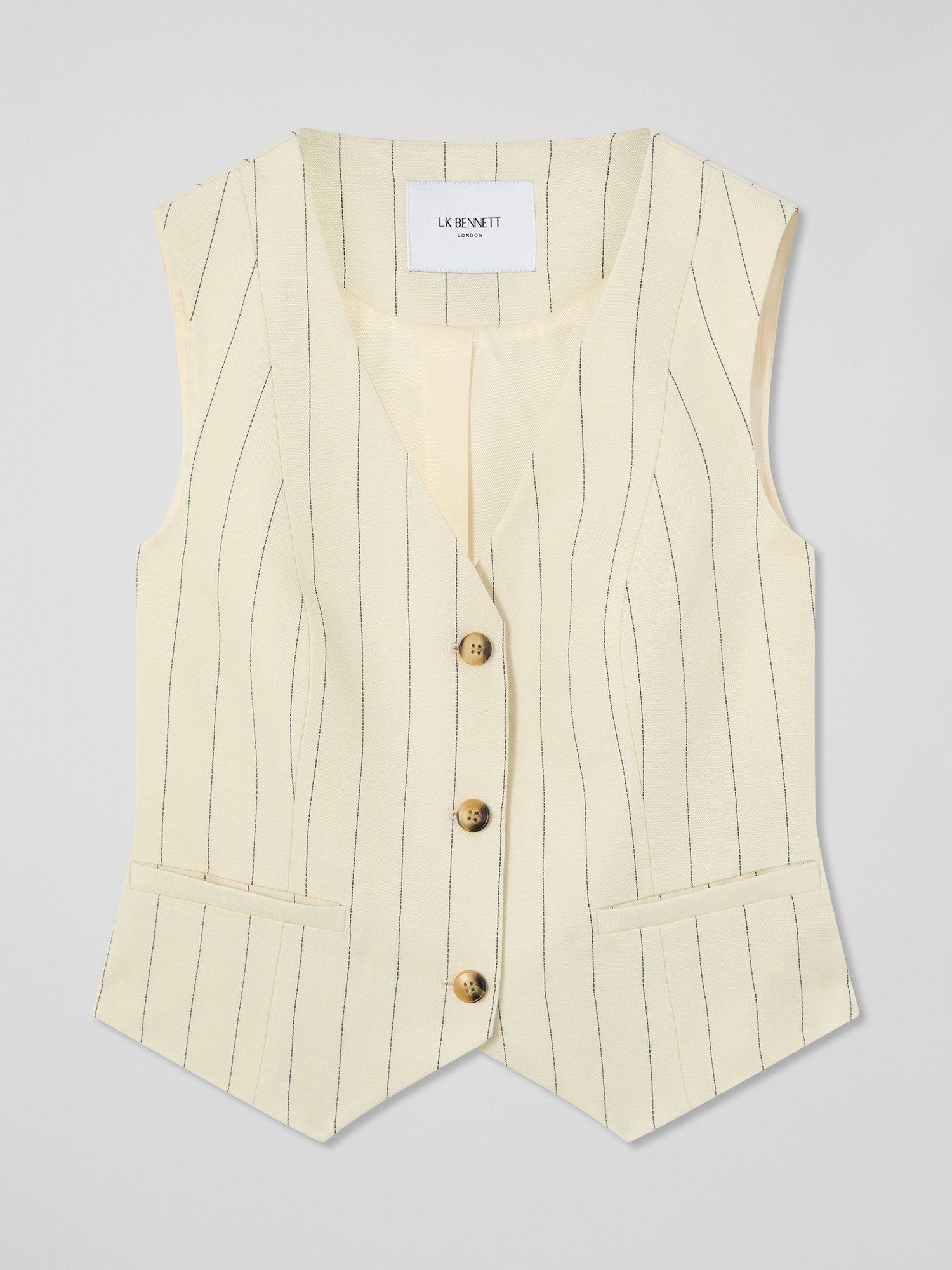 The Ami pinstripe waistcoat offers timeless elegance. This cream and ivory linen blend features pinstripes, faux mock horn buttons and a back tie. It's versatile, ideal paired with tailored trousers for work or a flowy skirt for a relaxed look, suitable for office meetings or weekend brunches.