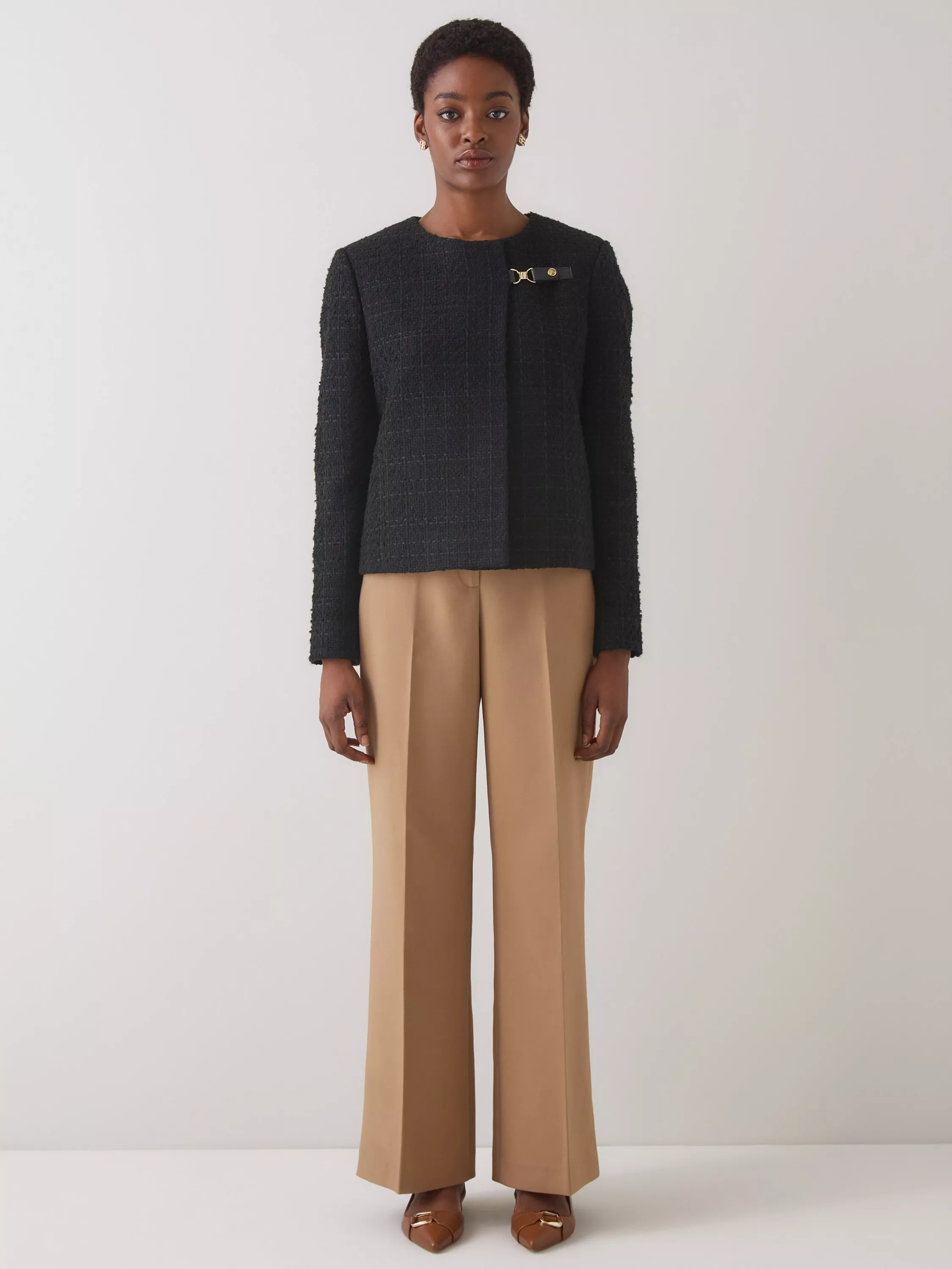 The Arden jacket features a classic tweed fabrication. This elegantly tailored, cropped silhouette showcases a distinctive metal buckle fastening as its standout detail. With long sleeves and a unique collar design, this piece of British-inspired designer outerwear adds character and style to any outfit. The Arden jacket transitions effortlessly between work and weekend wear, making it a practical addition to your smart casual wardrobe.