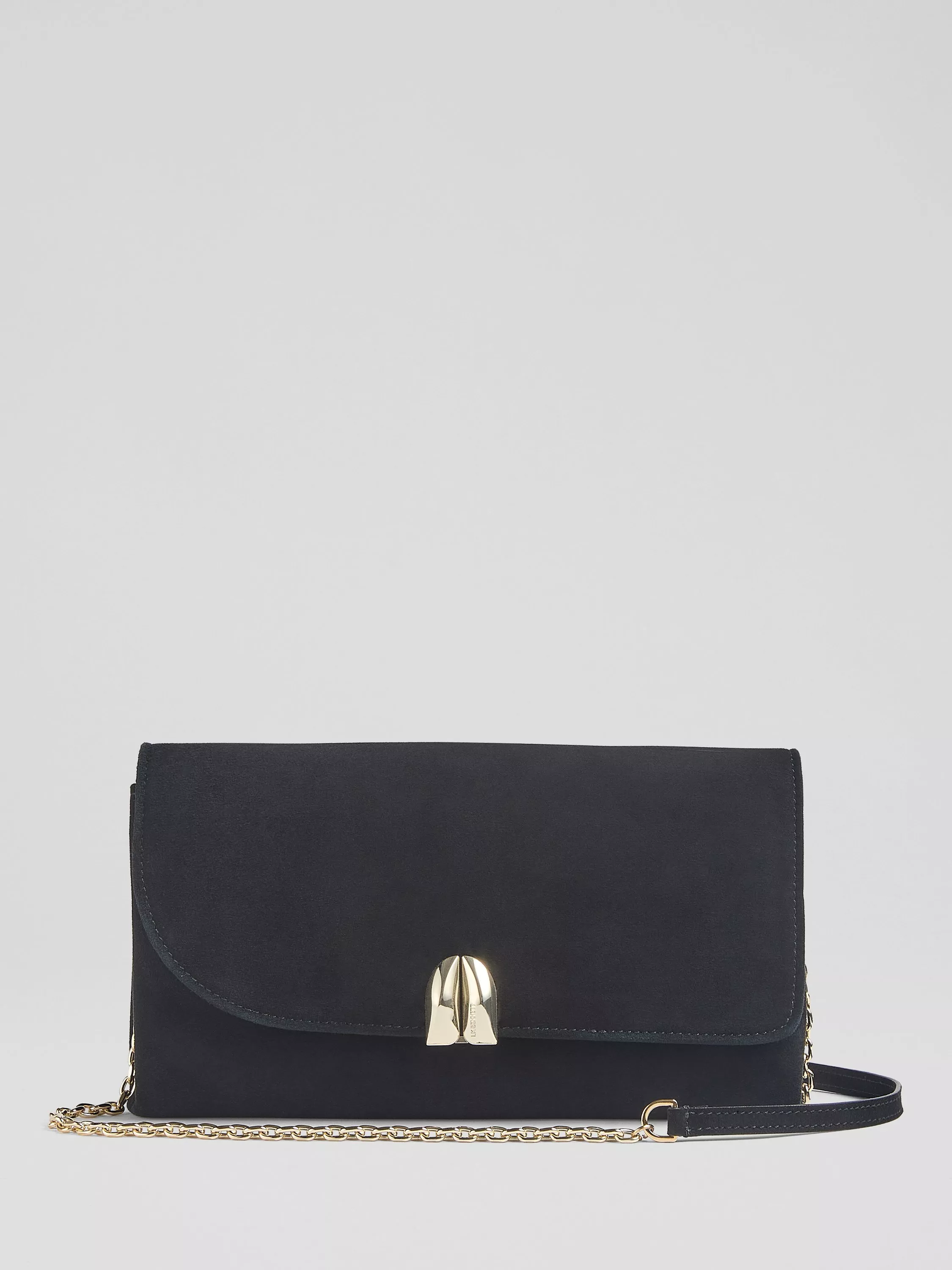 Make an entrance at an elegant soirée with the Aria clutch bag by your side. In rich black suede, this timeless accessory features a chic curved flap and new branding.