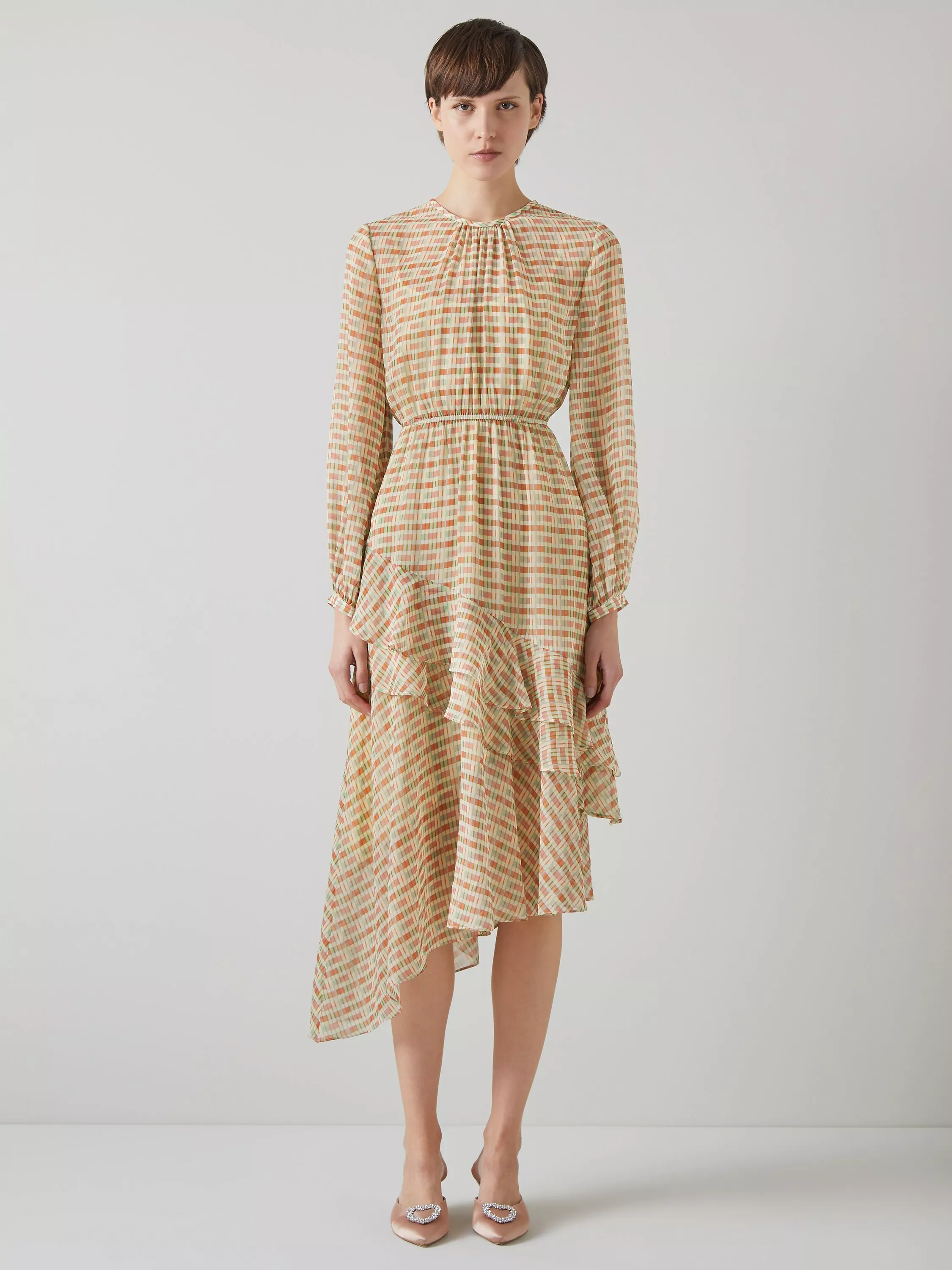 Who doesn't love floating around in a ruffle or two when the sun shines? The Bea dress is designed to do exactly that. Crafted from a whisper-light silk chiffon with a mini check, it's slightly-sheer with a slip layer, a round neck with pleat detail, long balloon sleeves, and a floaty midi length with asymmetric ruffles. Dress it up or down with a pair of mules or strappy flats and a basket bag.