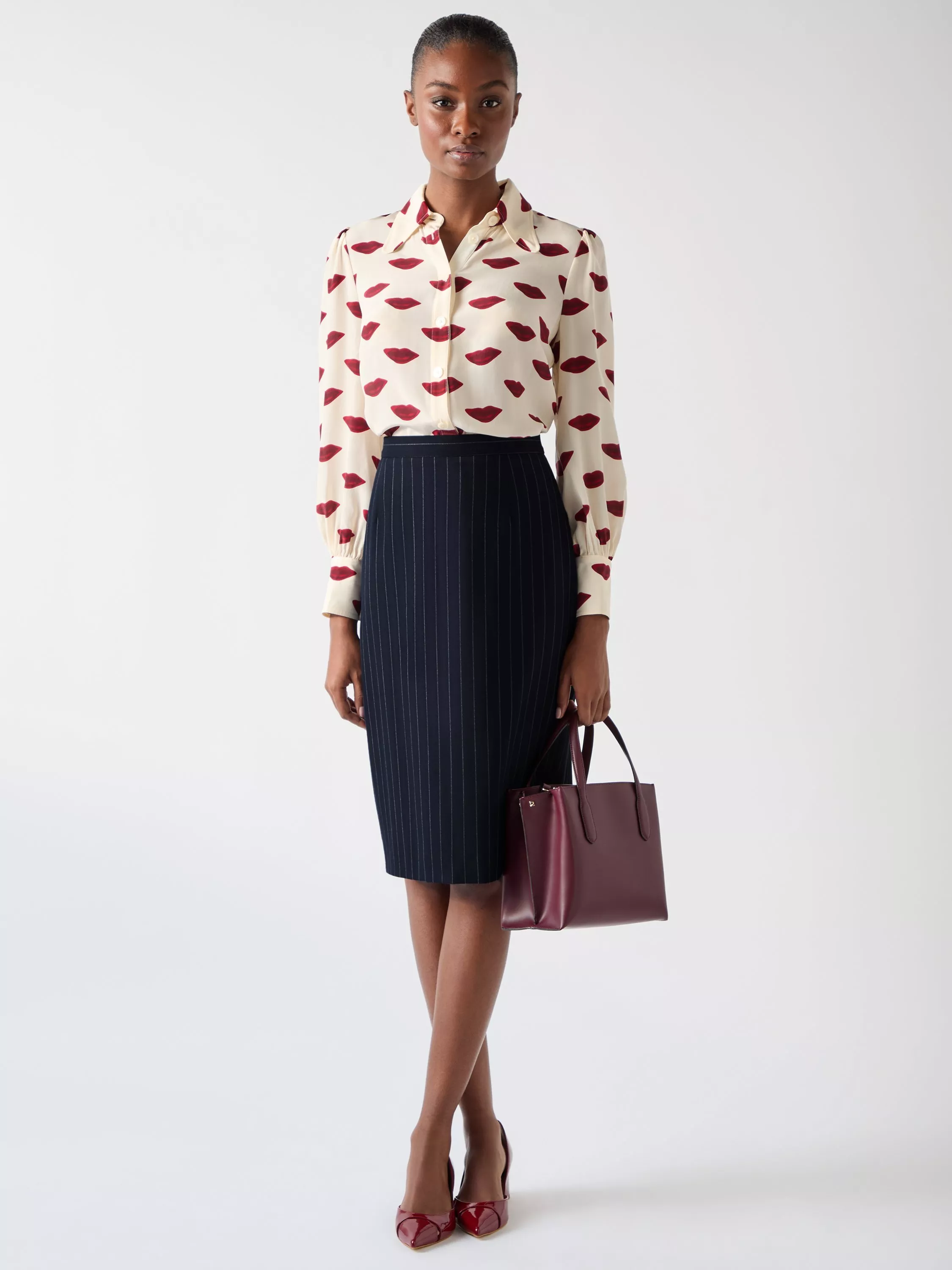 The Bella skirt, in pinstripe, is crafted from a wool blend with a pencil silhouette, perfect for your workwear ensemble. Ideal for office meetings or business lunches, pair this piece with a white blouse or a tailored blazer for an effortlessly polished look.