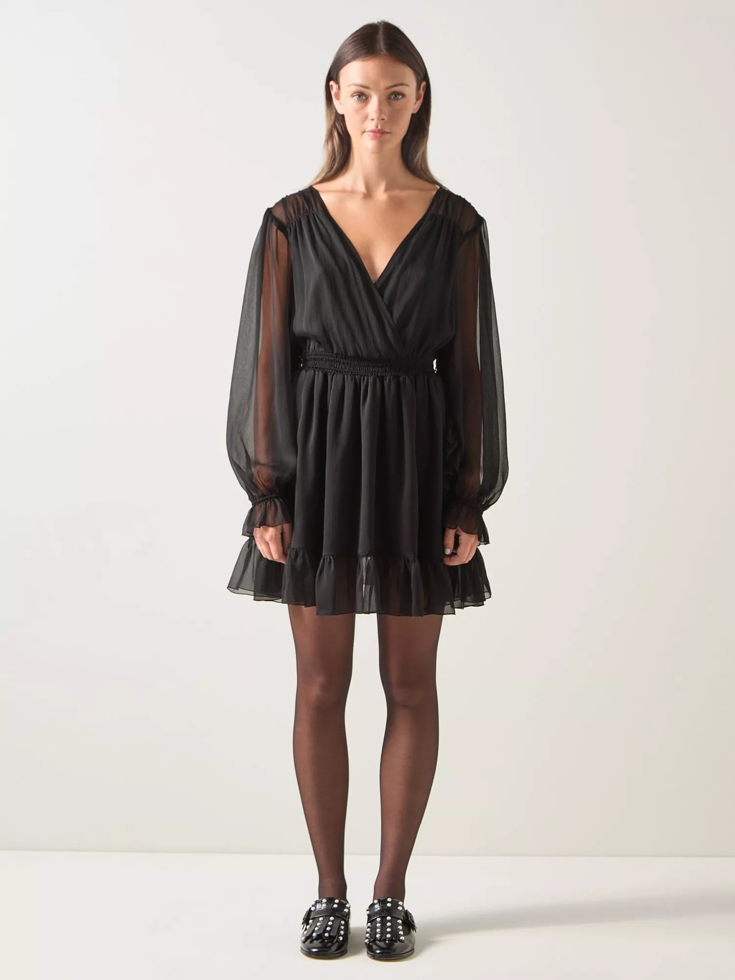 This piece showcases delicate frills and a flattering V-neckline, while the long sleeve design and fit and flare silhouette give a timeless, feminine shape. It features an elegant sheer crinkle with a self-lined finish that creates beautiful movement.