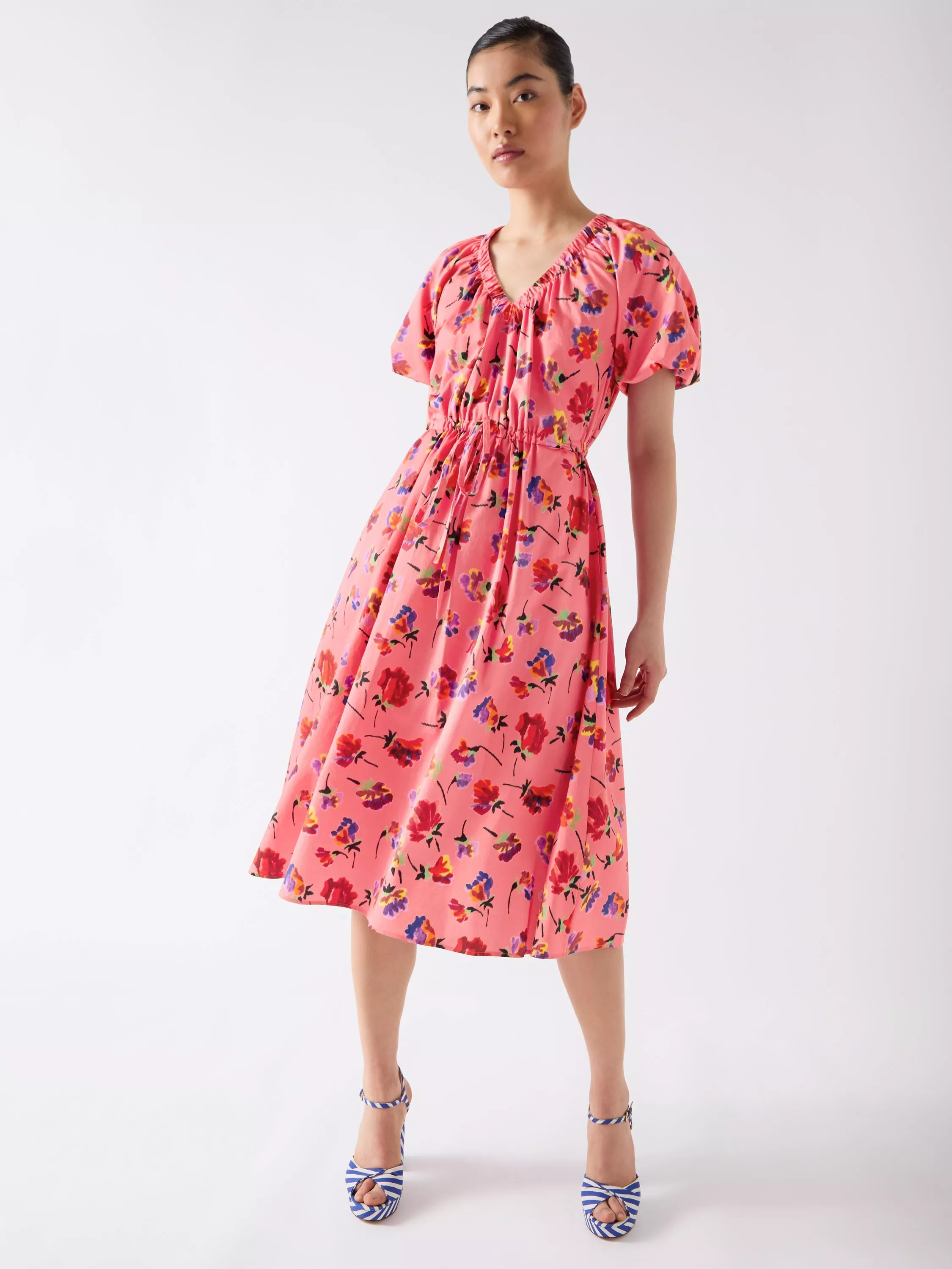 Perfect for spring brunches or garden parties, the Brigitte dress offers style. Made from cotton, it boasts a ikat floral print, self belt, gathered neckline, and pockets. Pair with sandals for a polished look or trainers for a casual ensemble.