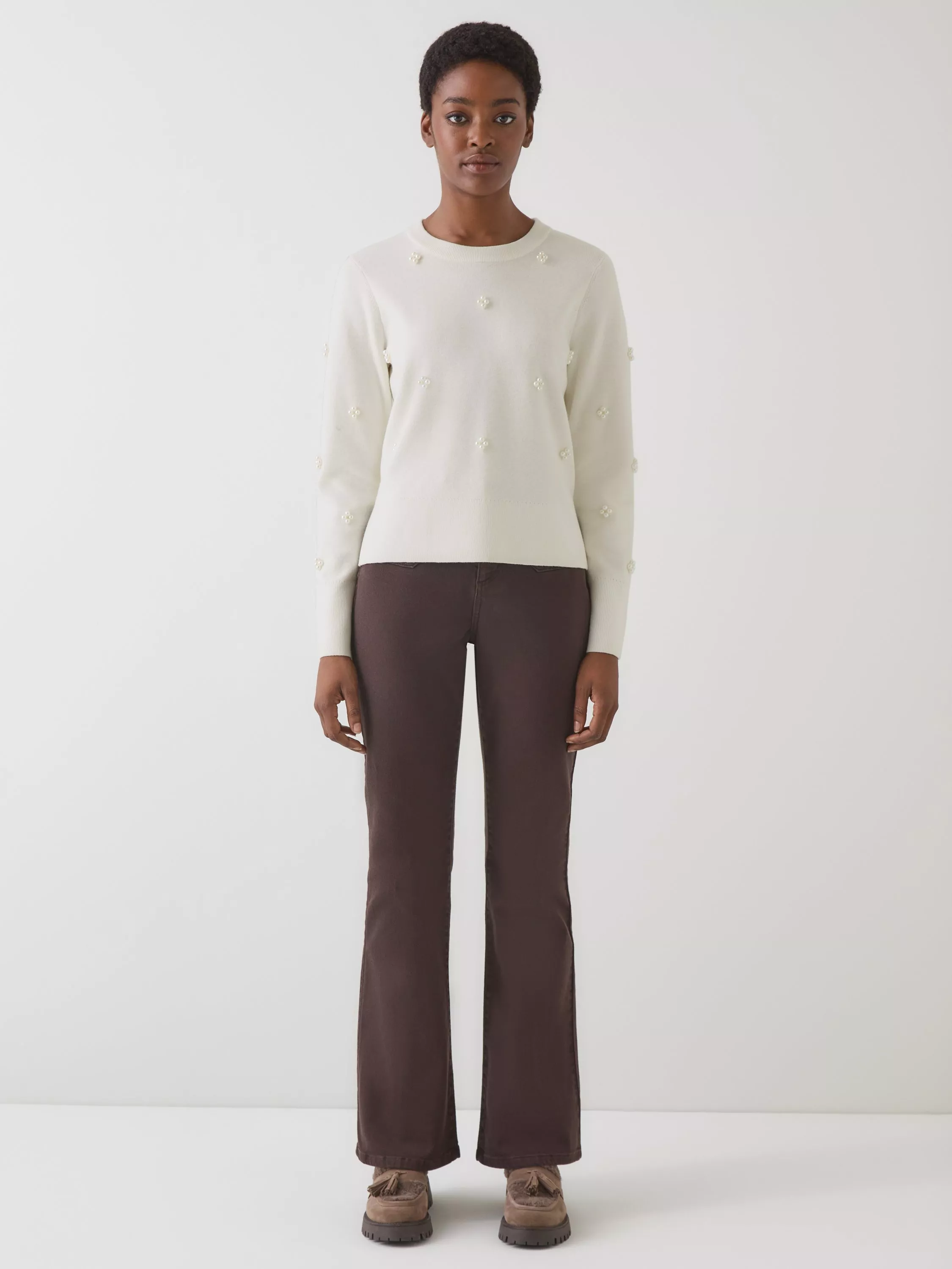The Buttercup sweater is a luxurious addition to your everyday wardrobe. This knit jumper features pearl beading on a classic crew neck. Featuring long sleeves and regular length, this stylish pullover offers breathable, lightweight warmth for smart casual occasions. Pair with tailored trousers for work or with denim for weekend wear. The merino wool mix knitwear ensures cosy comfort while the pearl details add elegant finishing touches for the modern lady.