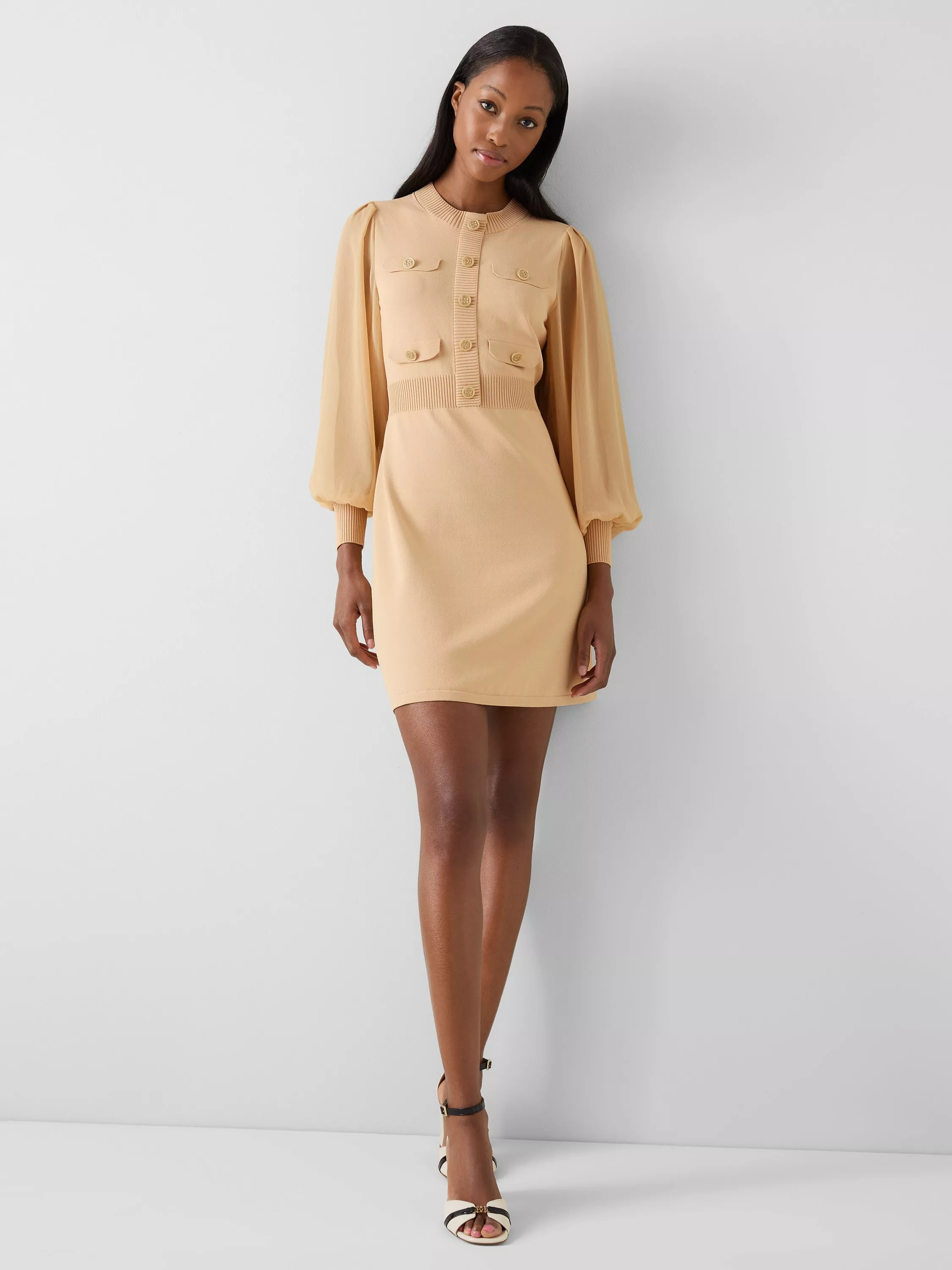 This Carlotta dress offers refined style with its fit and flare silhouette. The knit mix media design features a crew neck, perfect for all-day wear. This midi-length piece is finished with distinctive LKB metal logo buttons, adding a special touch. Style with ankle boots and a structured bag for daytime elegance, or dress it up with statement earrings and heeled sandals for evening.