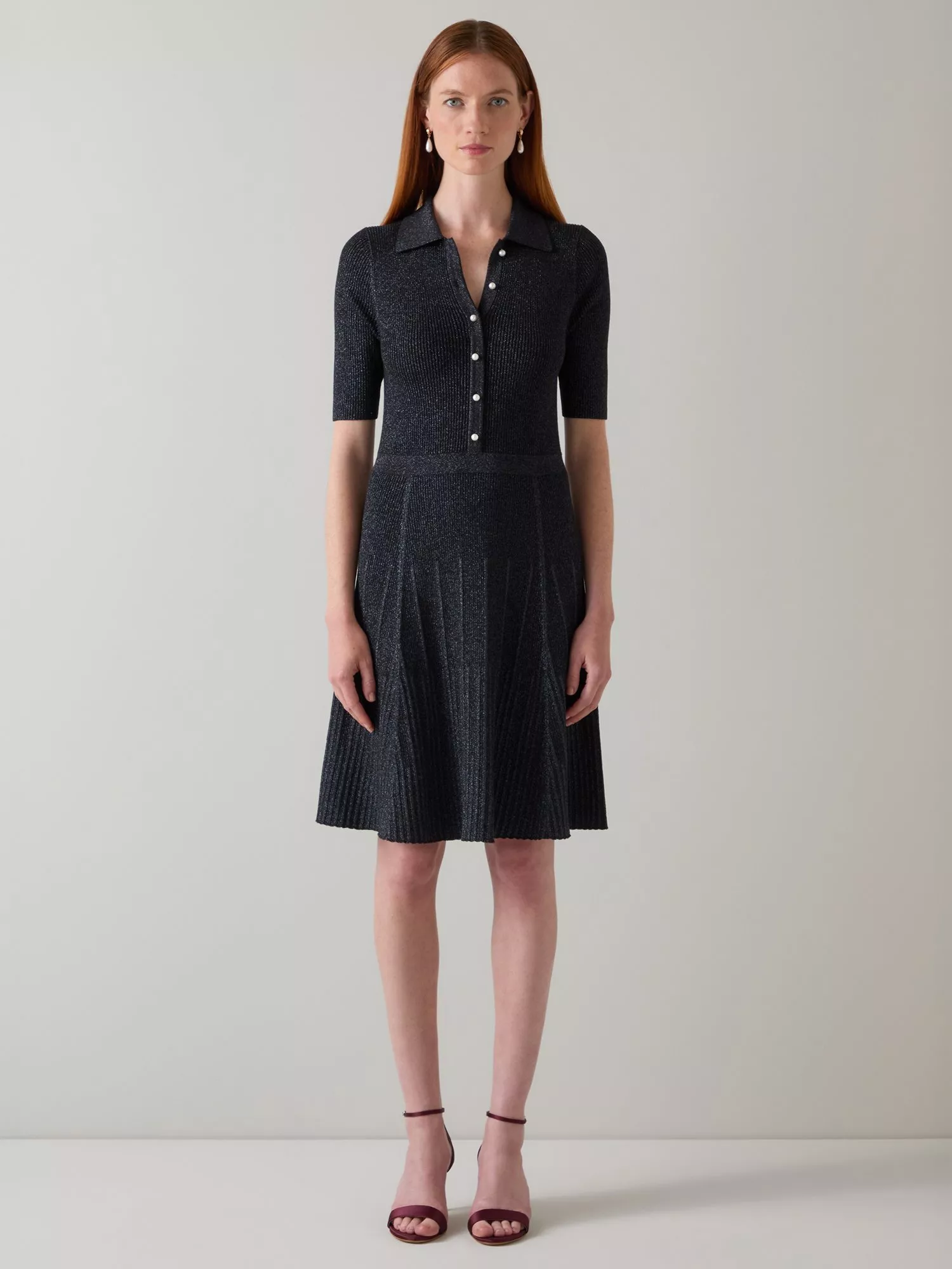 The Carrie dress combines elegance with shimmer for evening wear. Crafted in a fitted silhouette from a cotton blend with rib detailing, this mini dress catches the light with every movement. The palette creates a timeless look, while the collar and sleeves add a refined touch.