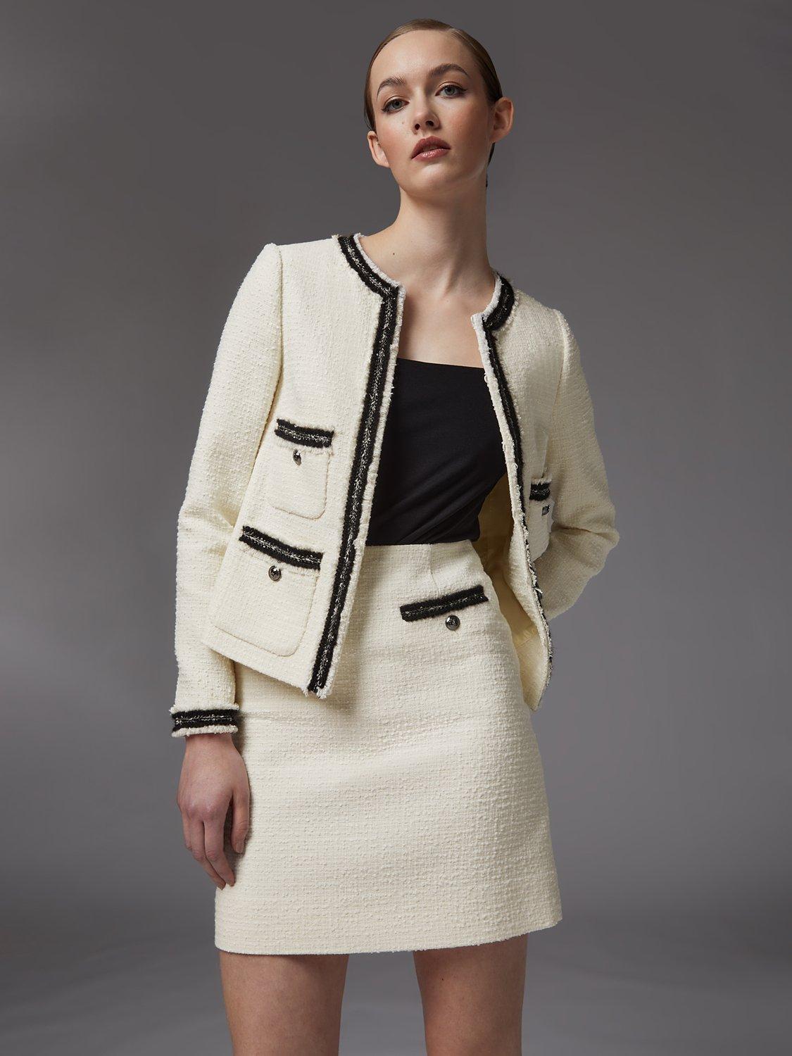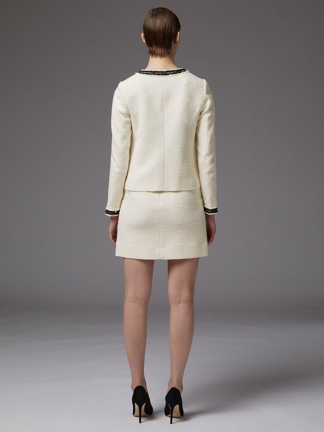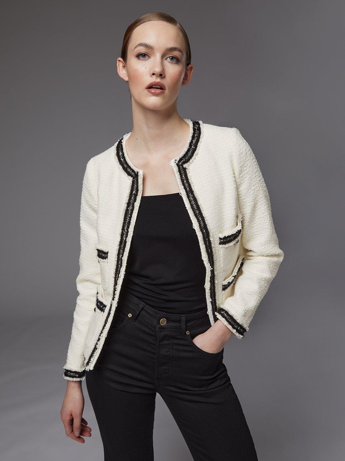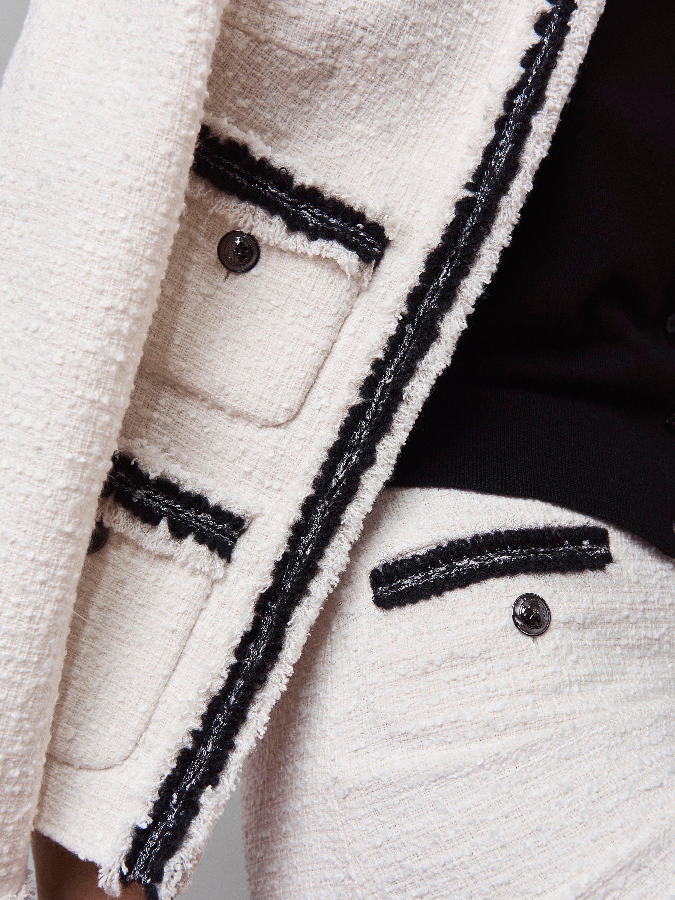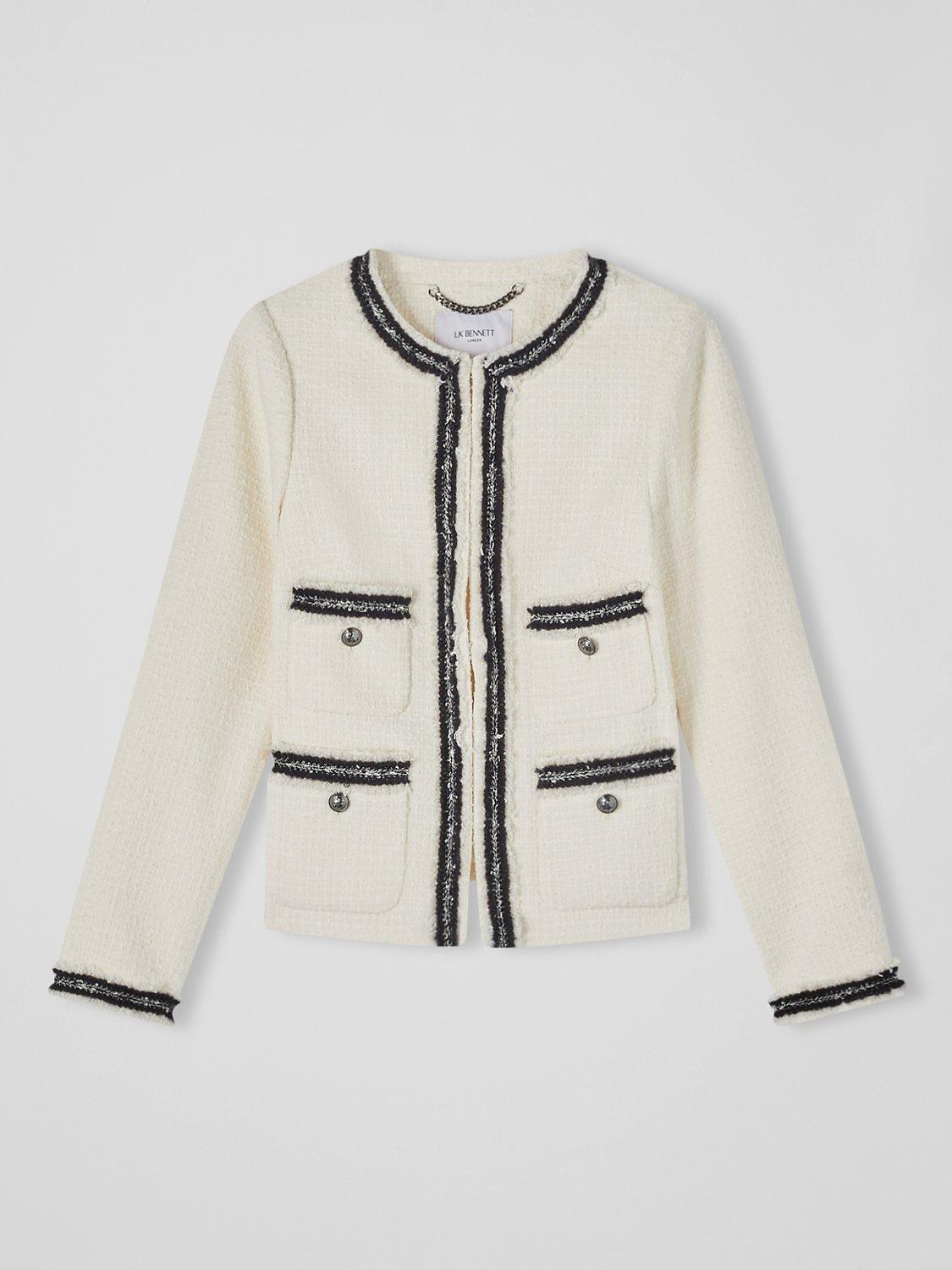 The Charlee jacket from L.K.Bennett is a timeless piece for your wardrobe. Boasting a unique four-pocket design to the front and finished with contrast fringe detailing at the cuffs and lapel, its soft and tactile handle is elegantly structured for formal workwear styling.
