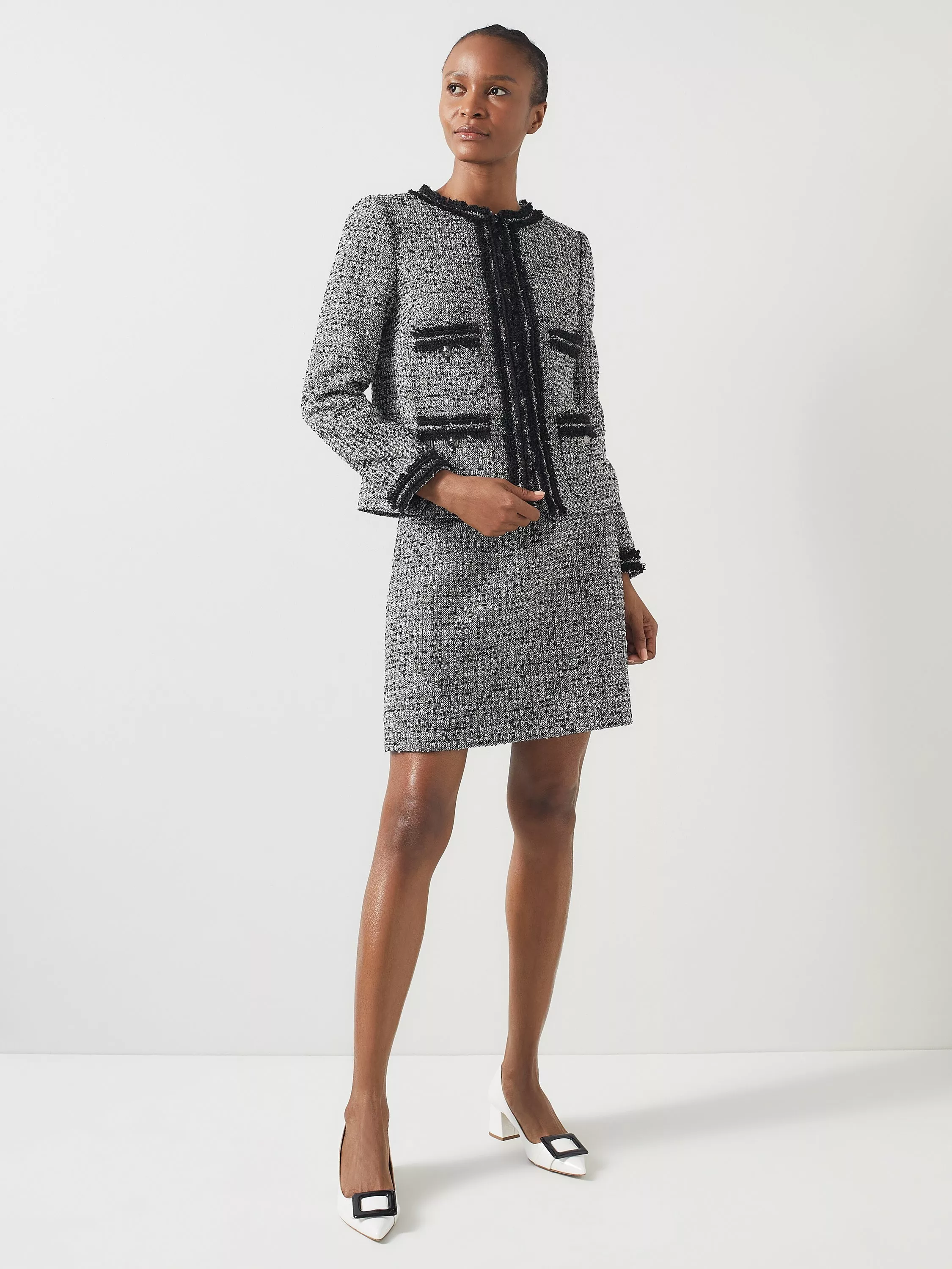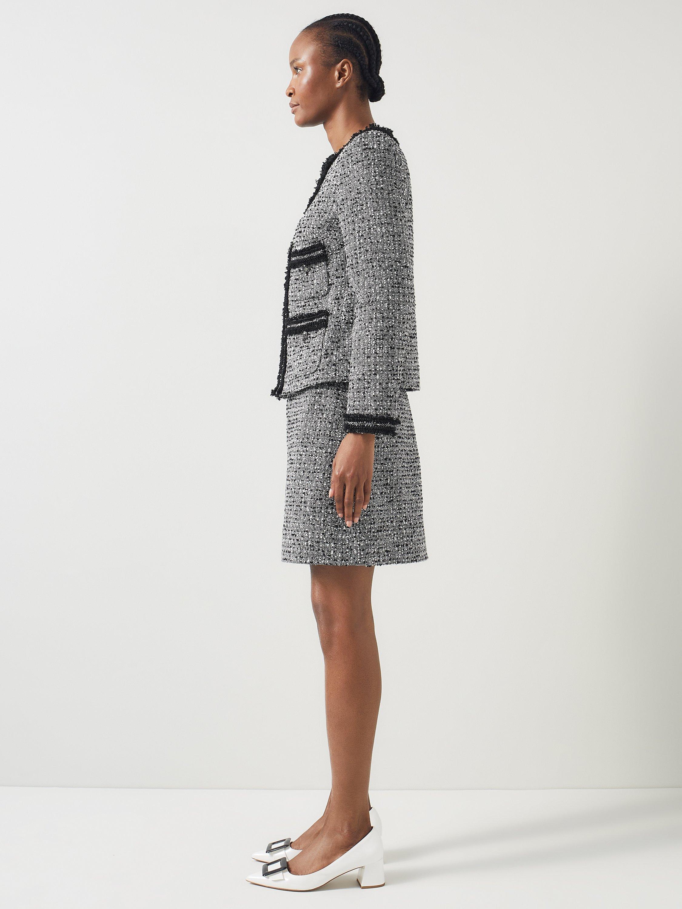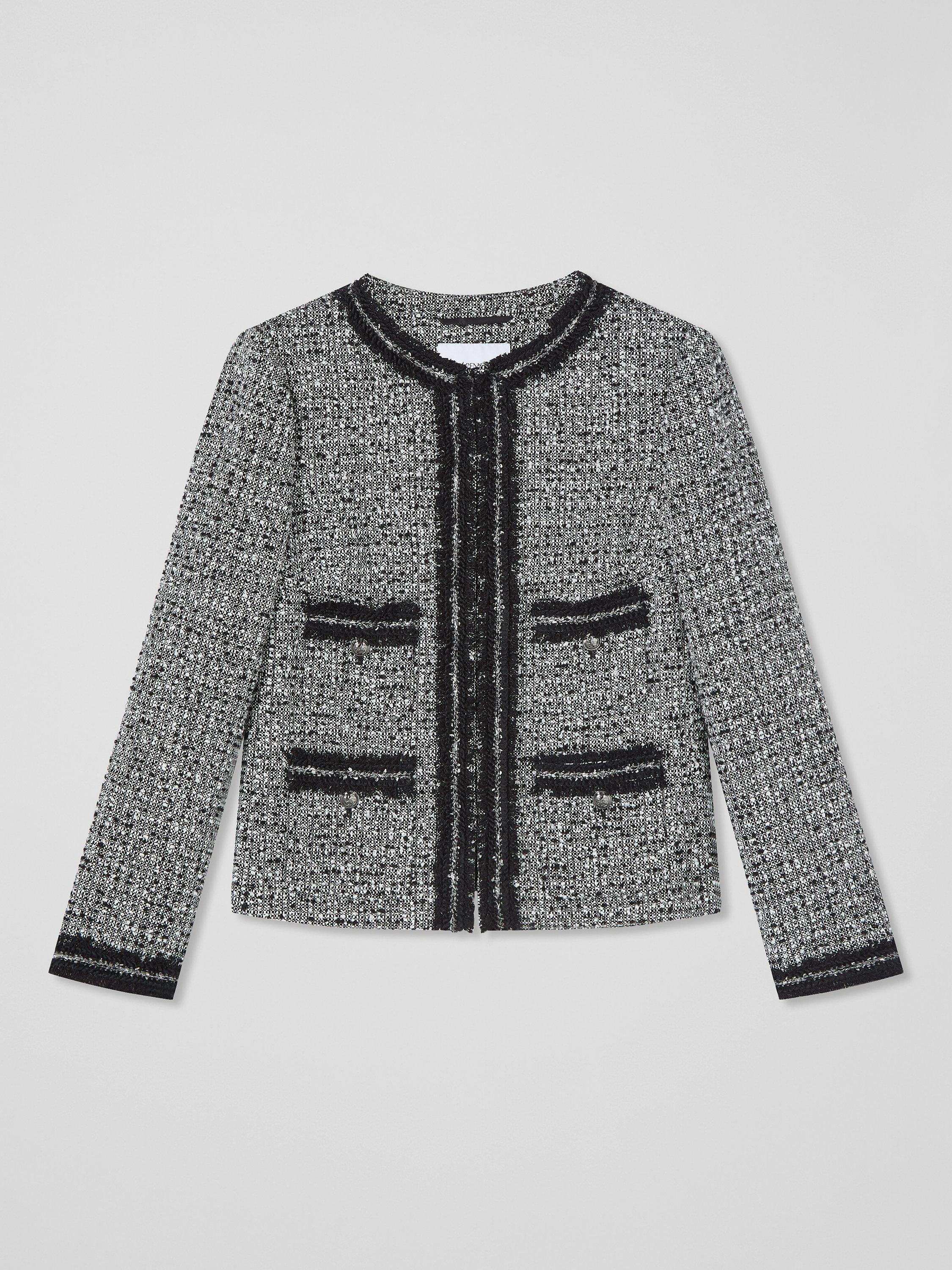 Upgrade your professional wardrobe with the Charlie jacket, made from a premium cotton blend. This collarless design features Italian tweed, chic fringe trims, and crest metal buttons for a refined appearance. Its full length sleeves and sturdy weave ensure comfort, making it ideal over tailored trousers or a sleek dress.