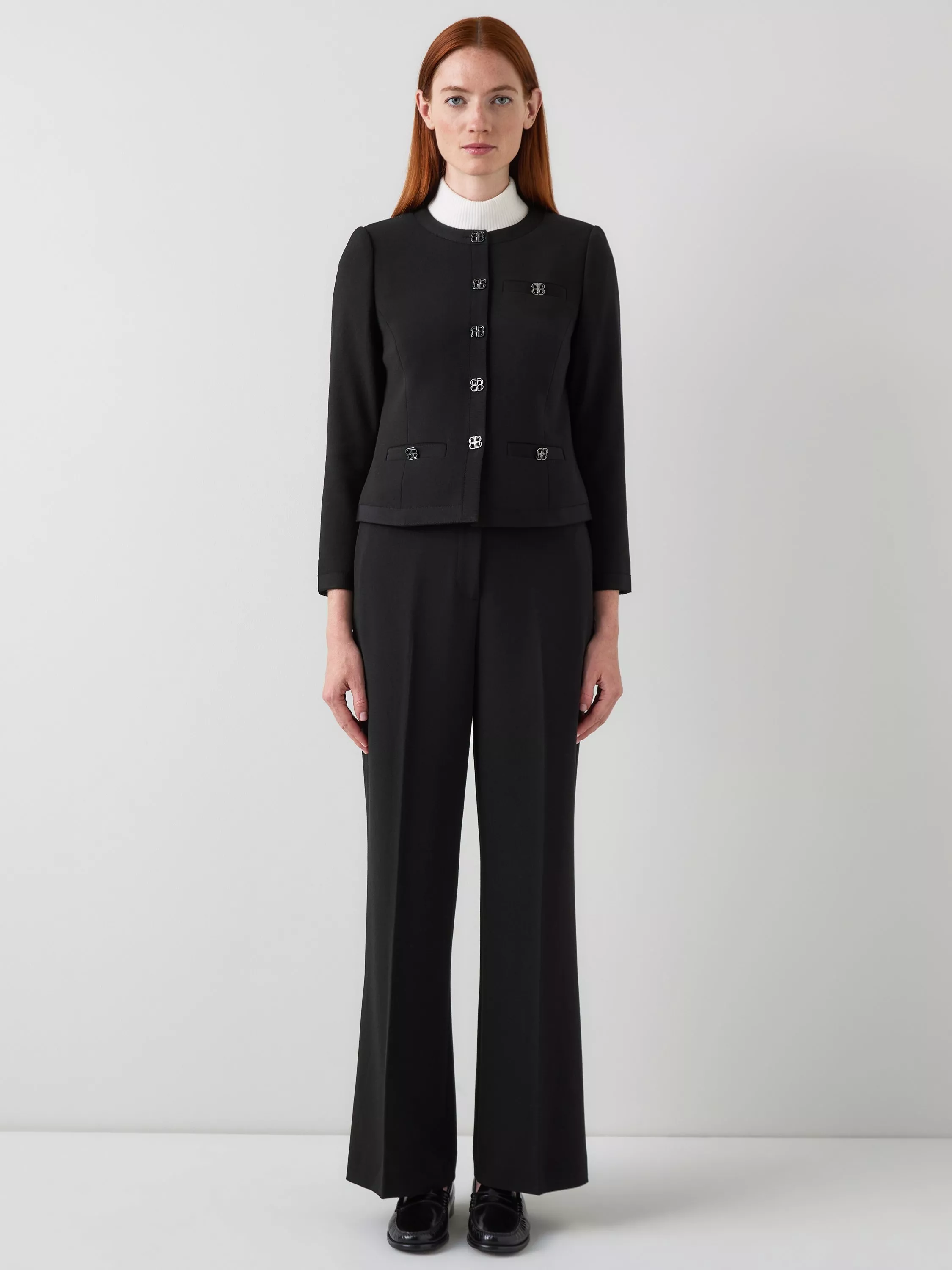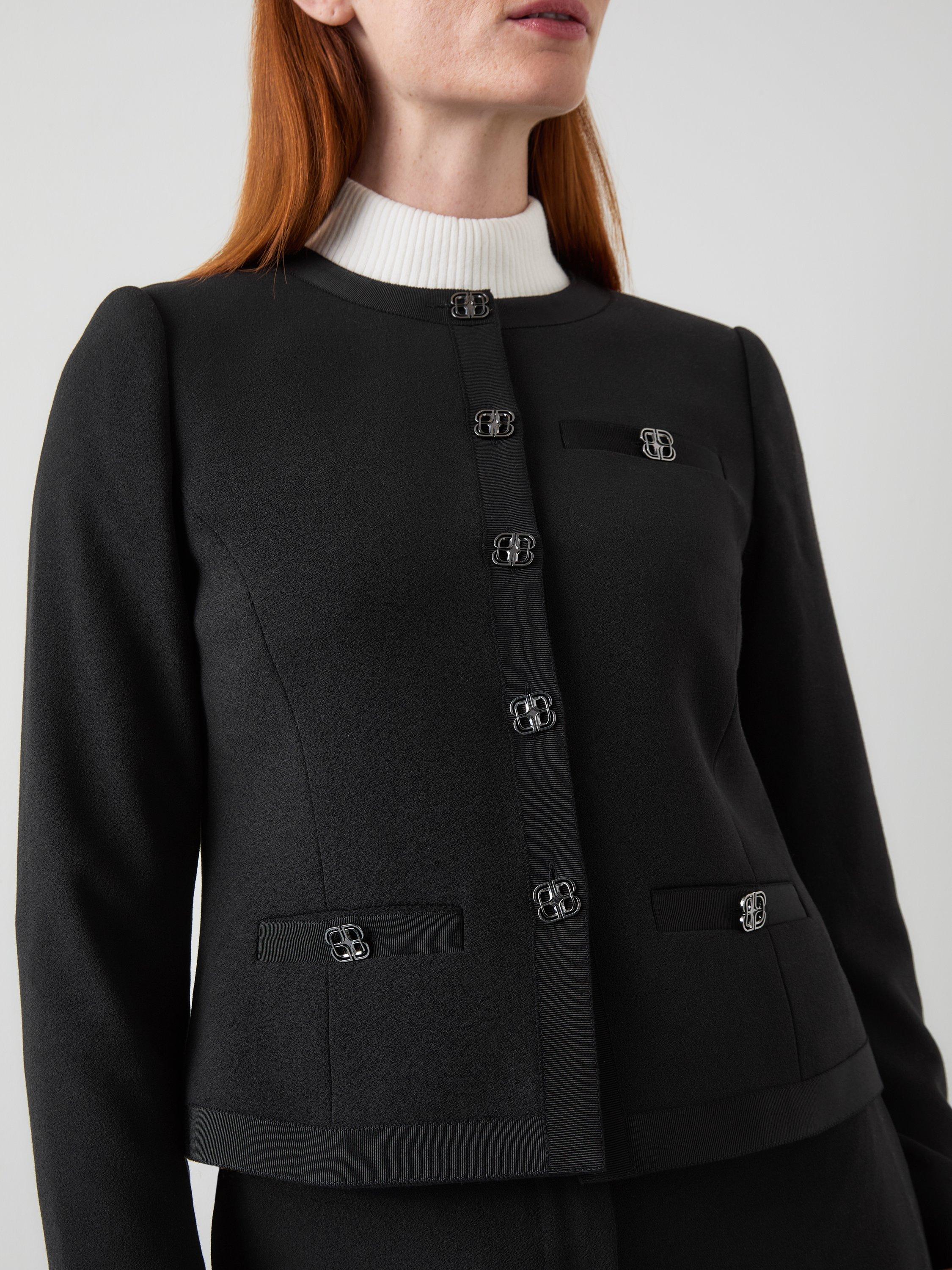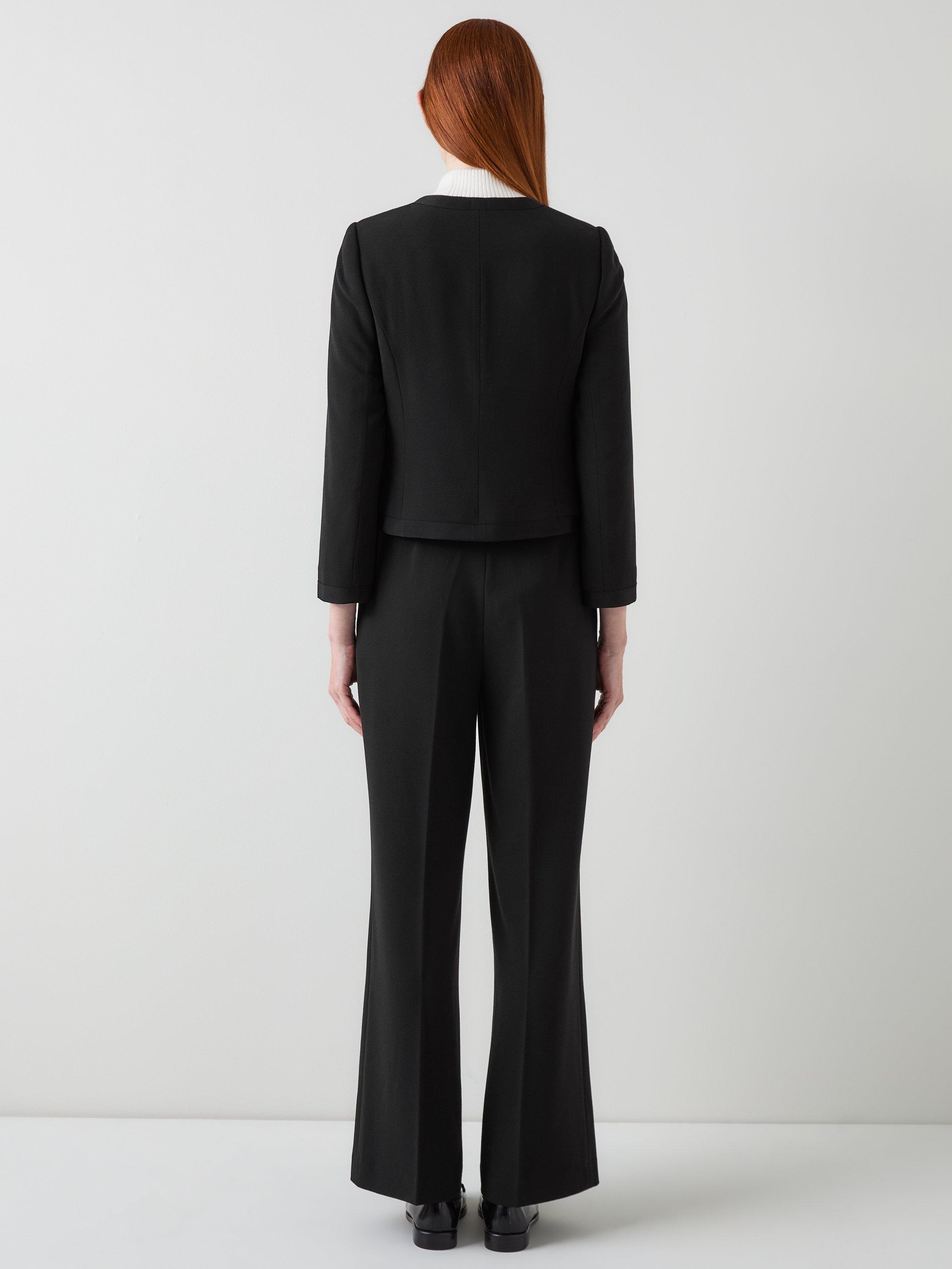 Update your workwear with the Claire jacket. This collarless design features grosgrain trim and signature LKB logo buttons. Made from a stretch crepe blend, it offers comfort and structure for all-day wear. The long sleeves and crew neck create a silhouette that transitions from office to evening. Pair with tailored trousers for meetings or layer over a shift dress for a polished look. The Claire complements smart separates and jeans.