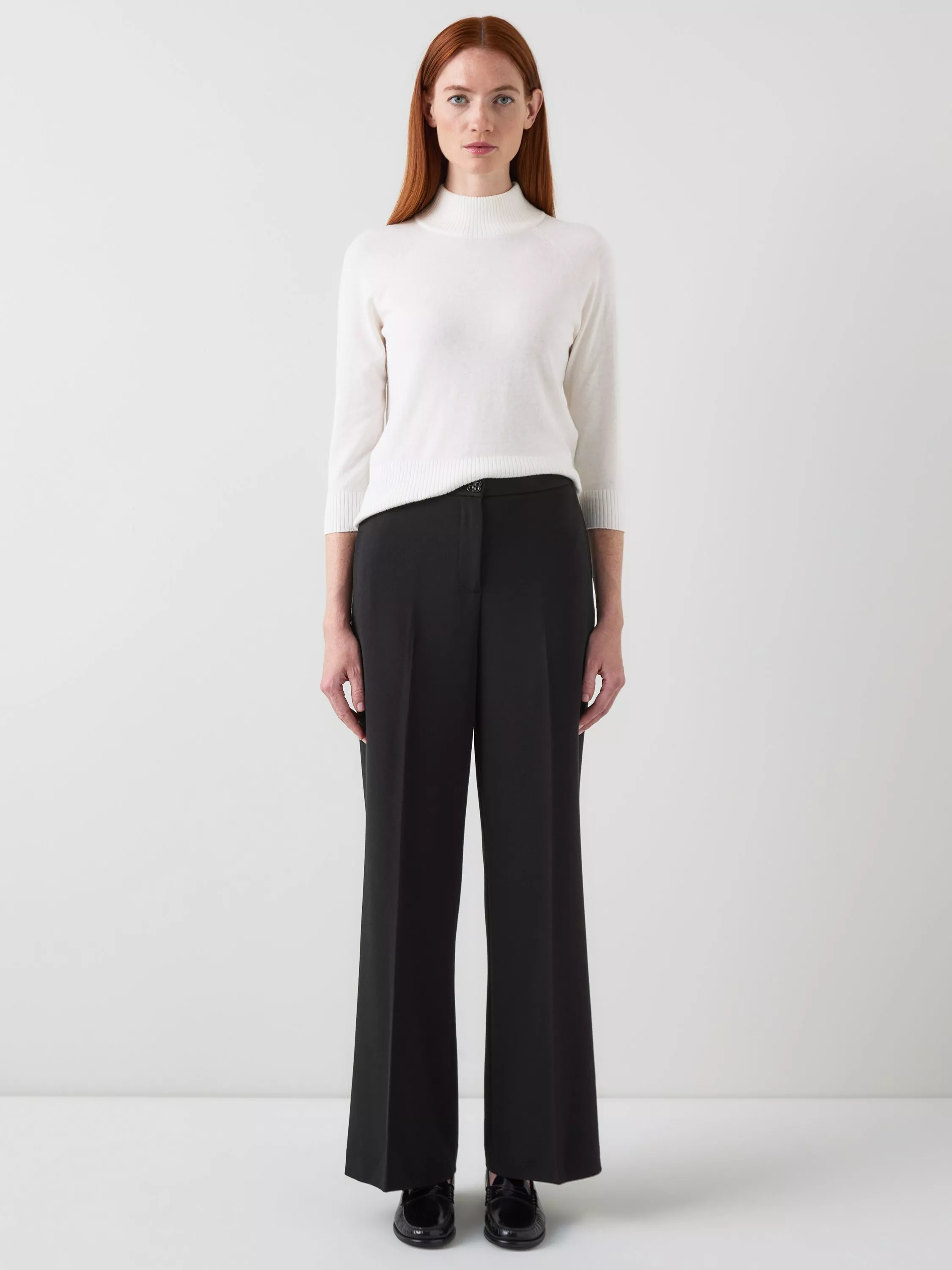 The Claire trouser offers a wide-leg silhouette in stretch crepe. Crafted from a fabric blend with a luxurious stretch fabric, these full-length slacks feature an elegant grosgrain waistband for a refined finish. Perfect for elevating your workwear collection, pair with a tailored blazer for a polished office ensemble or style with a silk blouse for important meetings and professional events.