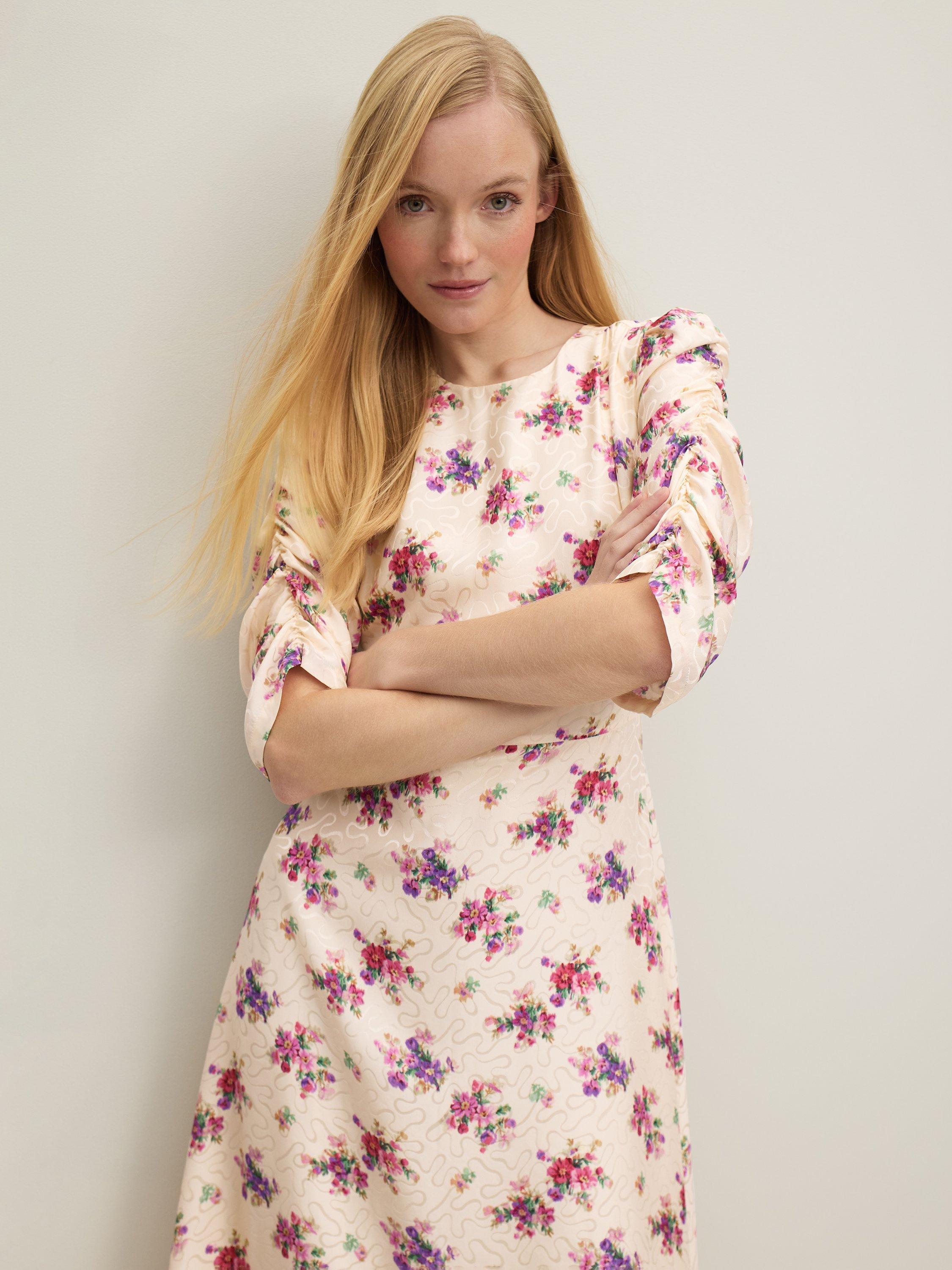 Taking on our love for print, the new Delilah dress in L.K.Bennett's Royal Ascot collection takes on a beautiful vintage design. It's crafted from cream squiggle silk jacquard with a pink and purple bouquet print, which is a reimagination of a French mid 19th century design. It has a round neck, short sleeves with ruching detail, and a floaty, asymmetric midi skirt. Wear it with strappy heels and a coordinating clutch for a day at the races, or dress it down with Mary Jane flats and a basket bag on more relaxed days.
