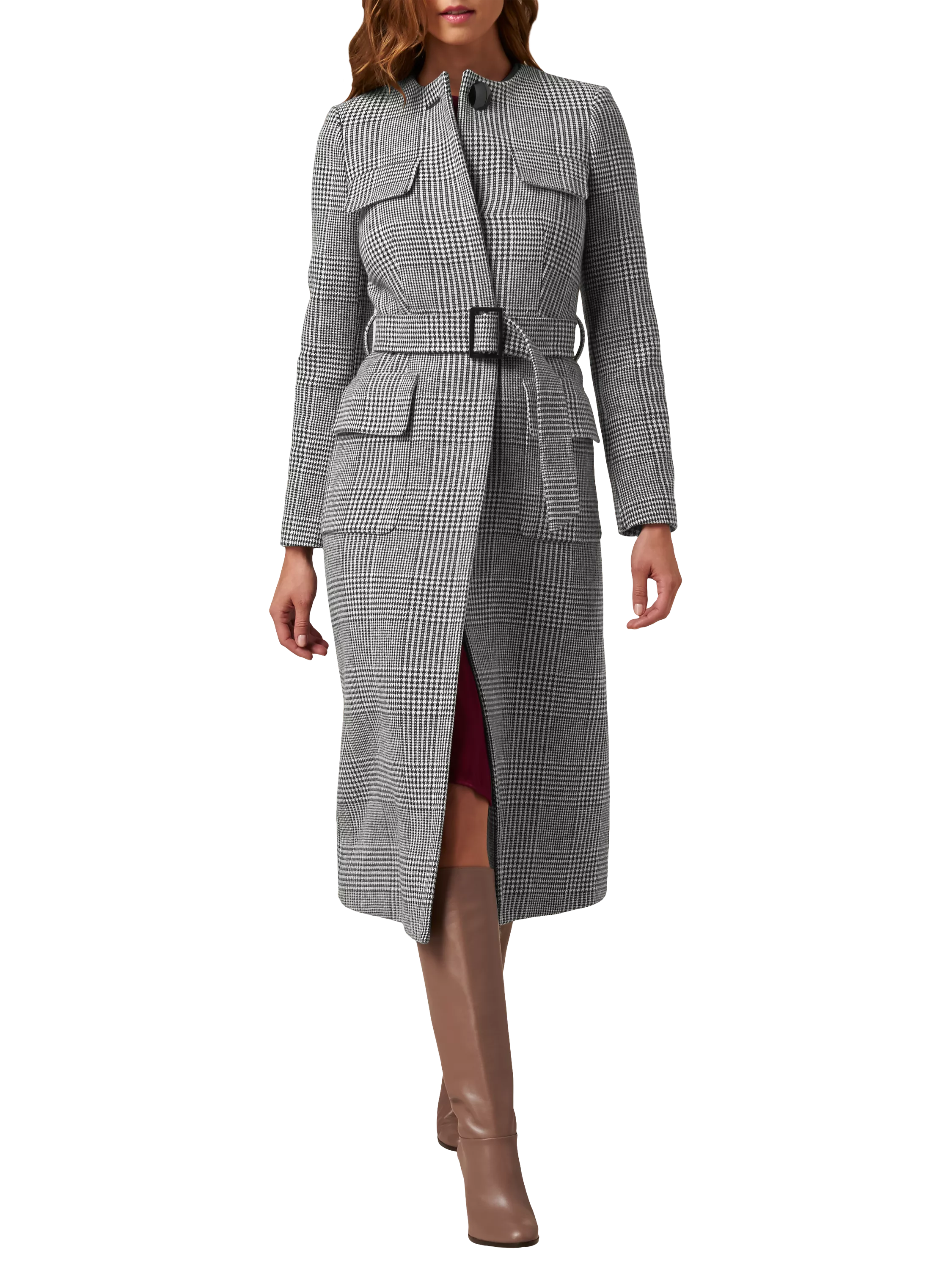 Falling to a mid-calf length, the detachable waist belt provides a flattering shaping accent, while the timeless check print is a key, on-trend style this season.