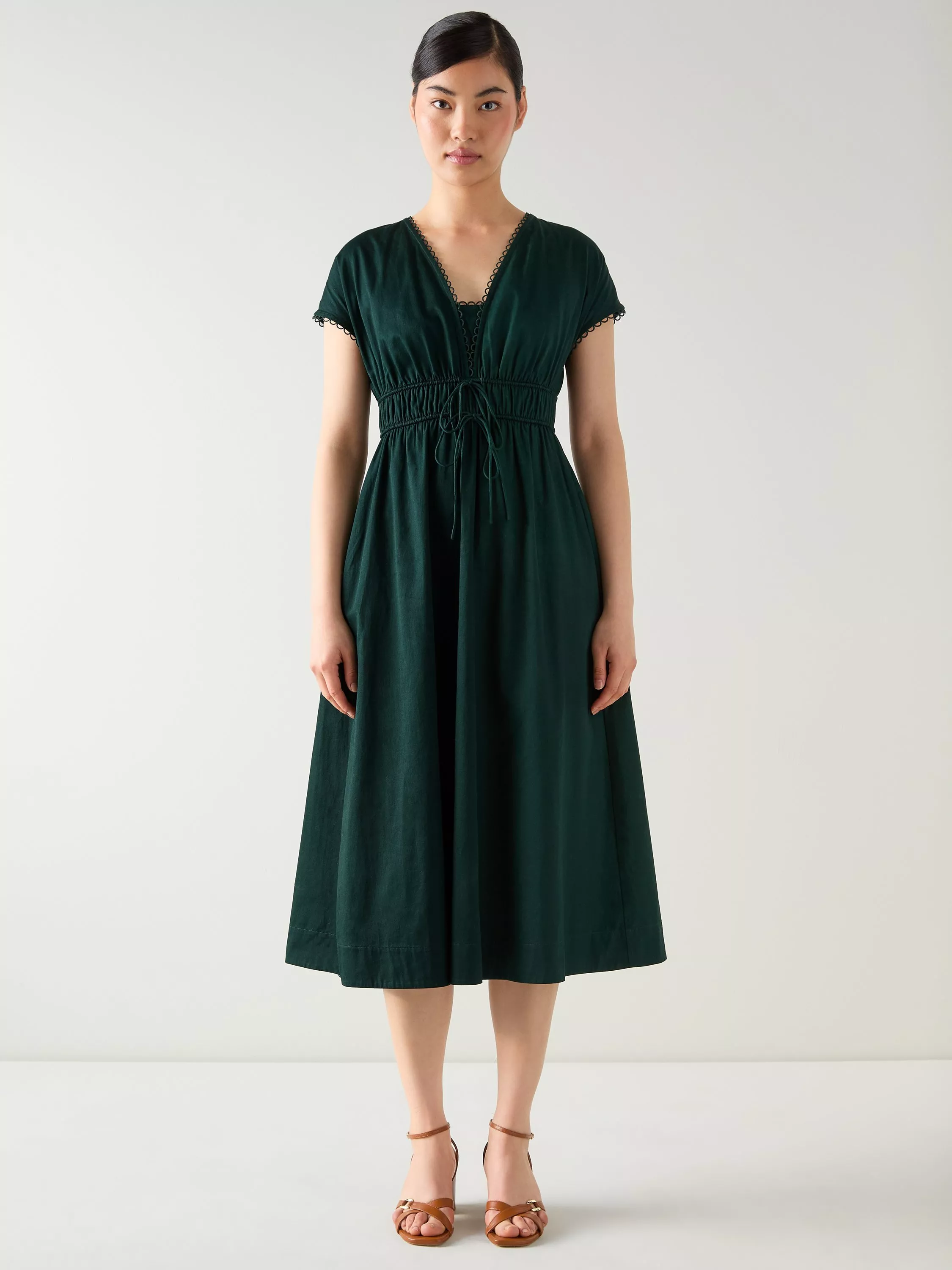 This Emi dress features scallop trim and a tie front in pine grove green cotton. The fit-and-flare silhouette creates a midi length suitable for garden parties or weekend outings with sandals or trainers.
