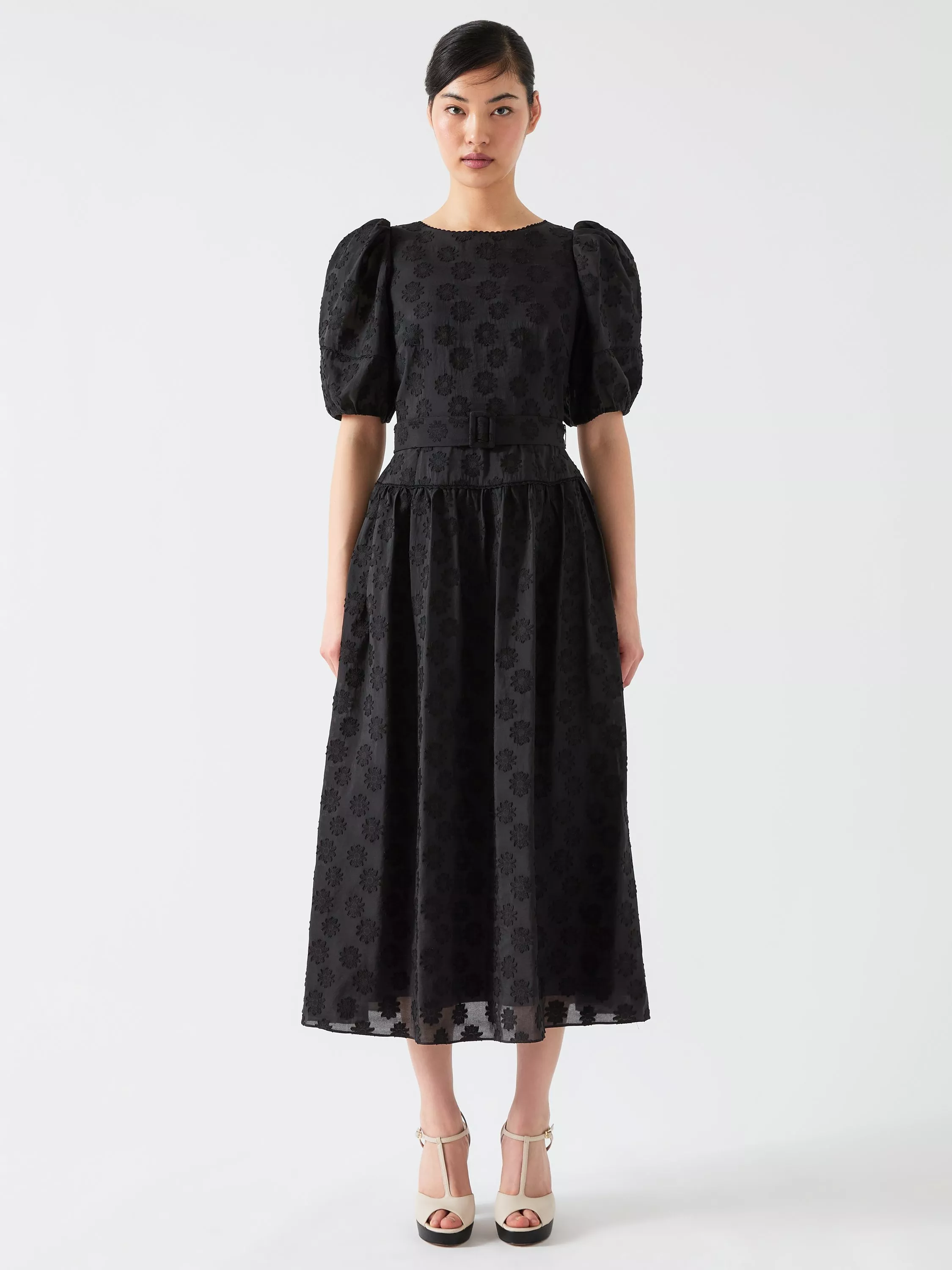 Designed to flatter in a fit and flare shaping, this mid-length dress from L.K.Bennett is a stunning occasion style. With a flattering boat neckline and short puffy sleeves, this style blooms with joy through refreshing floral embroidery.