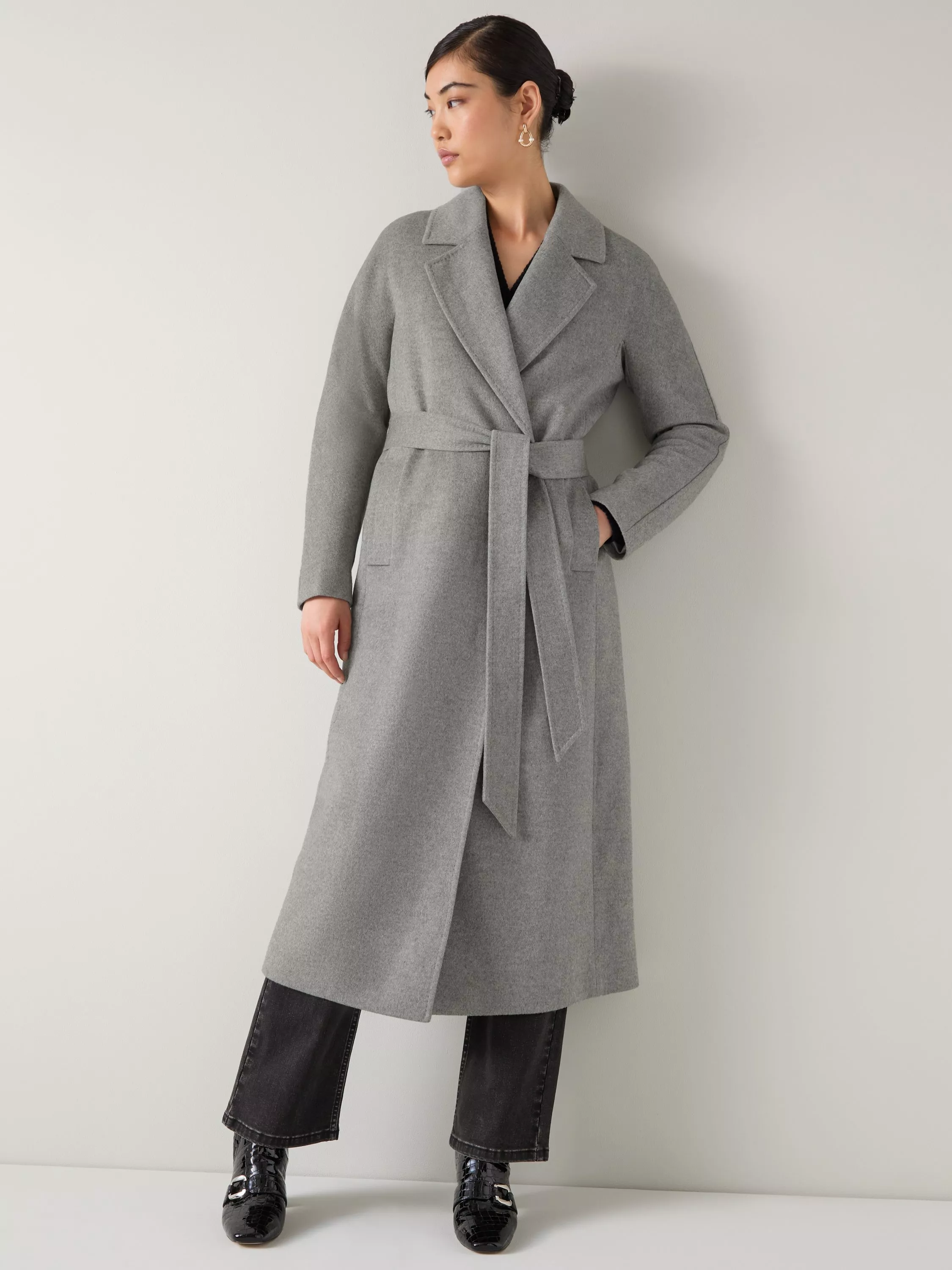 The Francine coat showcases luxurious mule-free merino wool in a beautiful marl shade. This single-breasted maxi-length overcoat features a self-belt to define the waist and a classic collar for timeless appeal. Designed with long sleeves for warmth and comfort, this stylish overcoat transitions effortlessly from workwear to weekend outings. Style with tailored trousers and ankle boots for smart casual occasions or layer over a casual dress for an elevated look.