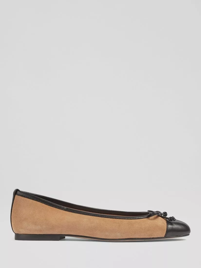 Crafted in Spain from wearable sand suede, this timeless style has a round toe with a black leather toe cap, trim and bow detail, and a sleek silhouette.