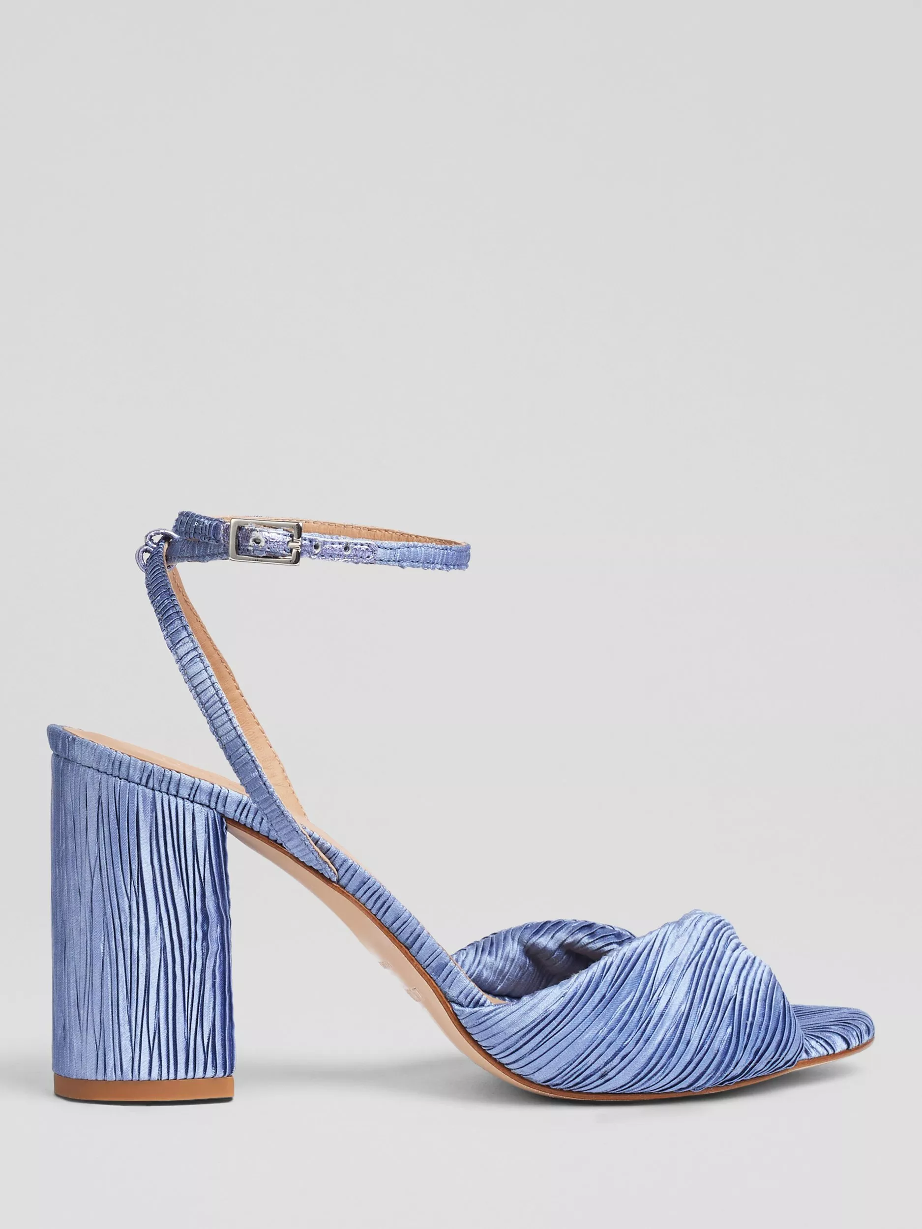 The Lilith twist front sandals in serene blue feature a textured cotton blend upper, leather lining, and a stylish block heel. They are ideal for weddings or special nights out. Pair with an evening gown or tailored trousers for a striking look.