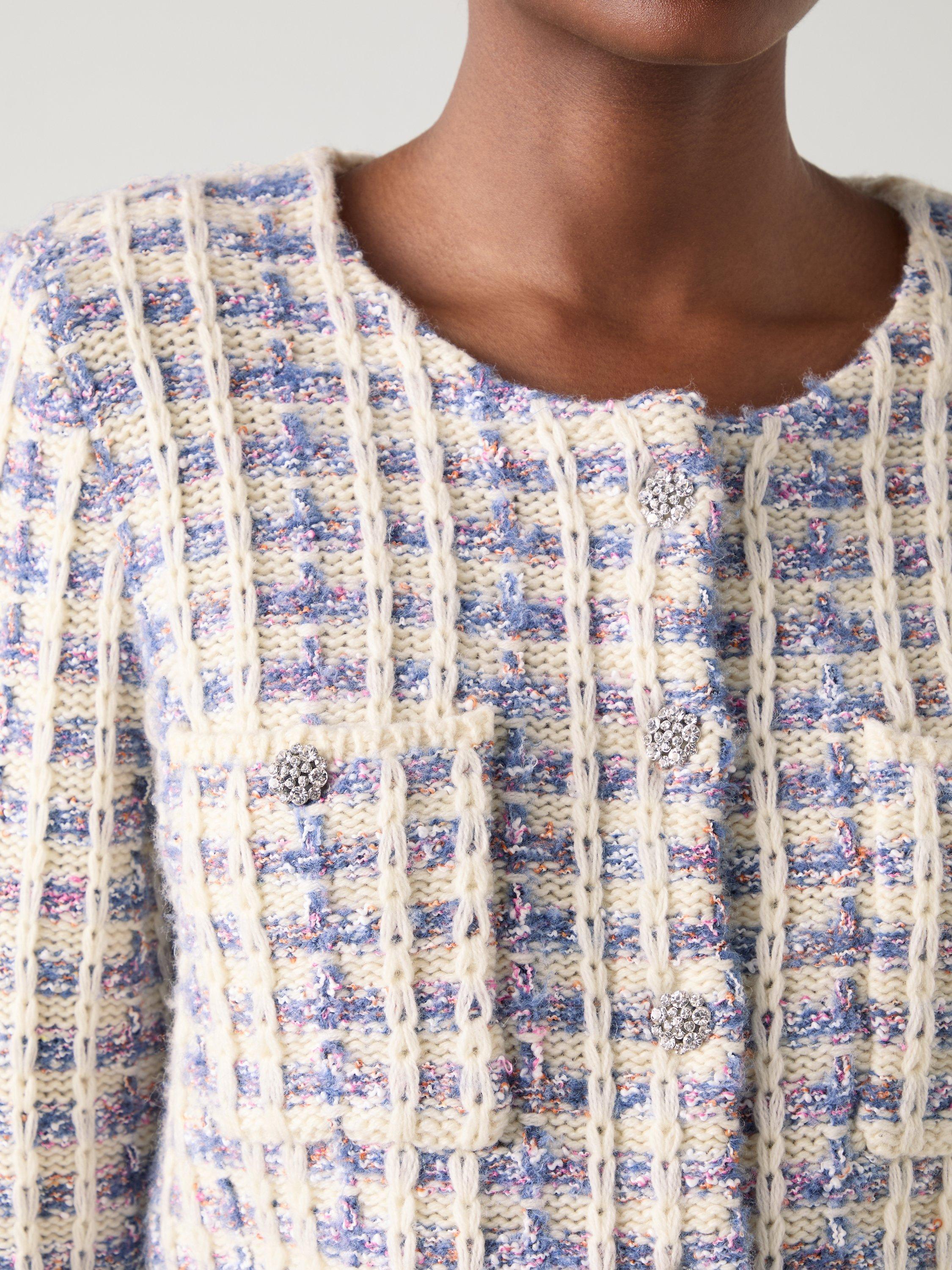 The Millie cardigan brings casual elegance to your everyday look with its textured tweed mix. The standout shoulder pads and sparkling diamante buttons add just the right amount of character to this long-sleeved piece. Its crew neck design and multi-fibre blend make it both cosy and polished. The distinctive tweed texture and fluffy finish give this cardigan a special touch that works for so many occasions.