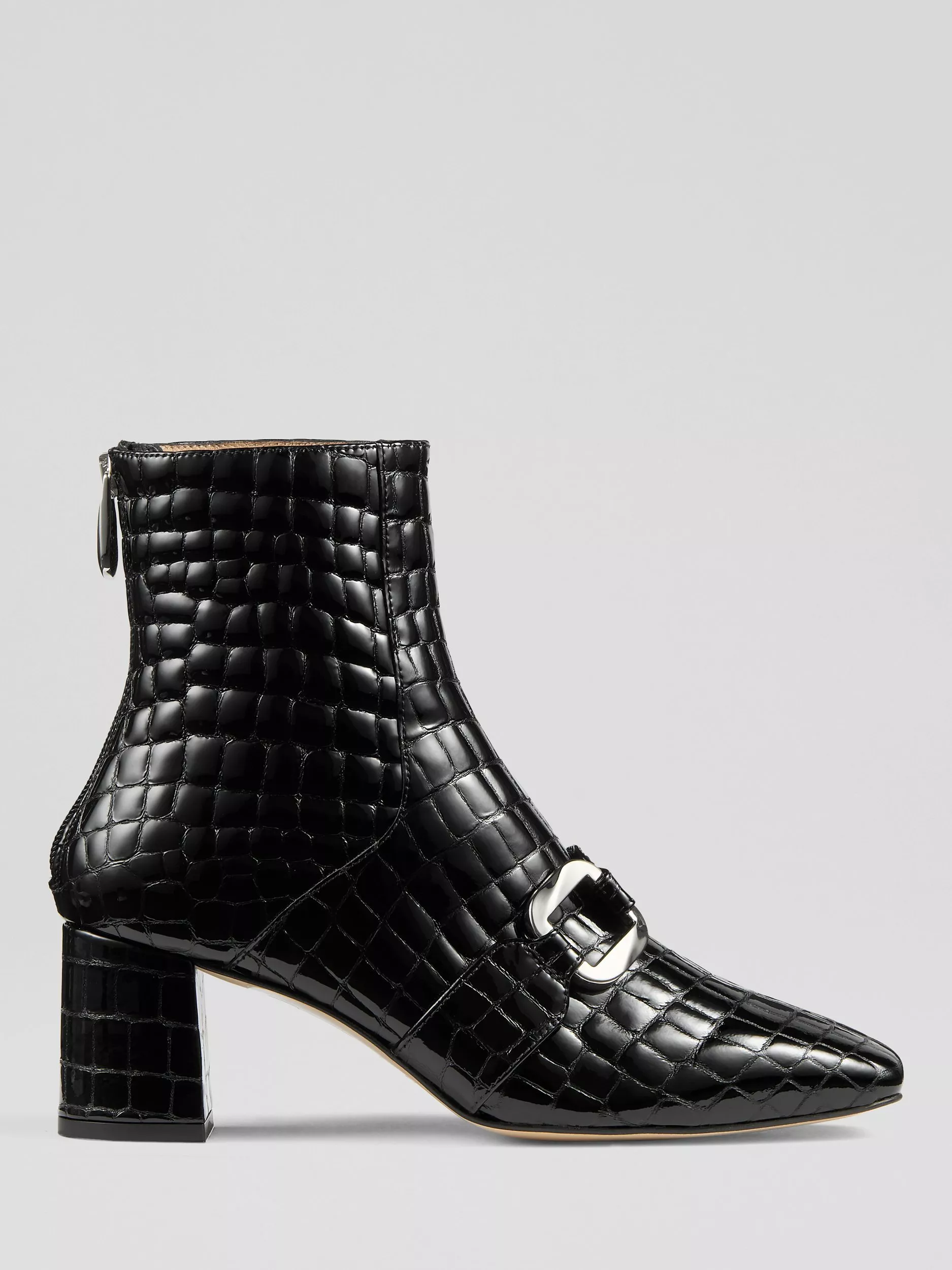 Meet Nadima, Oloid ankle boots that make a statement with every step. Crafted in striking black patent croc texture, these women's booties bring a stylish edge to your wardrobe.