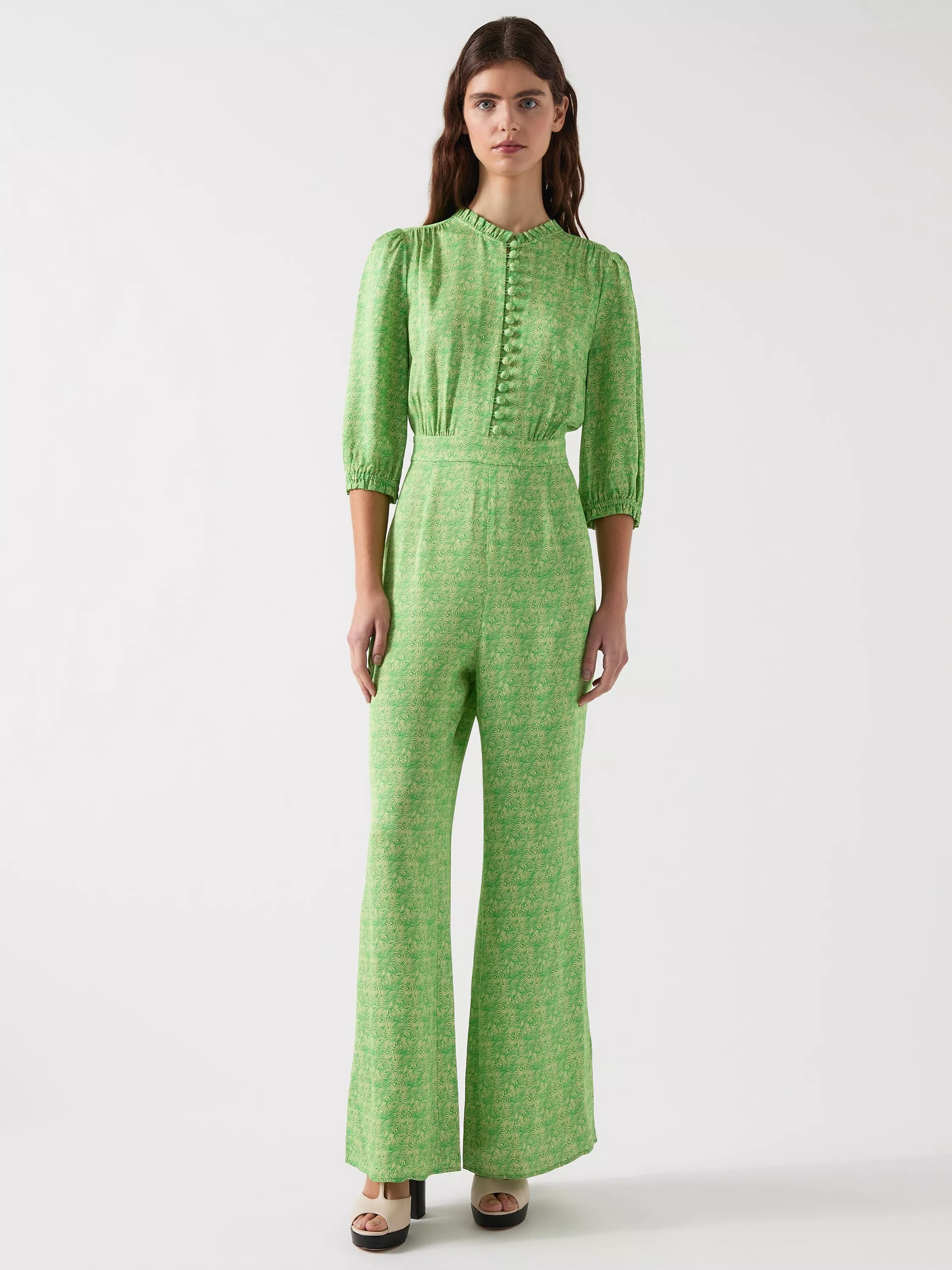 The Naomi jumpsuit features swirling abstract prints on a green satin crepe canvas. This design includes neck and cuff frills complemented by self-covered ball buttons with rouleau loops made from viscose. Ideal for glamorous evenings, pair it with sleek heels and statement earrings for an unforgettable look.