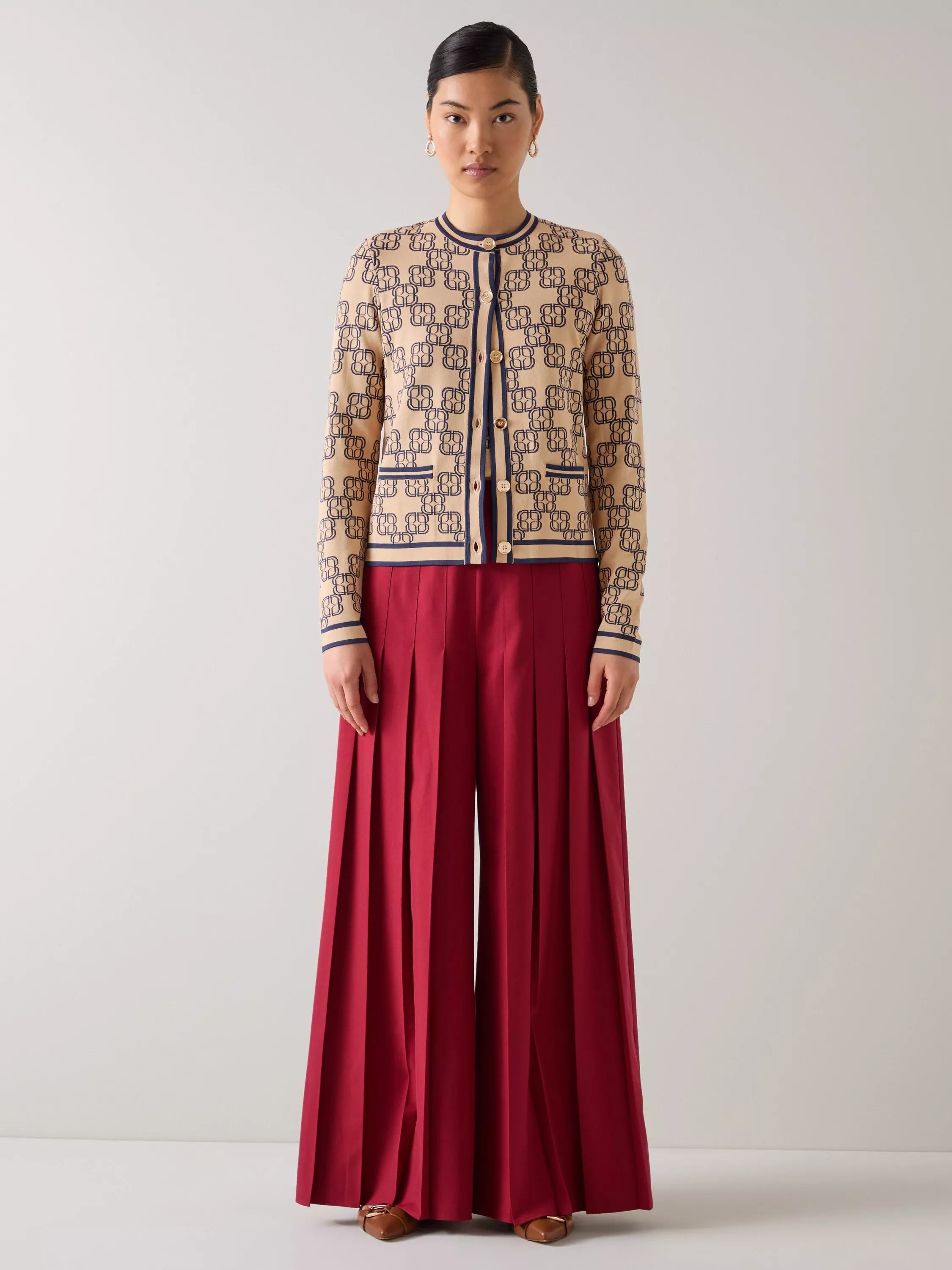 The Odette cardigan showcases the signature LKB monogram. Crafted from a quality fabric blend with a subtle geometric jacquard pattern, this long-sleeved, button-through style features a classic crew neck and cropped silhouette. The intricate in-house logo adds character to this smart casual essential. Layer over a silk camisole with tailored trousers for work, or pair with your favourite jeans and ankle boots for an elevated weekend look.