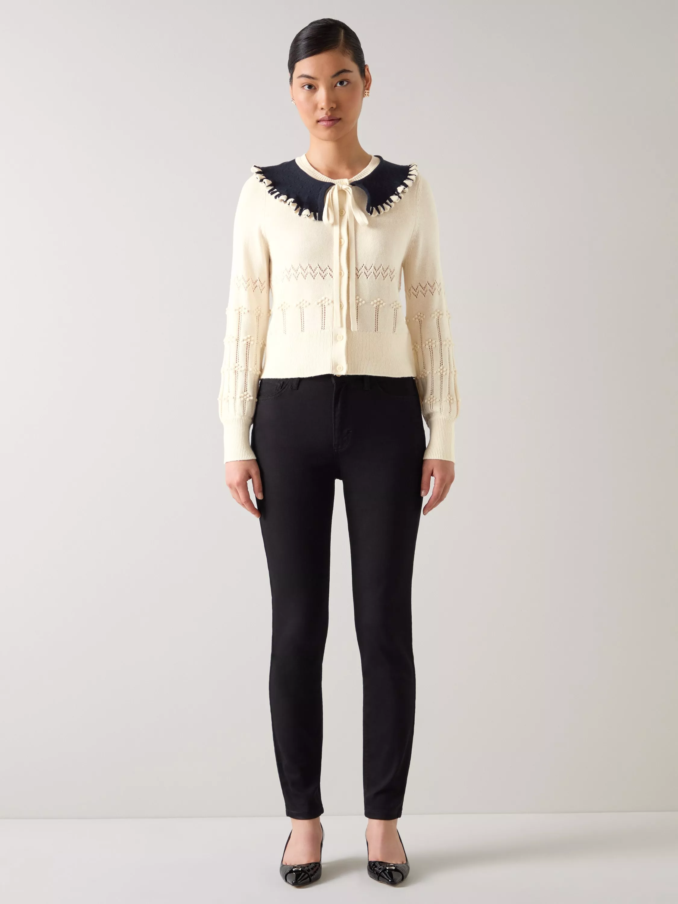 Meet the Olivia Frill Collar Cardigan. A masterpiece of design and comfort that redefines everyday elegance. Every detail has been thoughtfully curated. The delicate pointelle knit pattern creates a subtle texture that invites touch and admiration. At the neckline, a frill collar adds a whisper of romance, framing your face with effortless charm. The contrast edging highlights the silhouette, providing a sleek finish that elevates your look from simple to stunning.