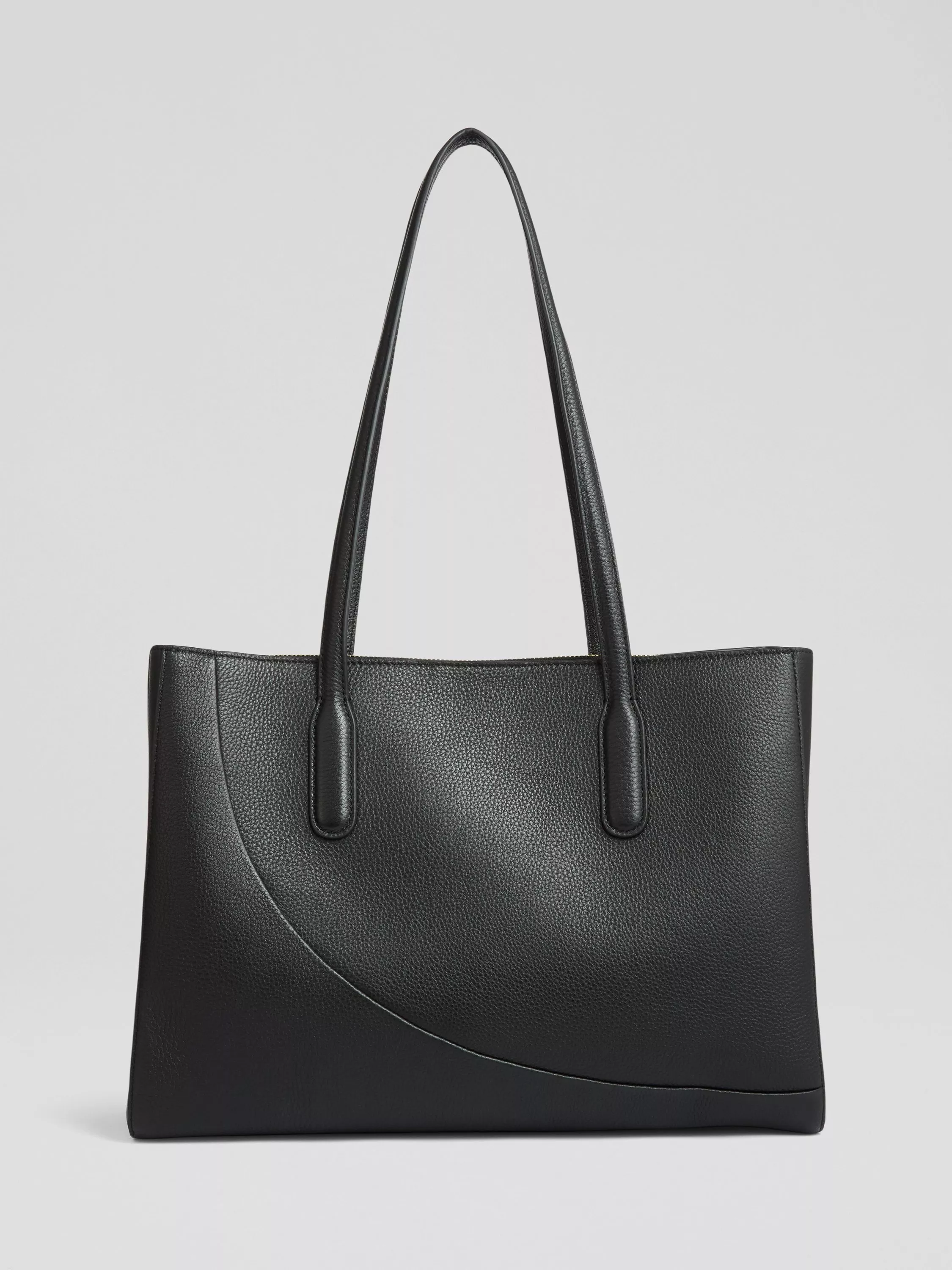 The Olivia tote, designed in rich black grained leather, features a zipped central compartment, two magnetic closure sections and cotton lining. The bag exudes elegance for your workday ensemble. Great for the office or a dinner date, it pairs effortlessly with tailored suits for a refined appearance.
