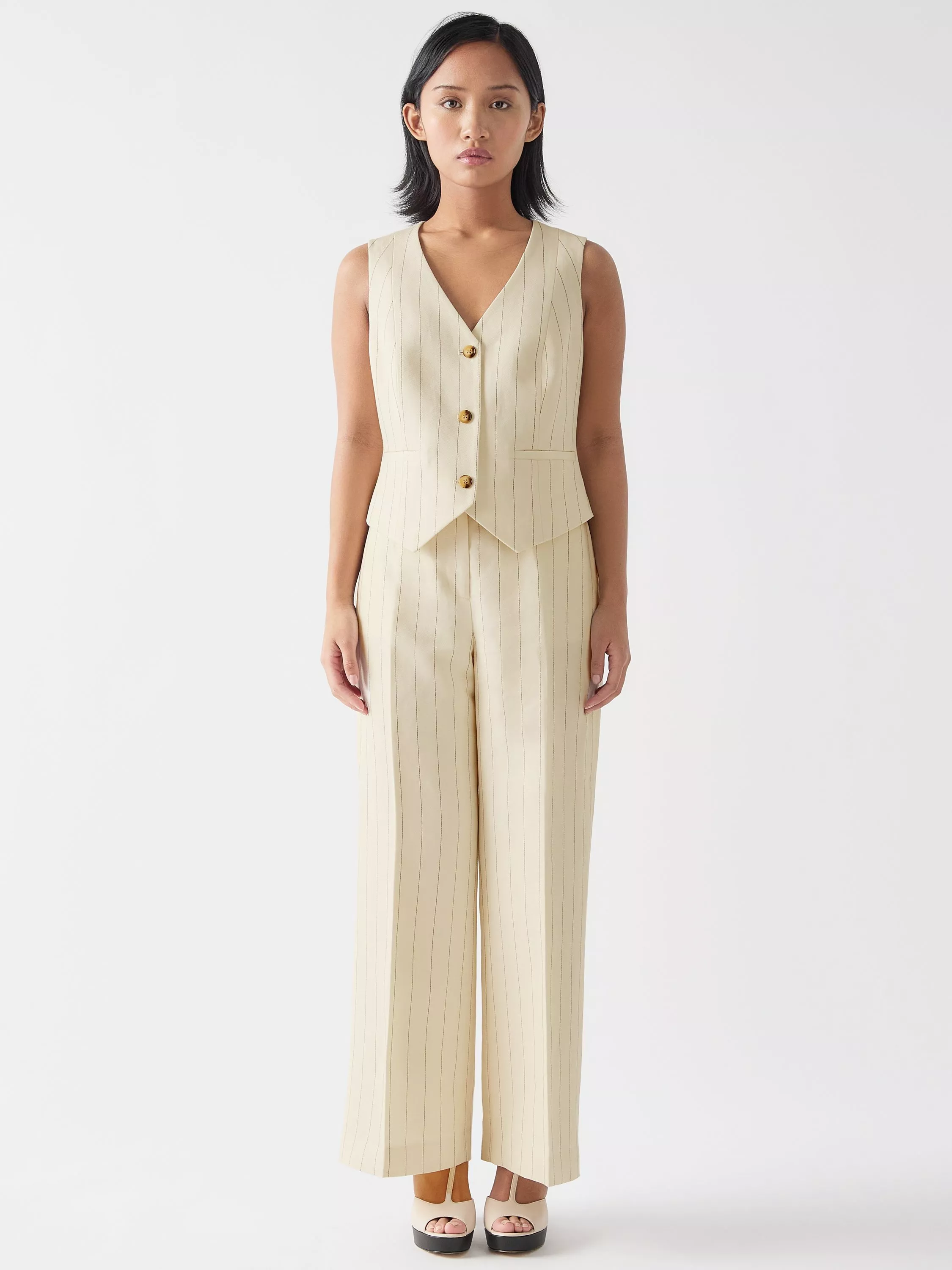 The Ami petite pinstripe waistcoat offers timeless elegance. This cream and ivory linen blend features pinstripes, faux mock horn buttons and a back tie. It's versatile, ideal paired with tailored trousers for work or a flowy skirt for a relaxed look, suitable for office meetings or weekend brunches.