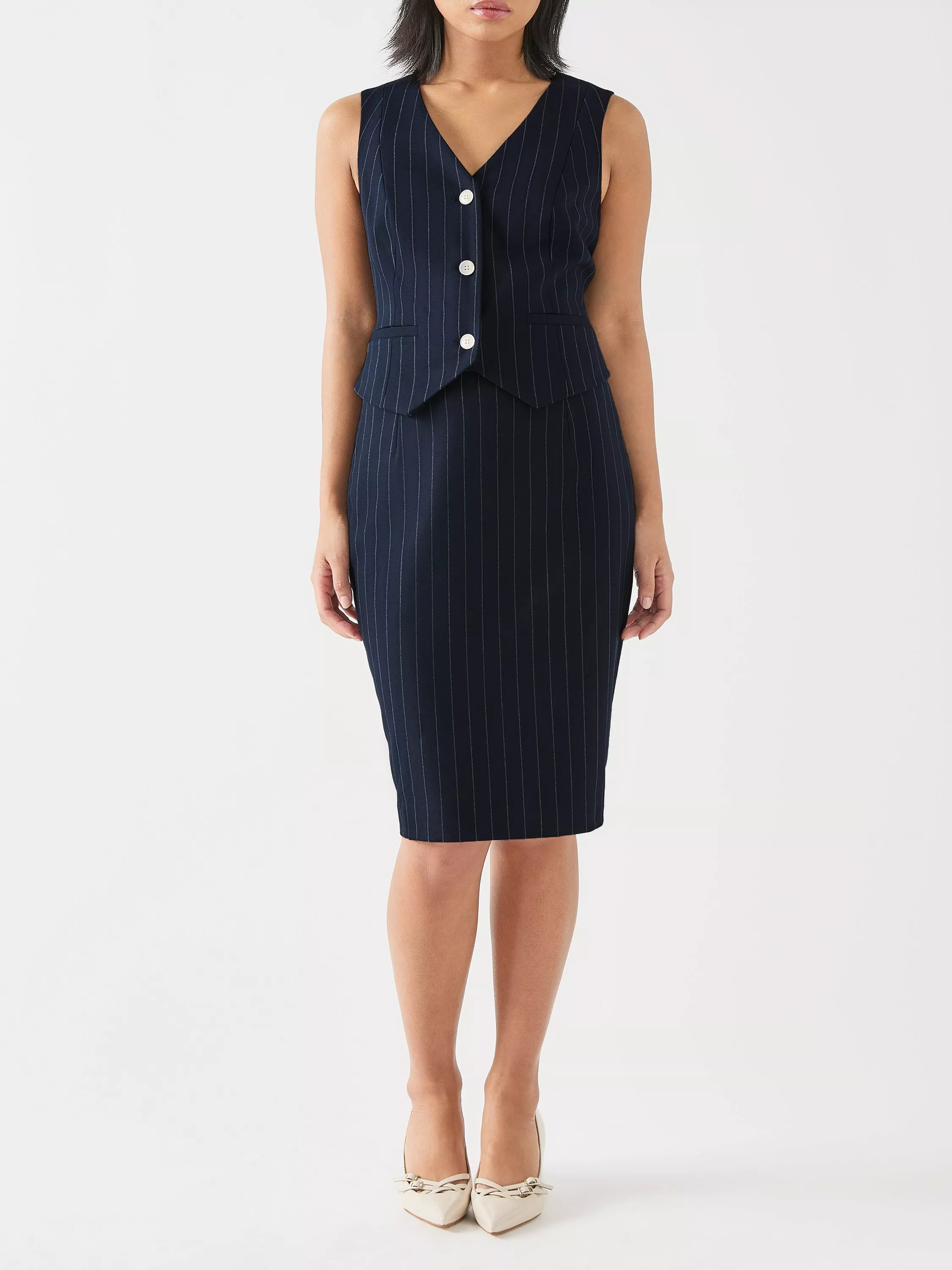 The Bella petite skirt offers sophisticated elegance. This wool-blend pencil skirt, adorned with a chic pinstripe, combines classic workwear charm with modern flair. Perfect for the office or evening events, pair it with a crisp blouse or a fitted blazer for a polished look that transitions effortlessly.