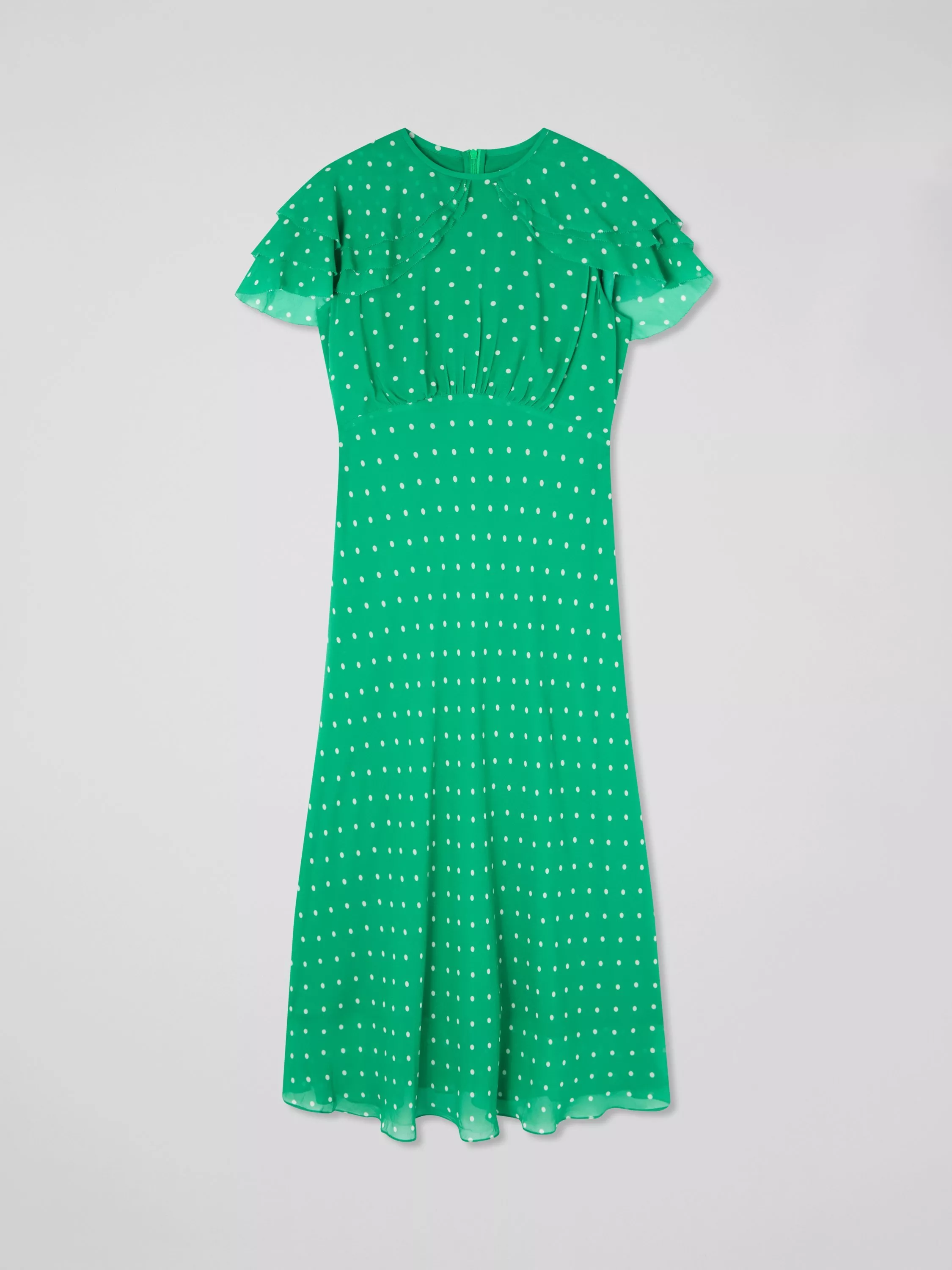 The Ellen petite dress combines vintage charm and modern flair. In lush green, this viscose piece features a polka dot print, ruffle collar, and flattering fit-and-flare silhouette. Ideal for weddings, garden parties, or special dinners, pair it with classic heels or statement jewellery for a head-turning look.