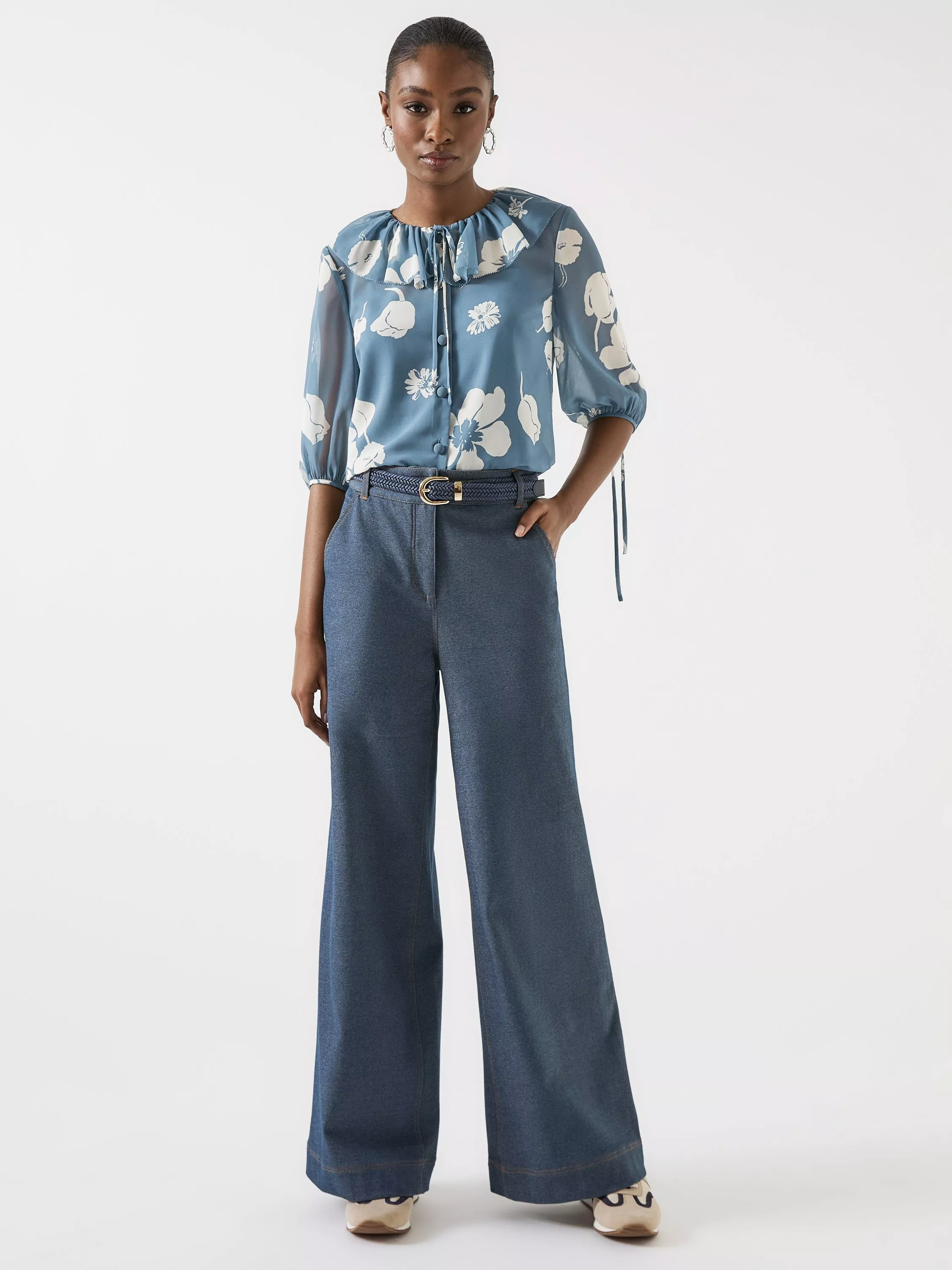 Showcasing a smart-casual look, the Rumi blouse features a frill neckline and picot edge details in a China Blue and Birch block print with a tie front. It comes with a removable cami for versatile styling. Pair with tailored trousers for work or denim for weekends.