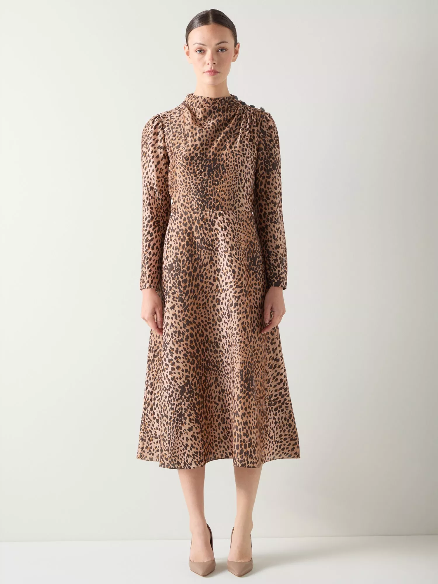 The Samantha dress showcases a signature in-house leopard print on a luxurious silk blend fabric. This midi-length design features elegant gathered shoulder detail with dome metal shank buttons and elegant sleeves, all finished with a flattering funnel neck. Perfect for smart casual occasions, style with ankle boots and gold accessories for daytime events, or dress up with strappy heels and a clutch for an elegant evening look.