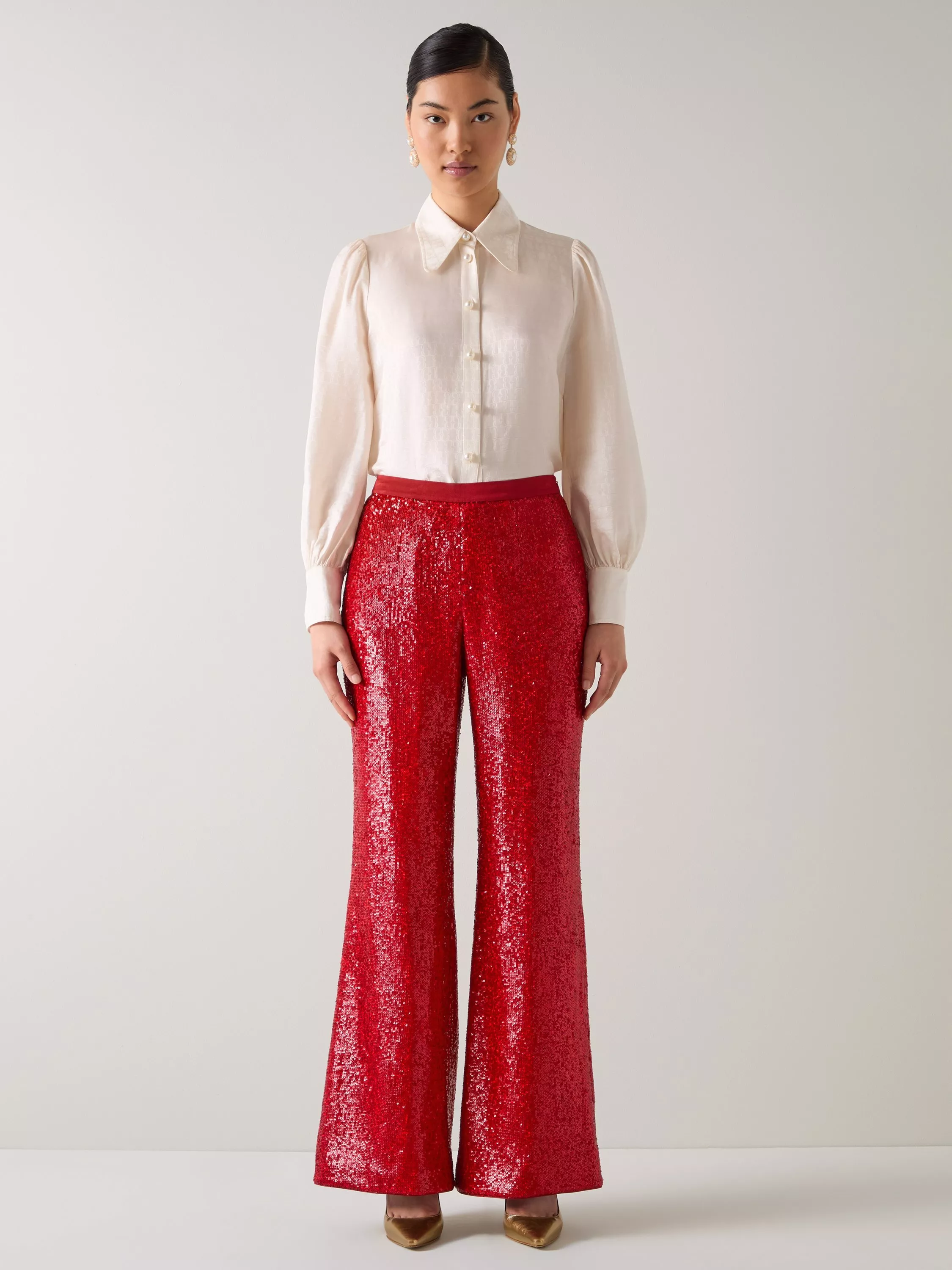 Crafted with sequins, these full-length trousers offer a wide-leg flare silhouette with just the right stretch for comfortable movement. Perfect for evening soirées and special occasions, these high-waist Shimmer trousers bring effortless glamour to your wardrobe. Style them with a silk camisole and strappy heels for a balanced look.