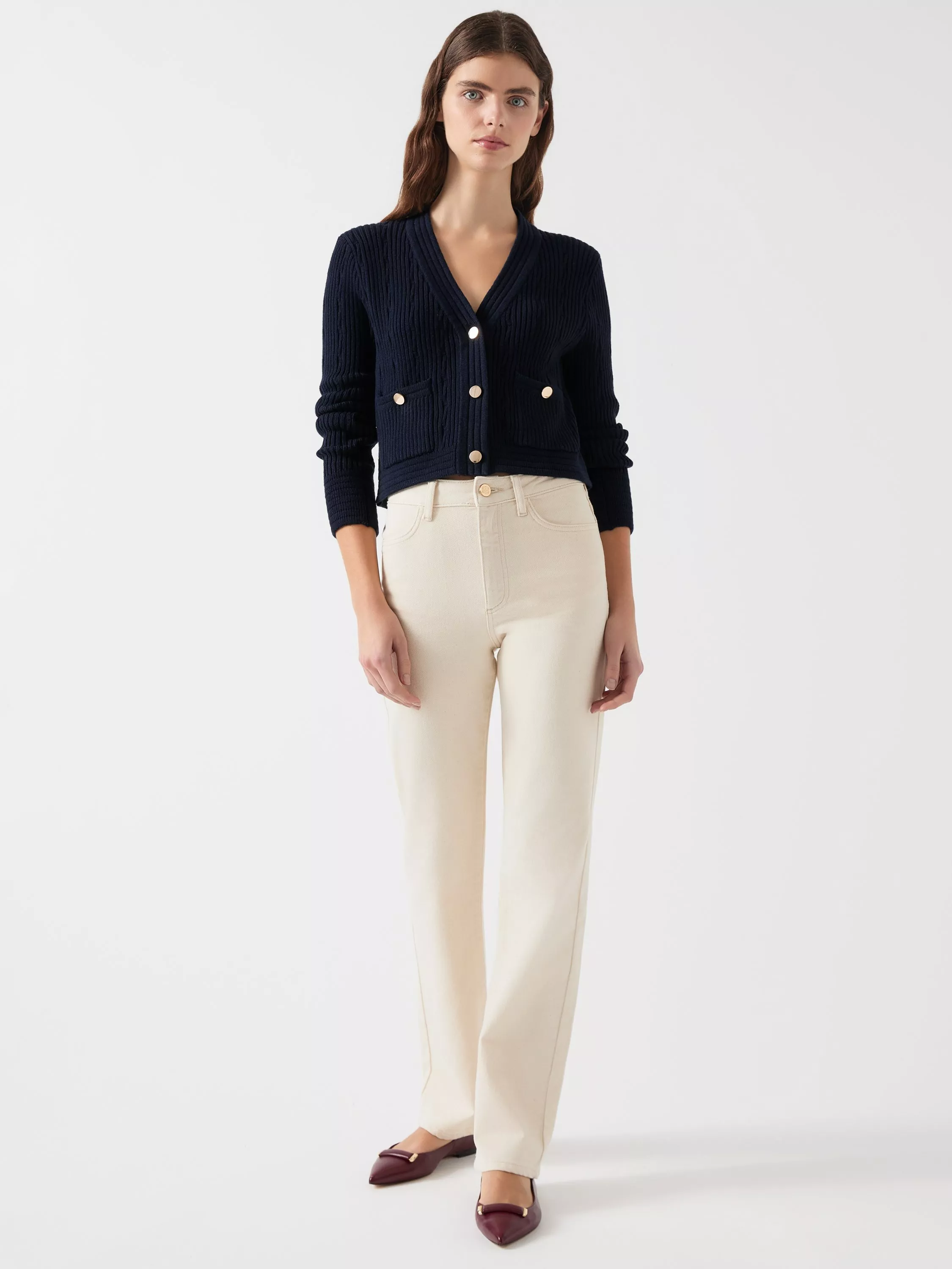 The Shona cardigan, in a sophisticated hue, is crafted from a luxurious cotton mix, featuring striking shoulder pads and gleaming metal buttons that capture the new trend effortlessly. Ideal for smart casual occasions, this V-neck, waist-length piece pairs beautifully with tailored trousers or a stylish midi skirt for a polished ensemble.